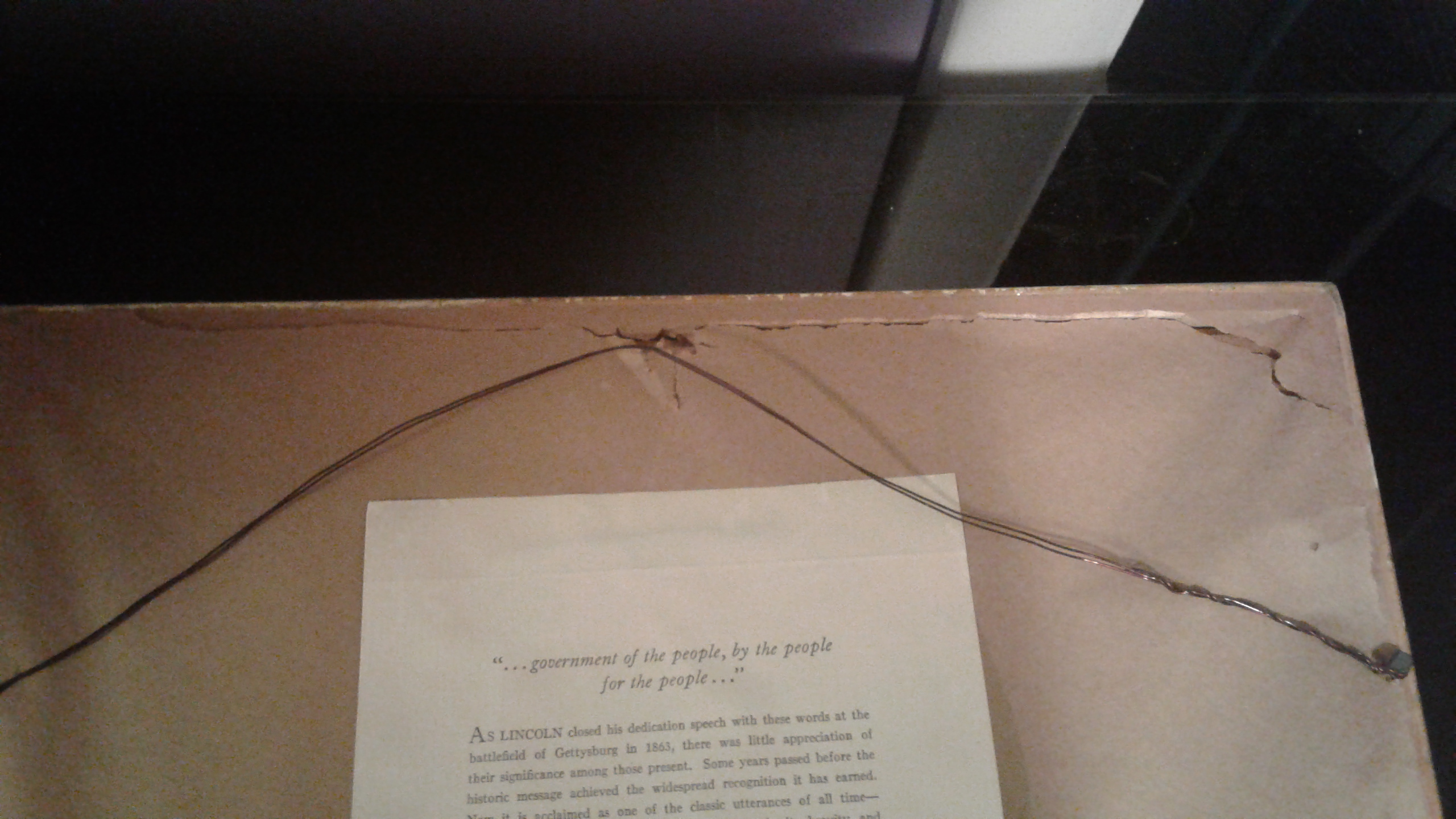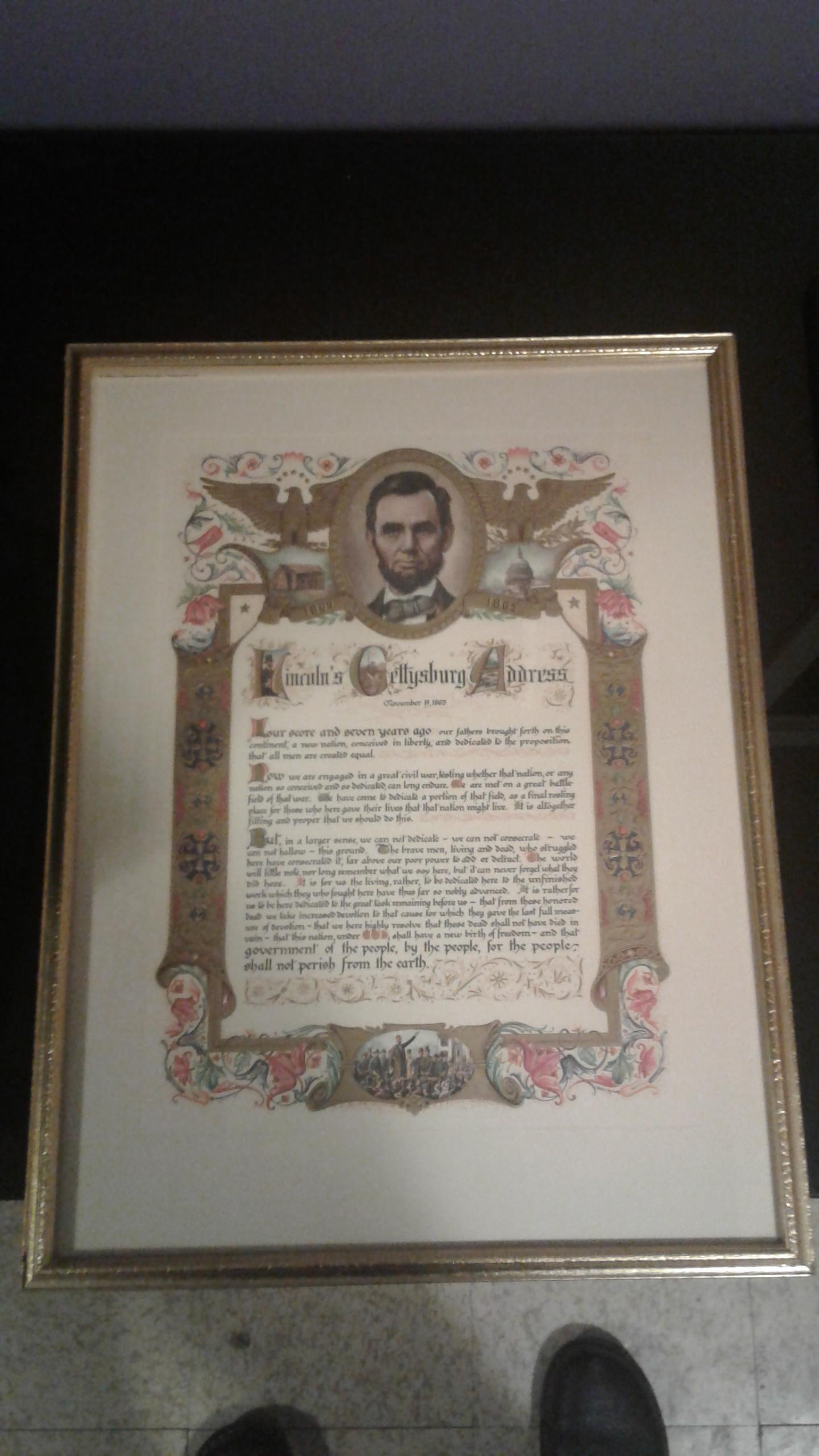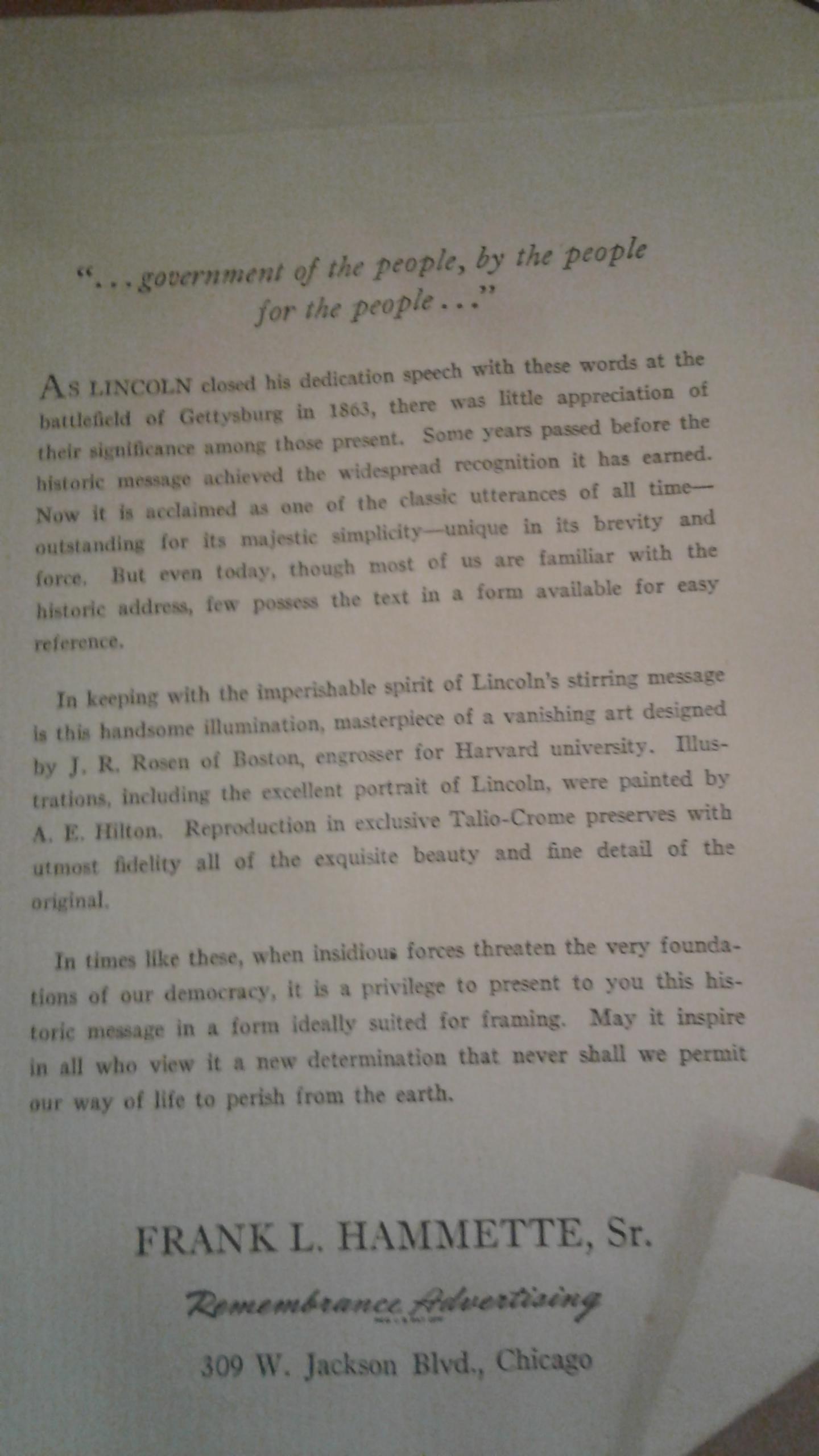 There is a piece of paper glued to the back with info about the Gettysburg Address. At the bottom it has the name Frank L. Hammette, Sr. with an address below his name.