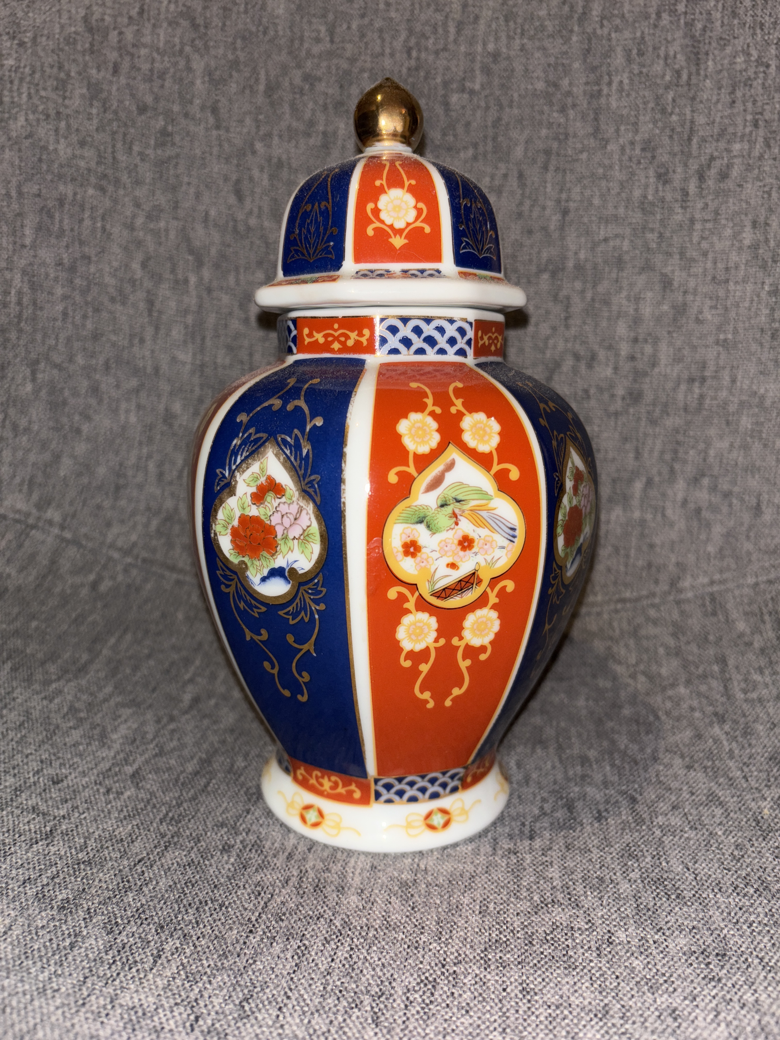Physical Description: This ginger jar stands approximately 8 inches tall and features a vibrant blue and red color palette. The jar is adorned with intricate floral and geometric designs, typical of traditional Asian porcelain. The lid is topped with a gold-colored finial, adding an elegant touch. The jar's body is divided into panels showcasing various motifs, which are characteristic of the Imari style.