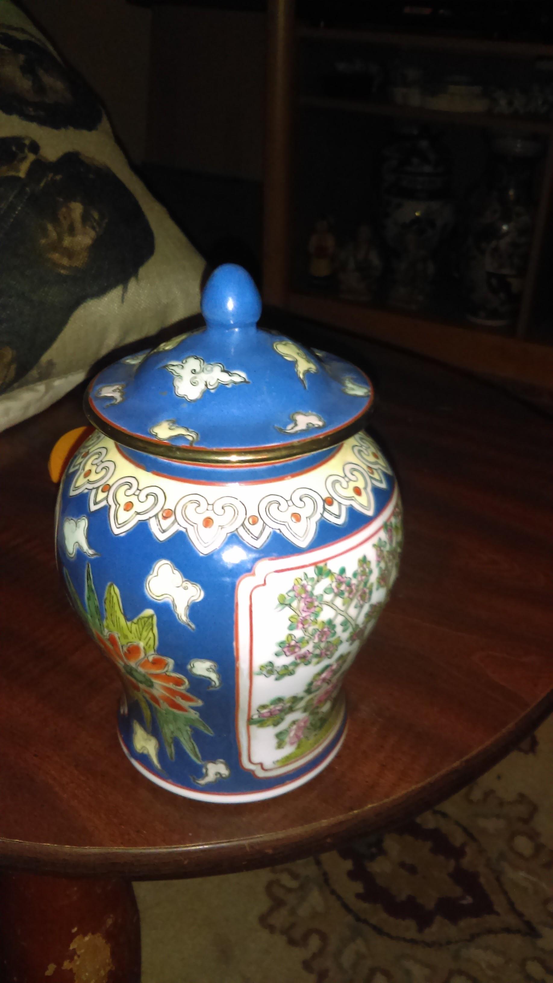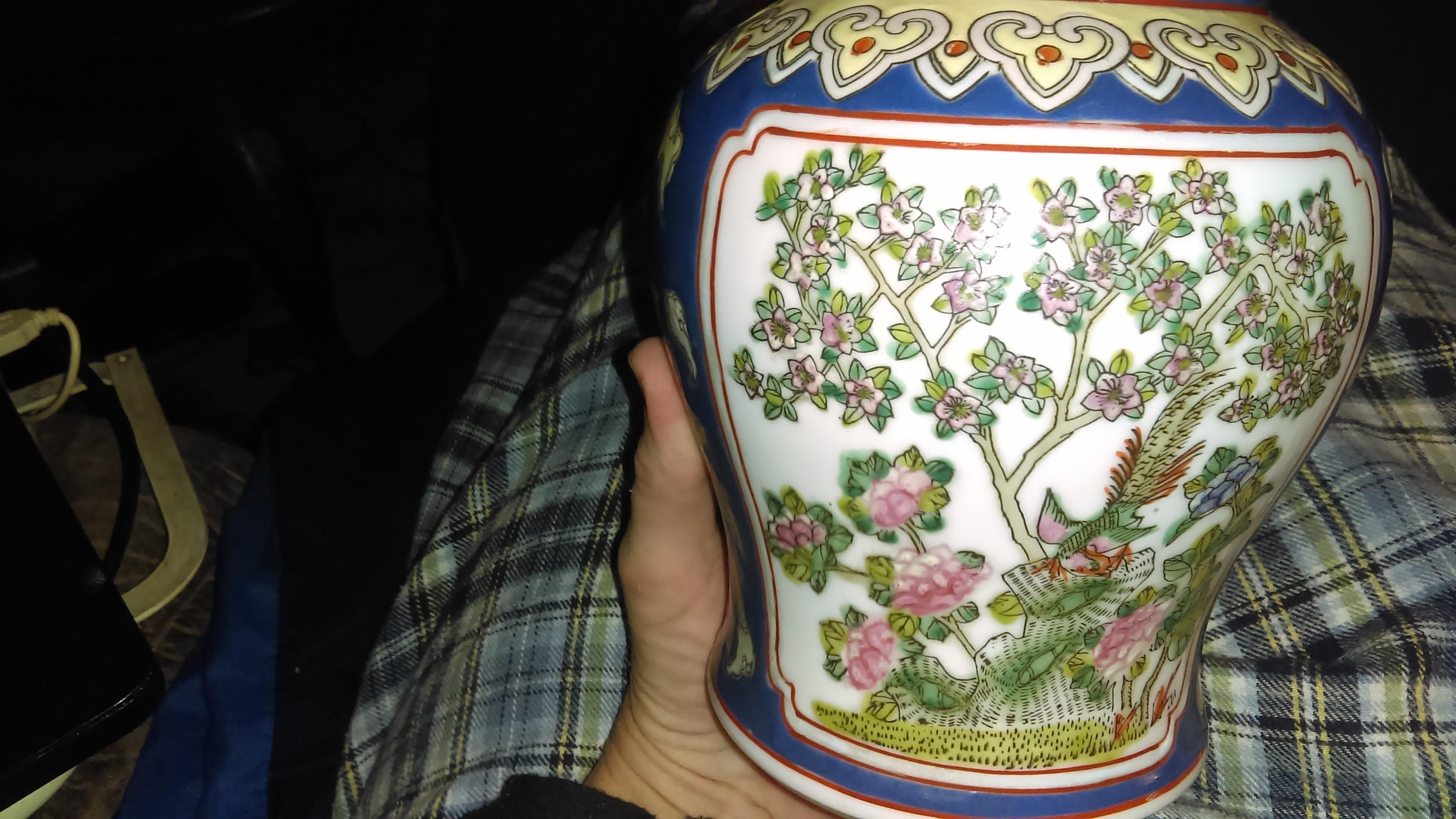 Ginger jar with raised paint. Has a bird in the main picture. Not sure if its a pheasant or phoenix. With flower on sides. DONT know anything about it,any info is appreciated.