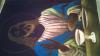 Jesus is dressed in an all white robe blessing a golden chalis. To His left appears to be a very feminine figure in pink; and to the far right a man with his back turned but his face is partially showing.