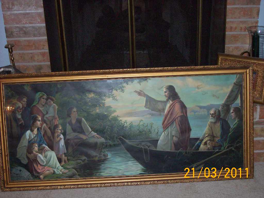2 ' 3" length by 23" wide.,Picture is Jesus in a boat talking to 3 women,3 children,2 men sitting on the shore.i don't know anything about a title for tis painting by Giovanni.