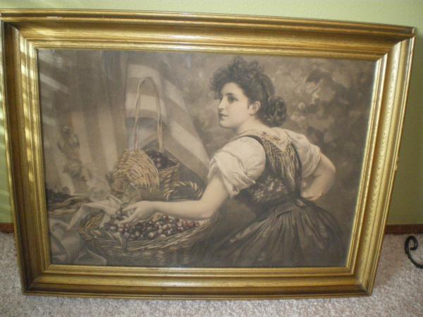 The picture is void of much color..however, the cherries have a swirl of red around each. There are 4 cherry baskets...her back is turned to viewer...and she is slightly looking over her shoulder..blouse is rolled up past her elbows.