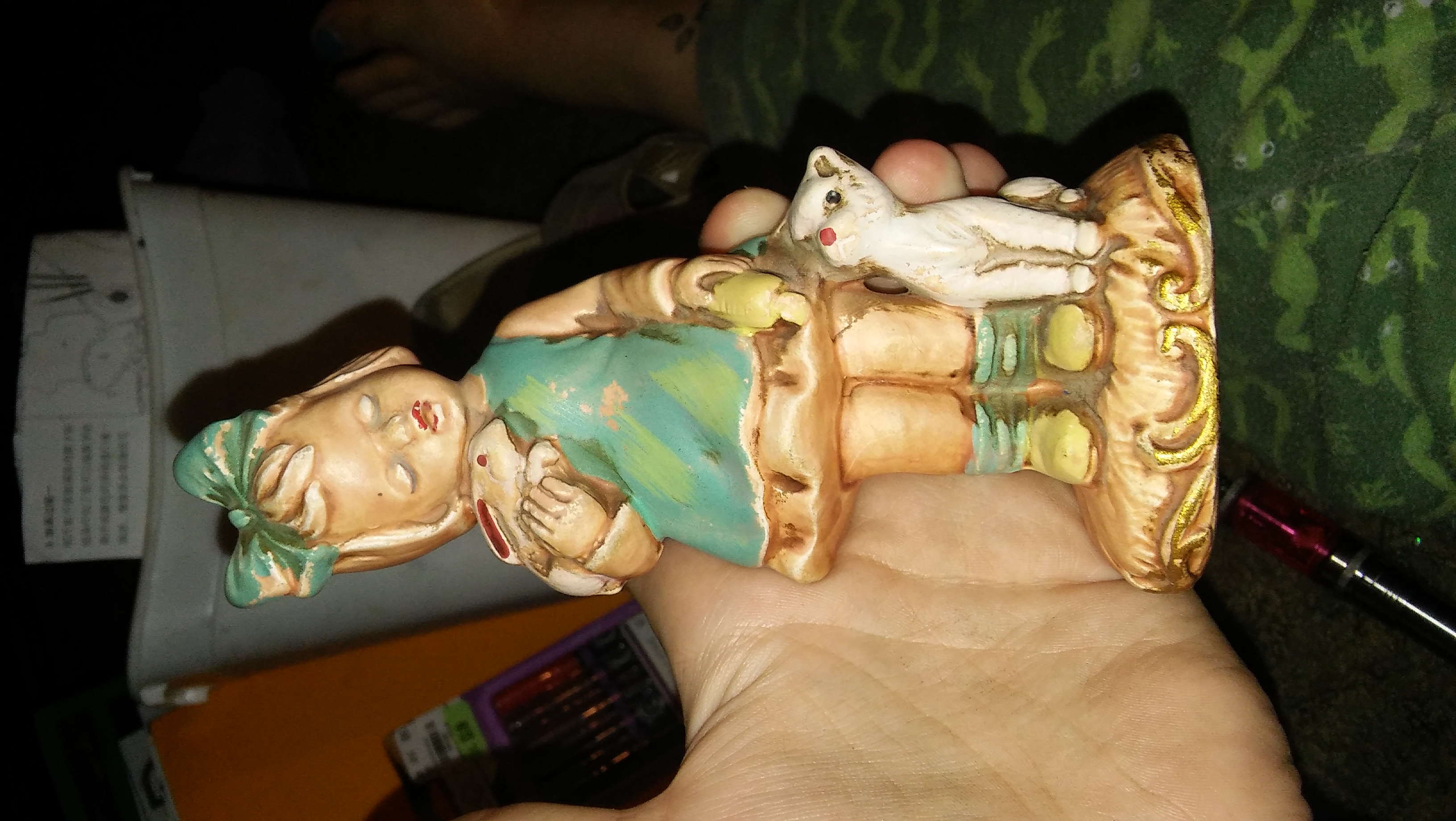A girl with a big blue how holding a rabbit in one hand and a bottle in the other. There is a white cat sitting next to her. I'd like to know more about her.