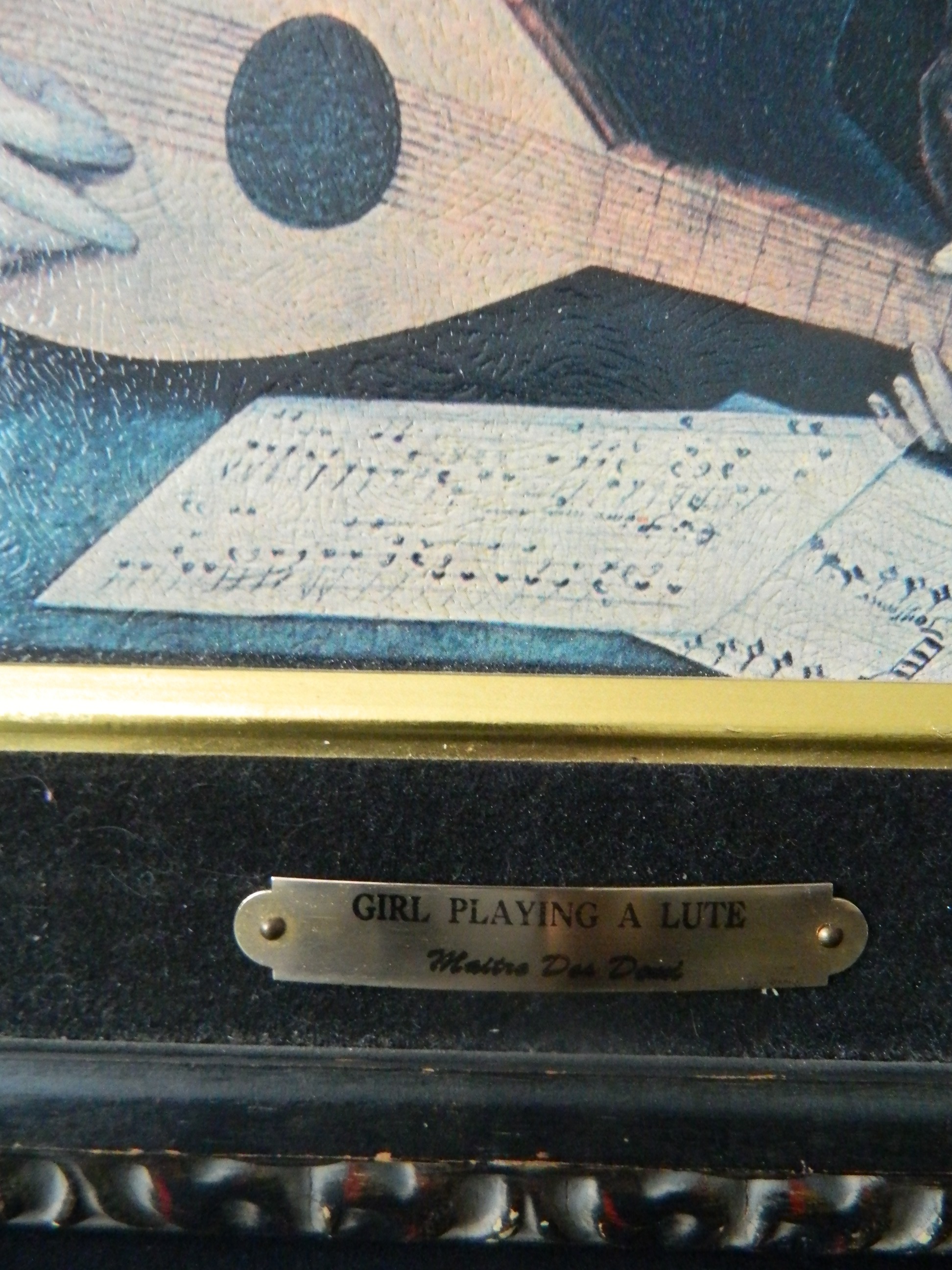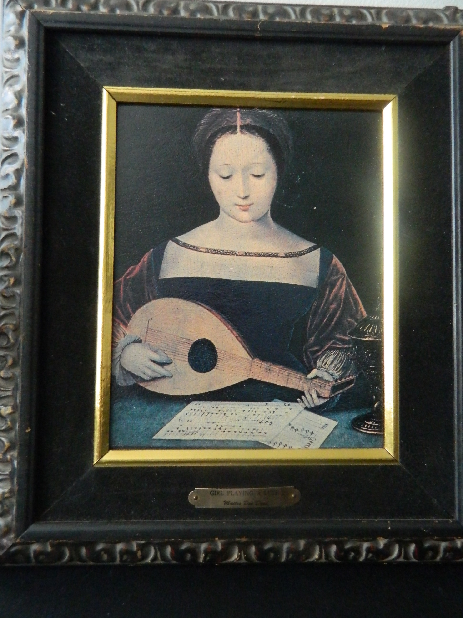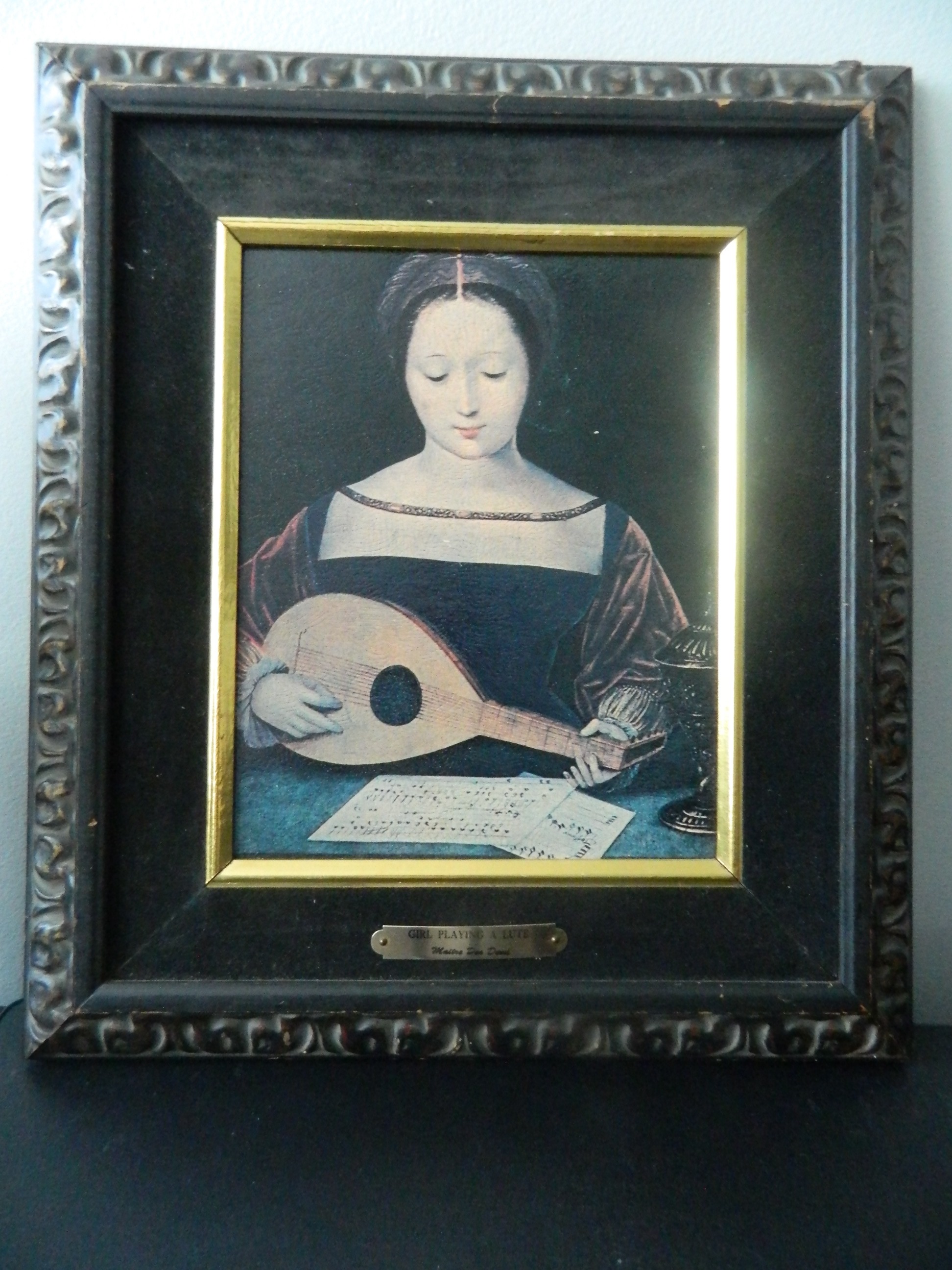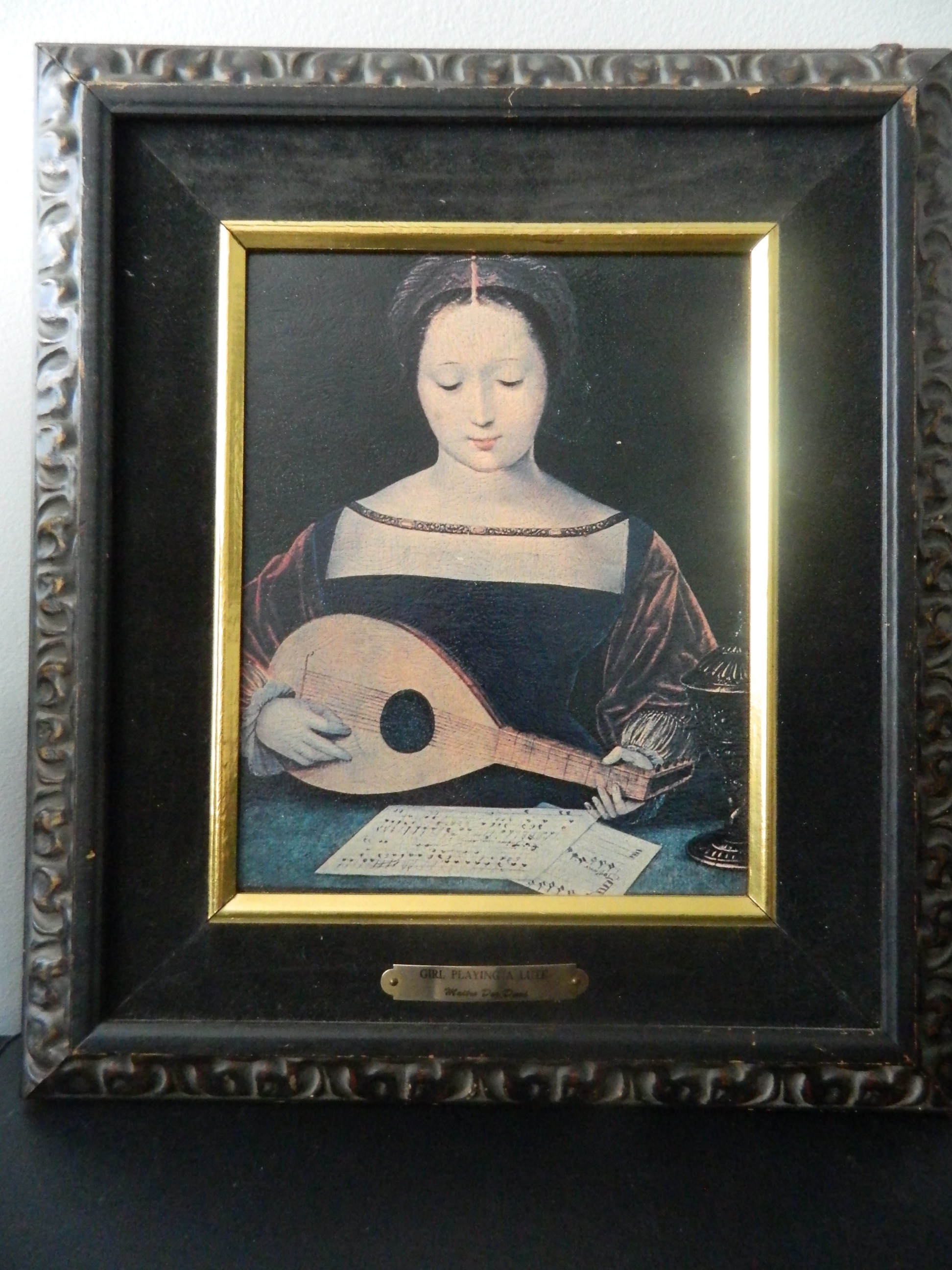Mary Magdalene Playing a Lute prints can also be found.. your picture is on paper not canvas . frame wood is new. hardware is new, little clips that hold picture are new. You can buy prints new for $45.00 .your frame is nice.. Look really close at your picture, rub hand across it, is it very smooth?. if it were a painting in Demi style it should have some crackling on paint if really old even painted on wood...I zoomed in and your's is smooth. not a painting...most of the time when I see the paper torn like this. people at thrift shops are looking for hidden stuff behind the paper.. 99.9% sure I am right. But please NOTE" I do not claim to be an expert. Good luck.