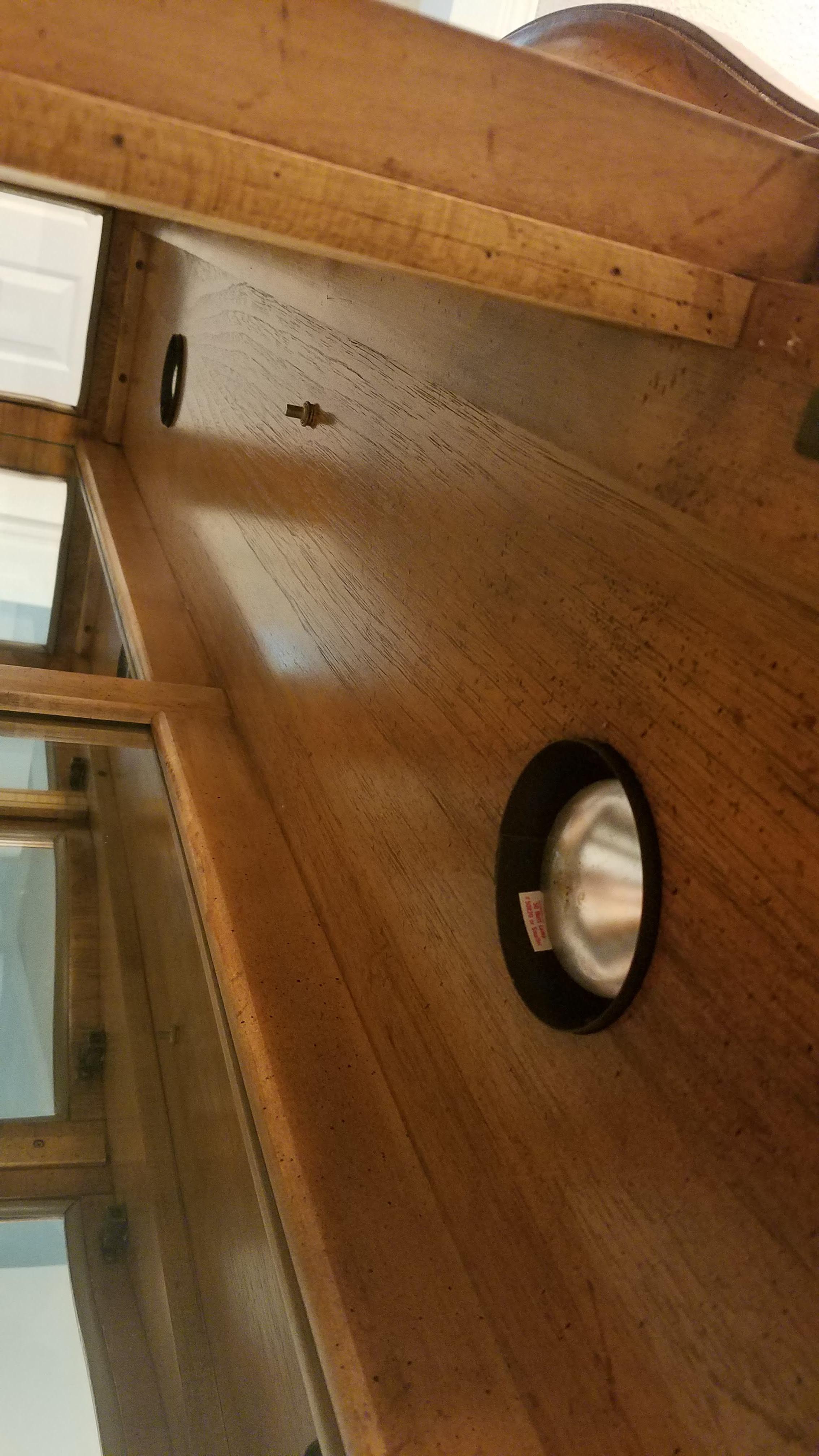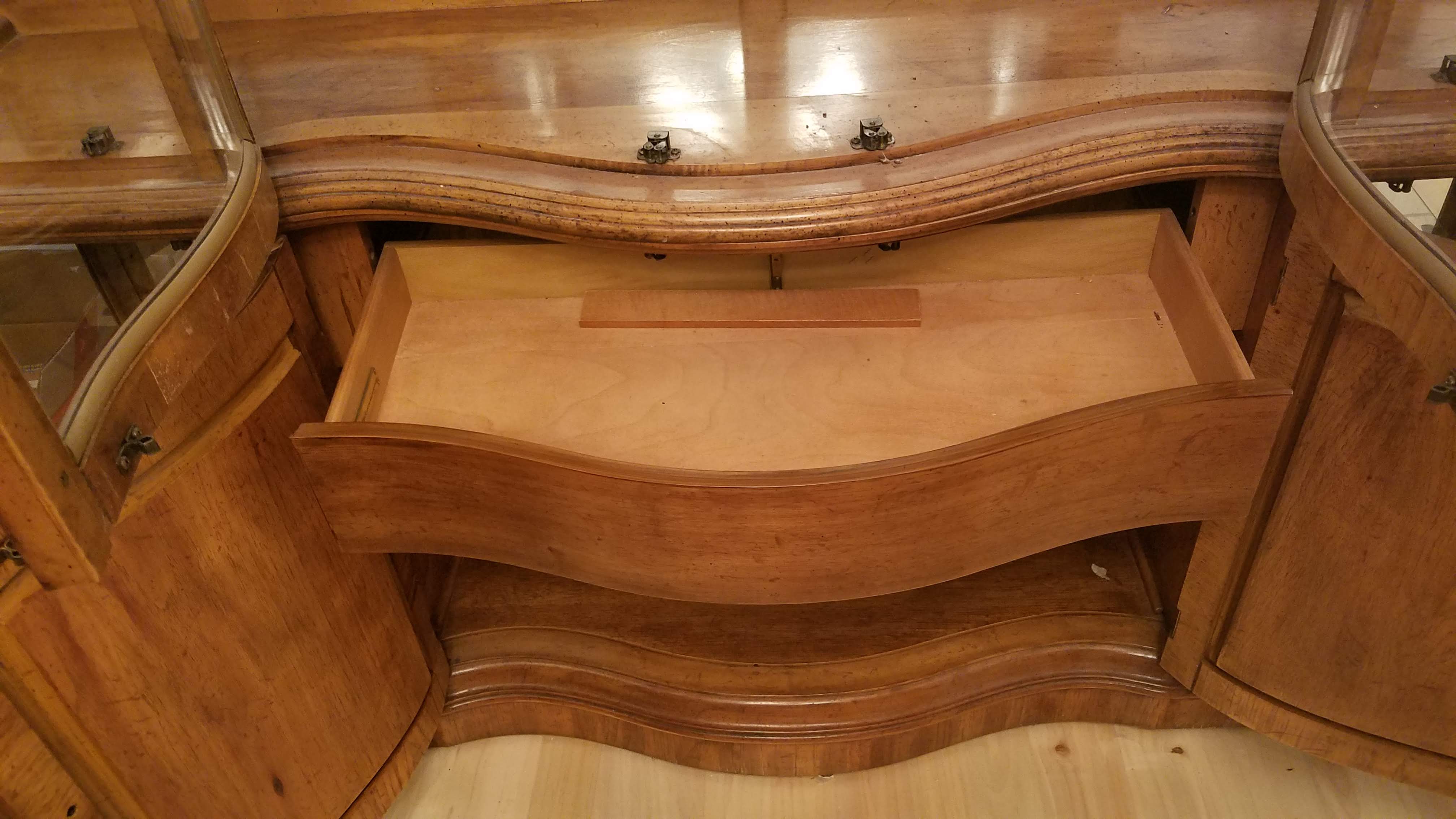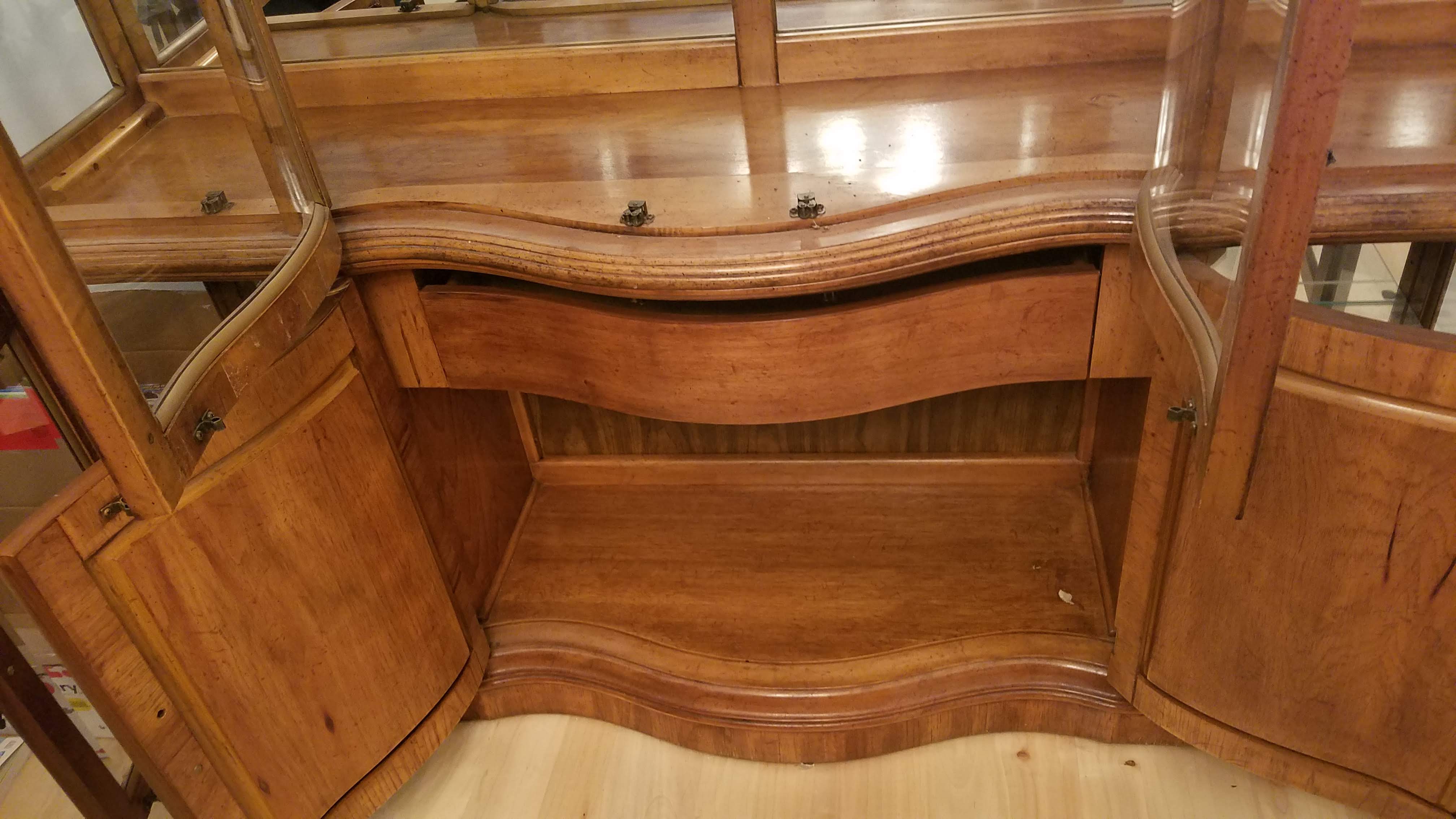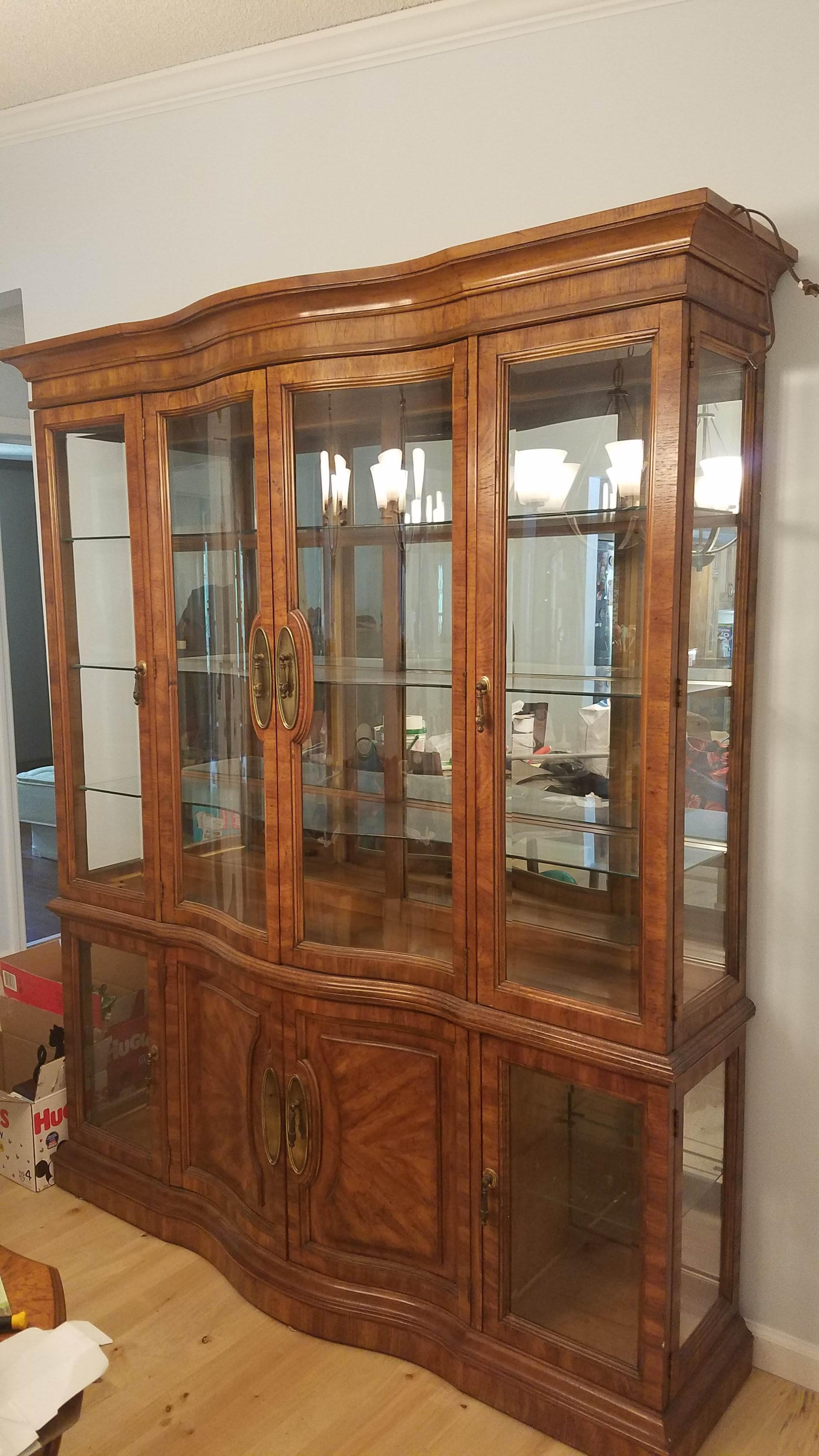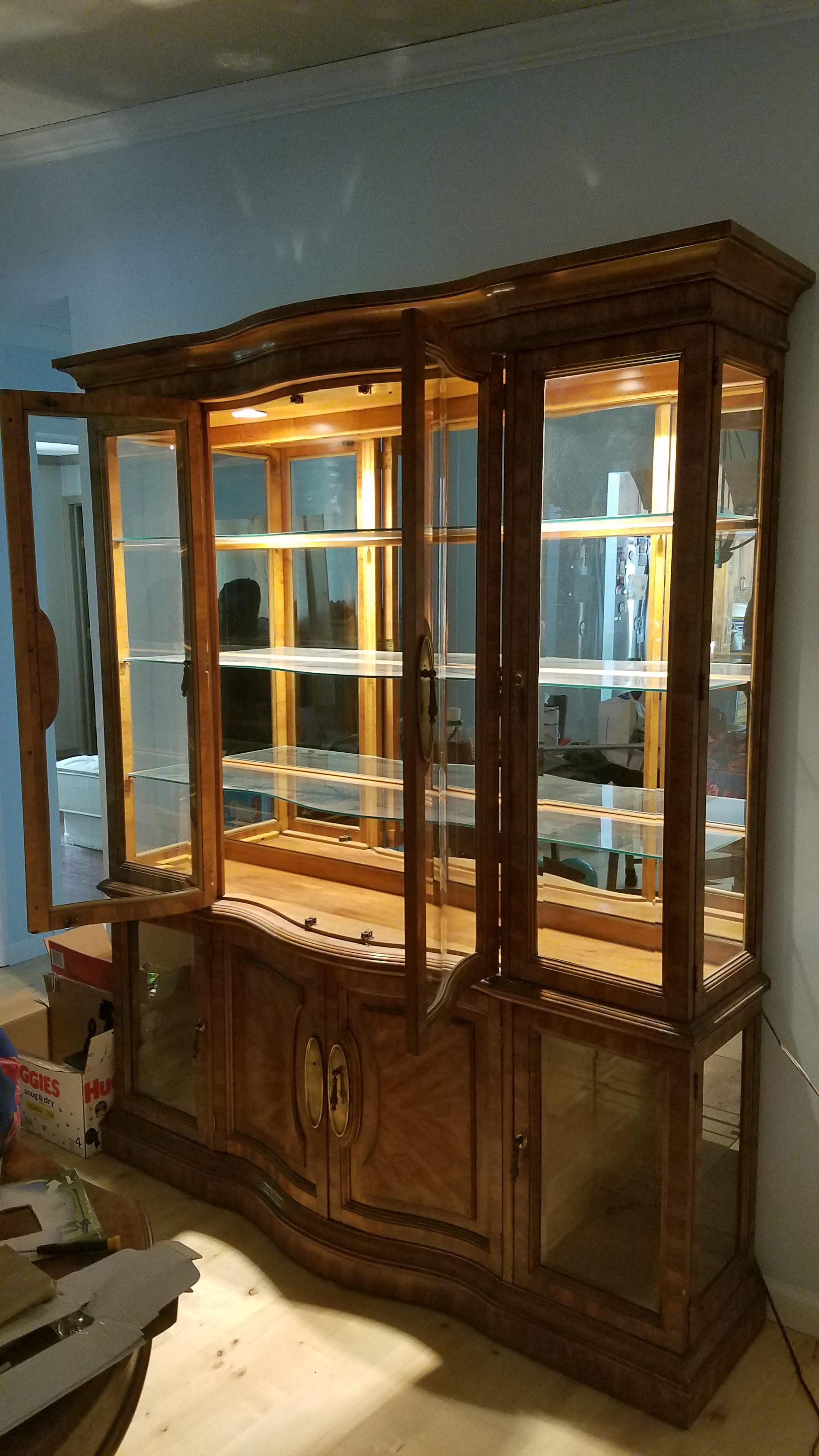 American of Martinsville china cabinet with 2 lights at the inside top. Two plugs, one for each light, and a button in the center of the ceiling. The bottom half of the cabinet has a drawer in the middle section that can come out once you open the doors. The shelves are solid glass and the back of the top portion is all mirror. The unit is 2 pieces, top and bottom. The middle top 2 doors are solid curved glass.