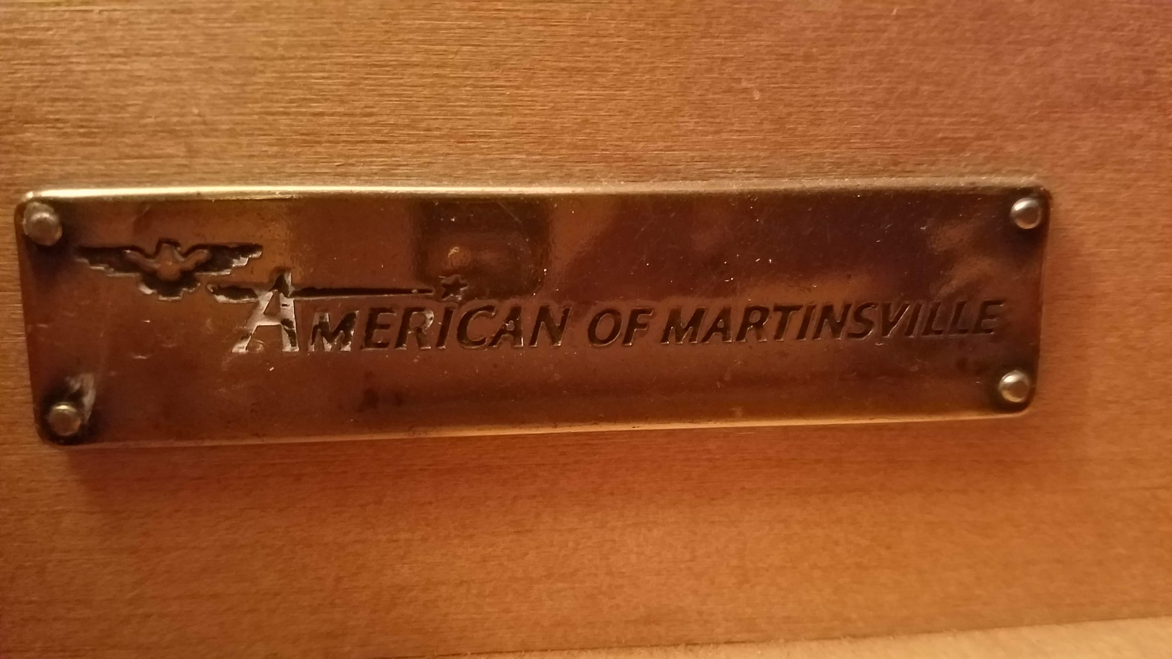 Distinguishing marks American of Martinsville gold emblem inside drawer. Brown with dark and light brown streaked finish.
