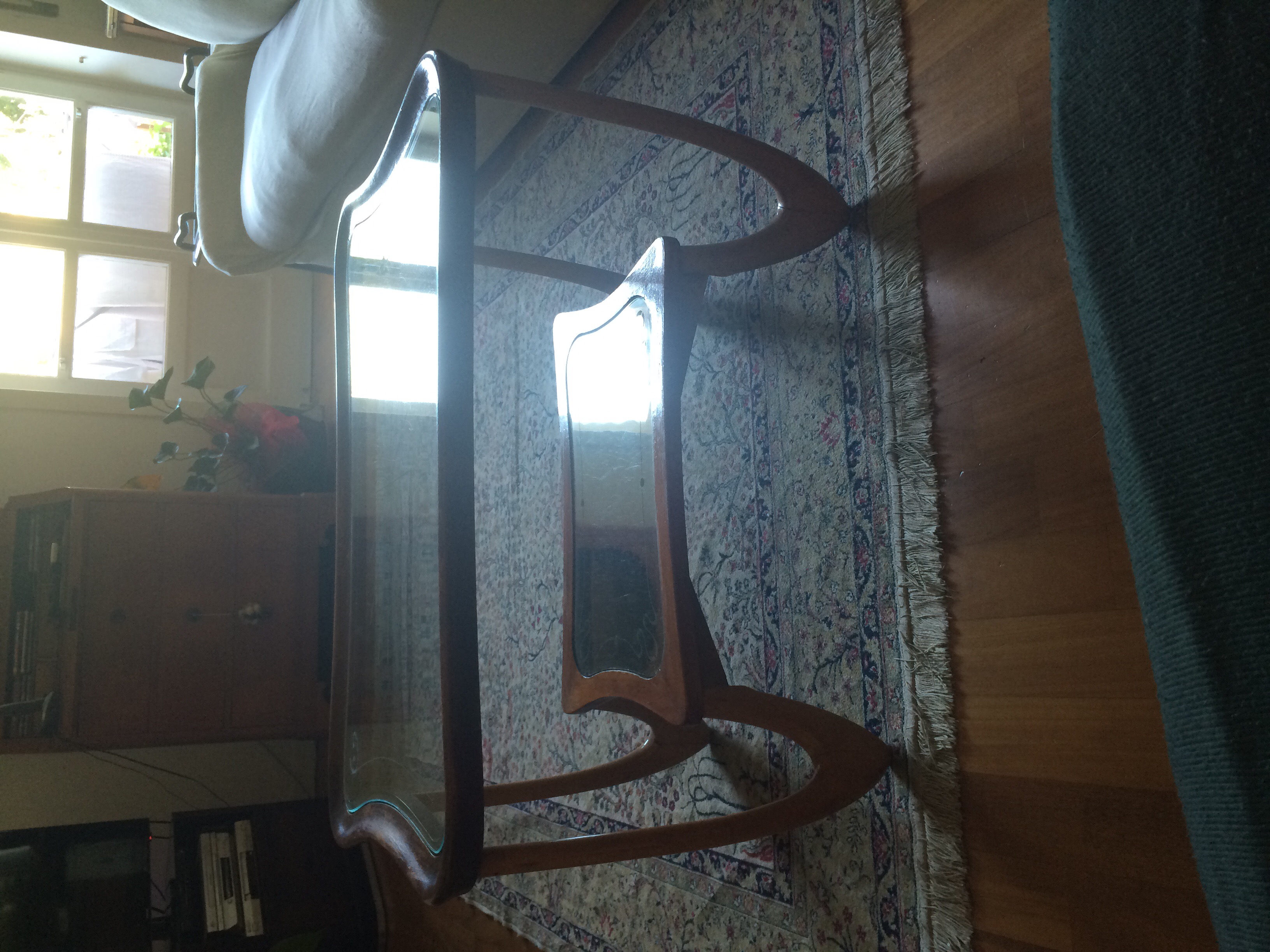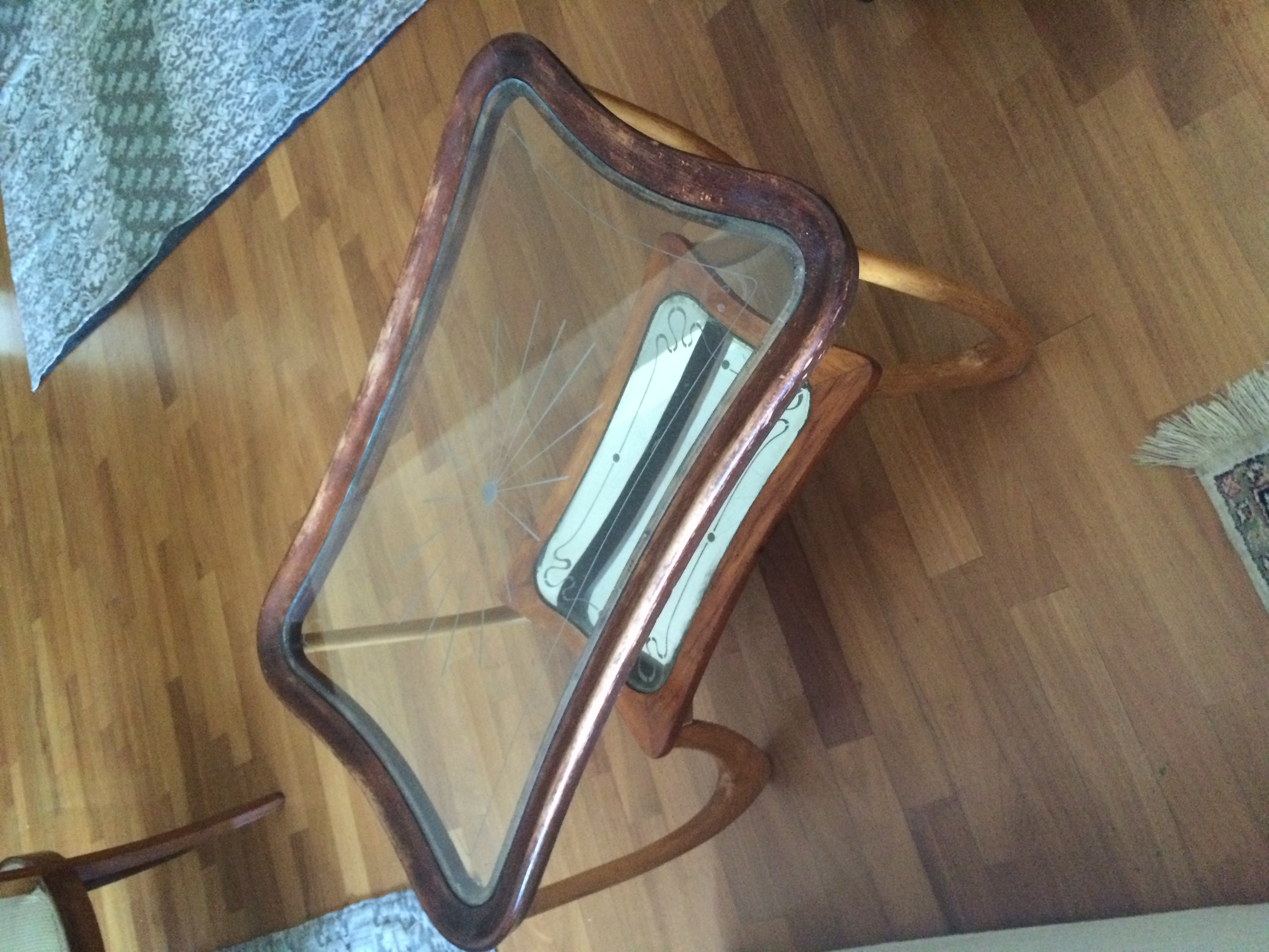 It is a side table on two levels, the top is composed of a glass pane with a sunburst etching while the lower level is mirrored and has a ribbon motif around the edge. It seems to be made from a darker wood which houses the glass top while the curved legs and lower frame are of a lighter honey coloured mood. Picked it up in a junk shop in Rome. Many thanks for your thoughs on this