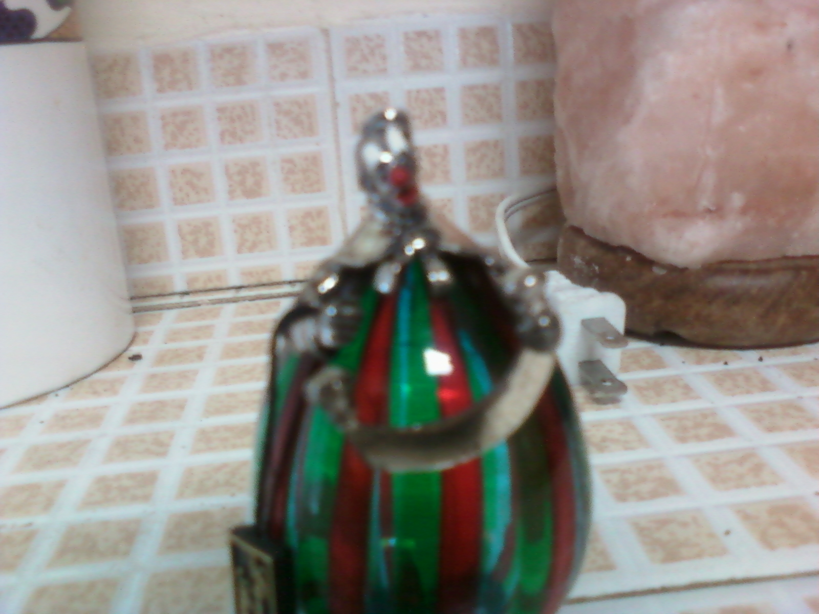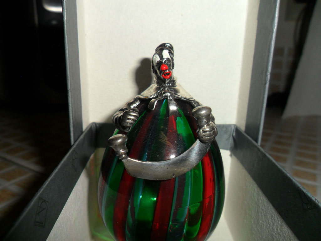 Hand blown red and green body, silver feet and depressed looking silver face. He is holding some kind of knife. This is hand done from Murano. ITs about 5 inches tall and I cannot track down anything like this.