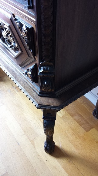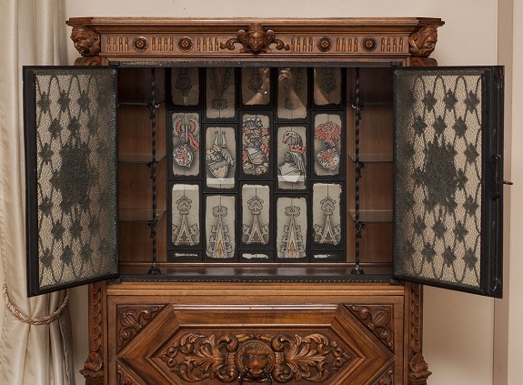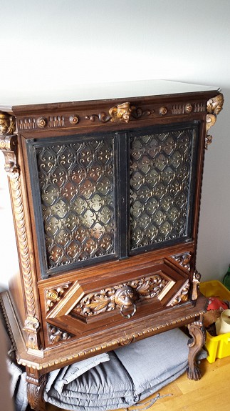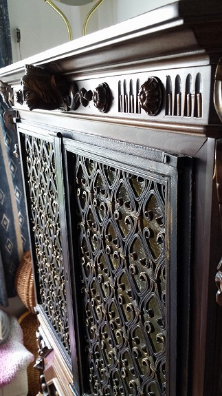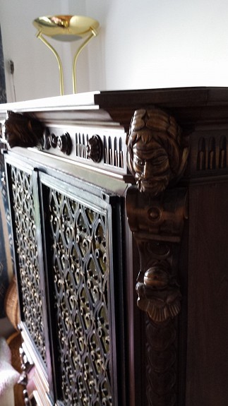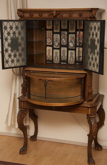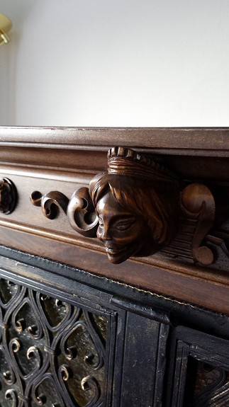 The cabinet has an unknown origin, the date of the production is also unknown, the cabinet is a carved and figured wood with glass door and glass interior, the cabinet has a secret room when pushing the lion head.