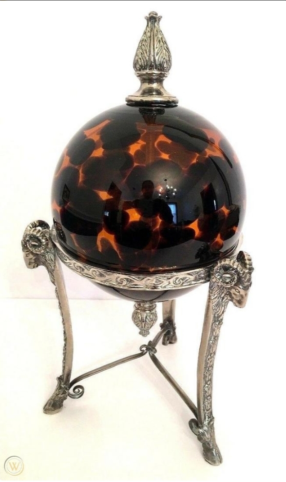 Brown and Black Glass Gazing Ball Art Glass on Rams Head and Hoof Silver Stand12"h x 6 1/8 d x 6 1/2"h