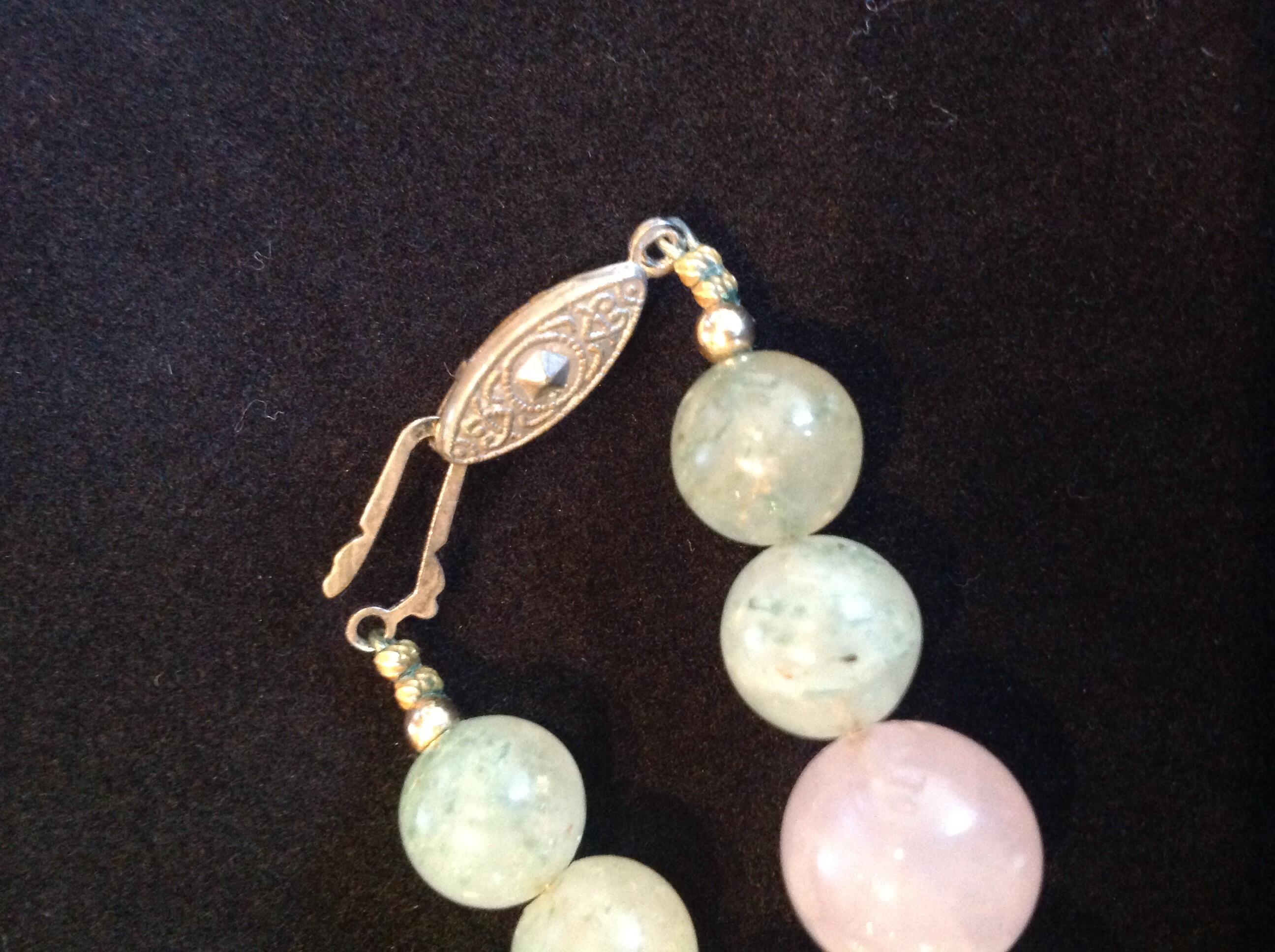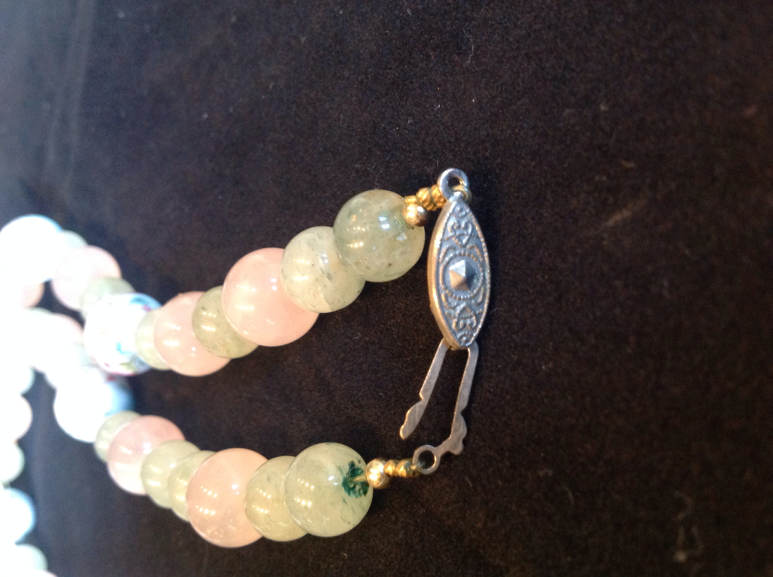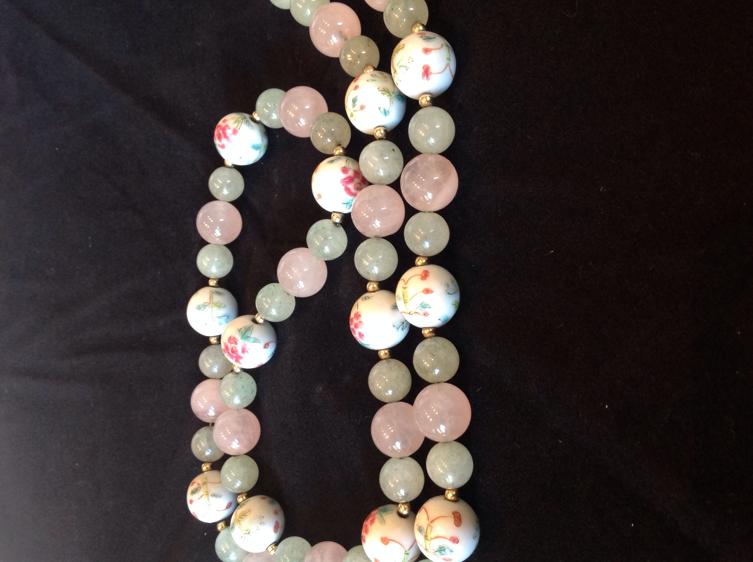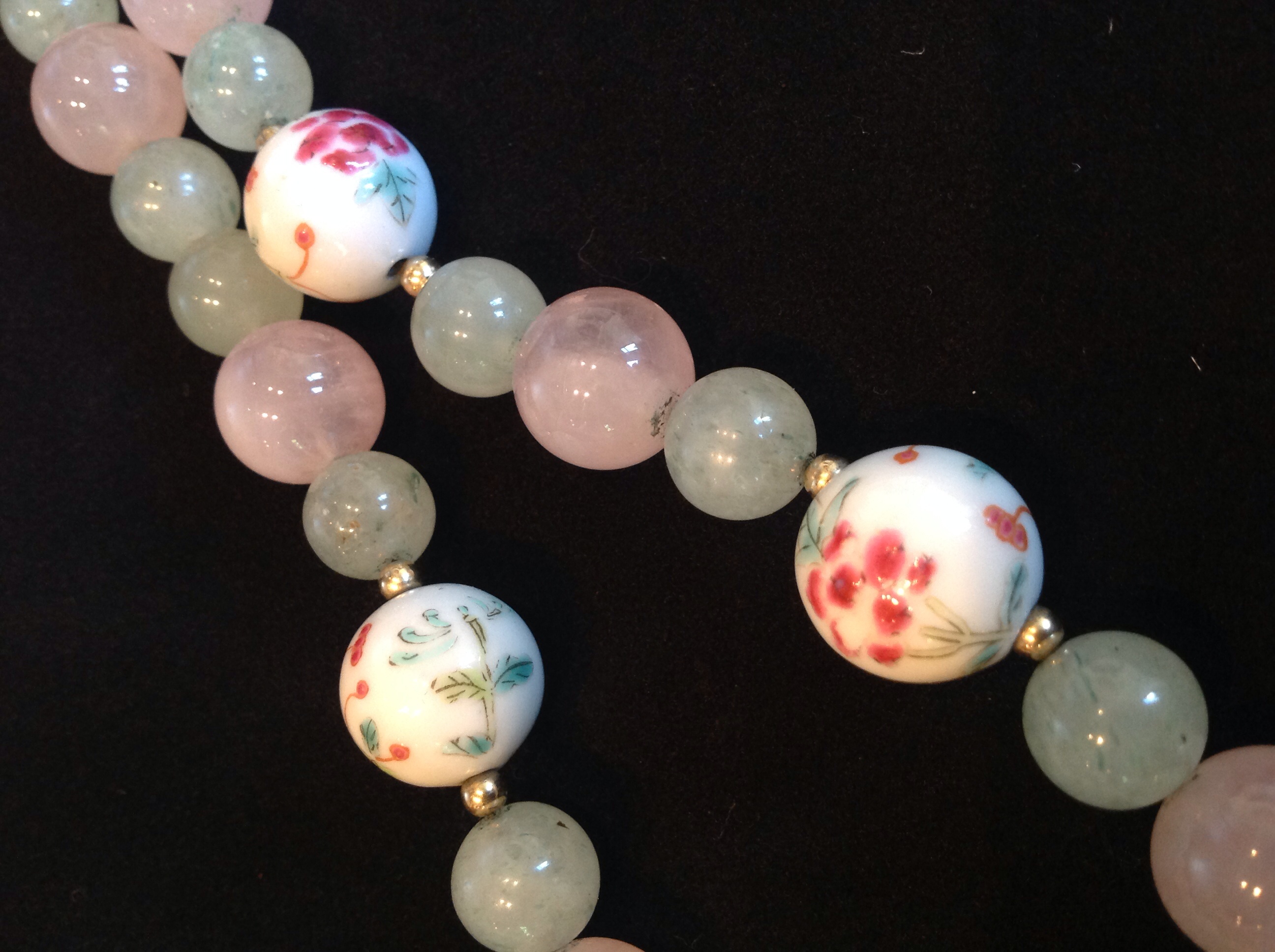 Pink and light green glass beads with a white (porcelain?) Bead that is hand painted. Looks to be possibly cherry blossom and bamboo. The gold colored beads in between the glass beads are gold colored, not discolored at all and not magnetic. The clasp looks old... Not sure about it at all. The glass beads have no seams what so ever, they are cold to the touch and sound like glass when tapped against each other. There doesn't seem to be any wear on the necklace except the clasp. It is quite beautiful. Got it at an estate sale. I can't find anything online that looks like it.