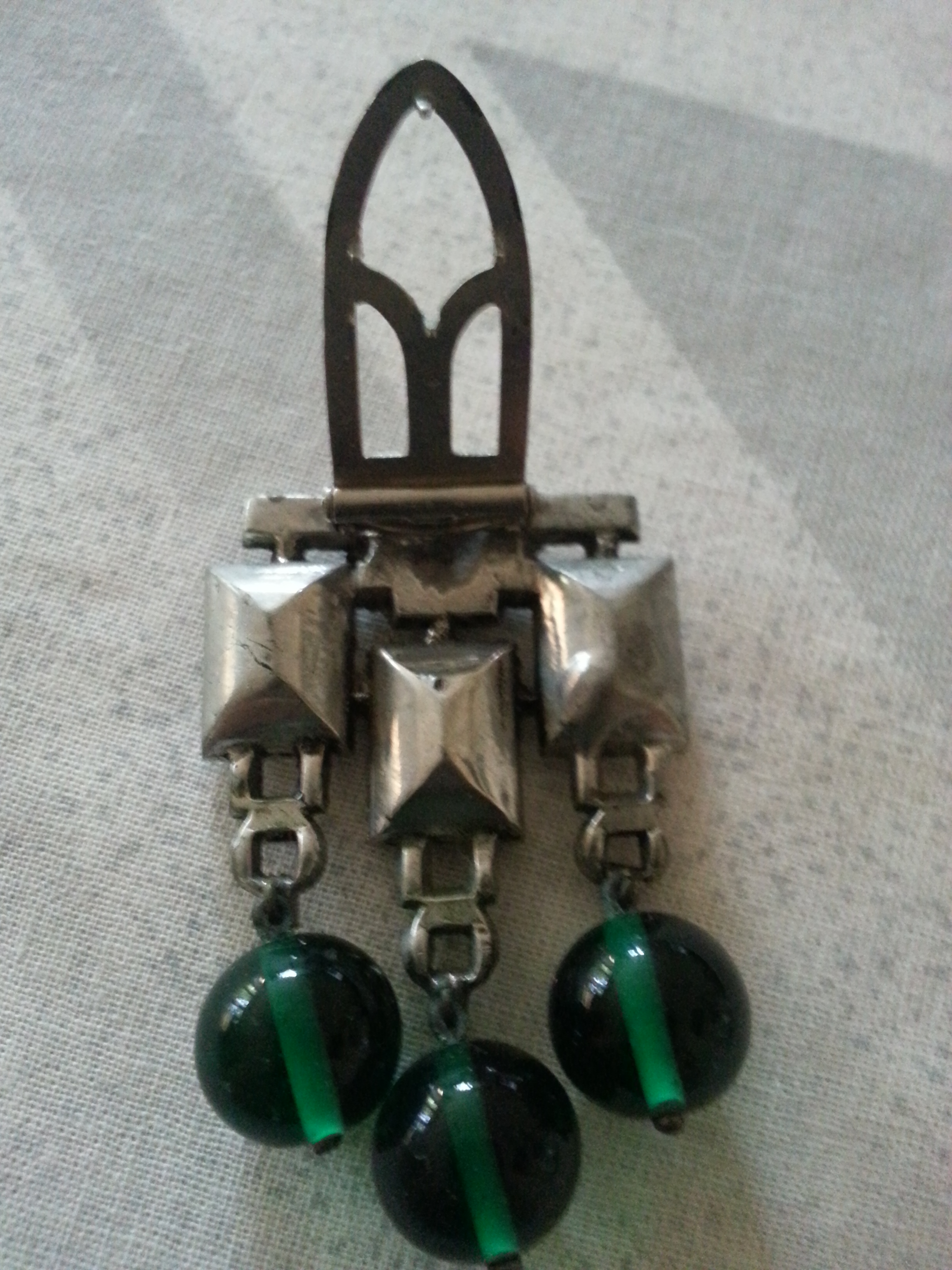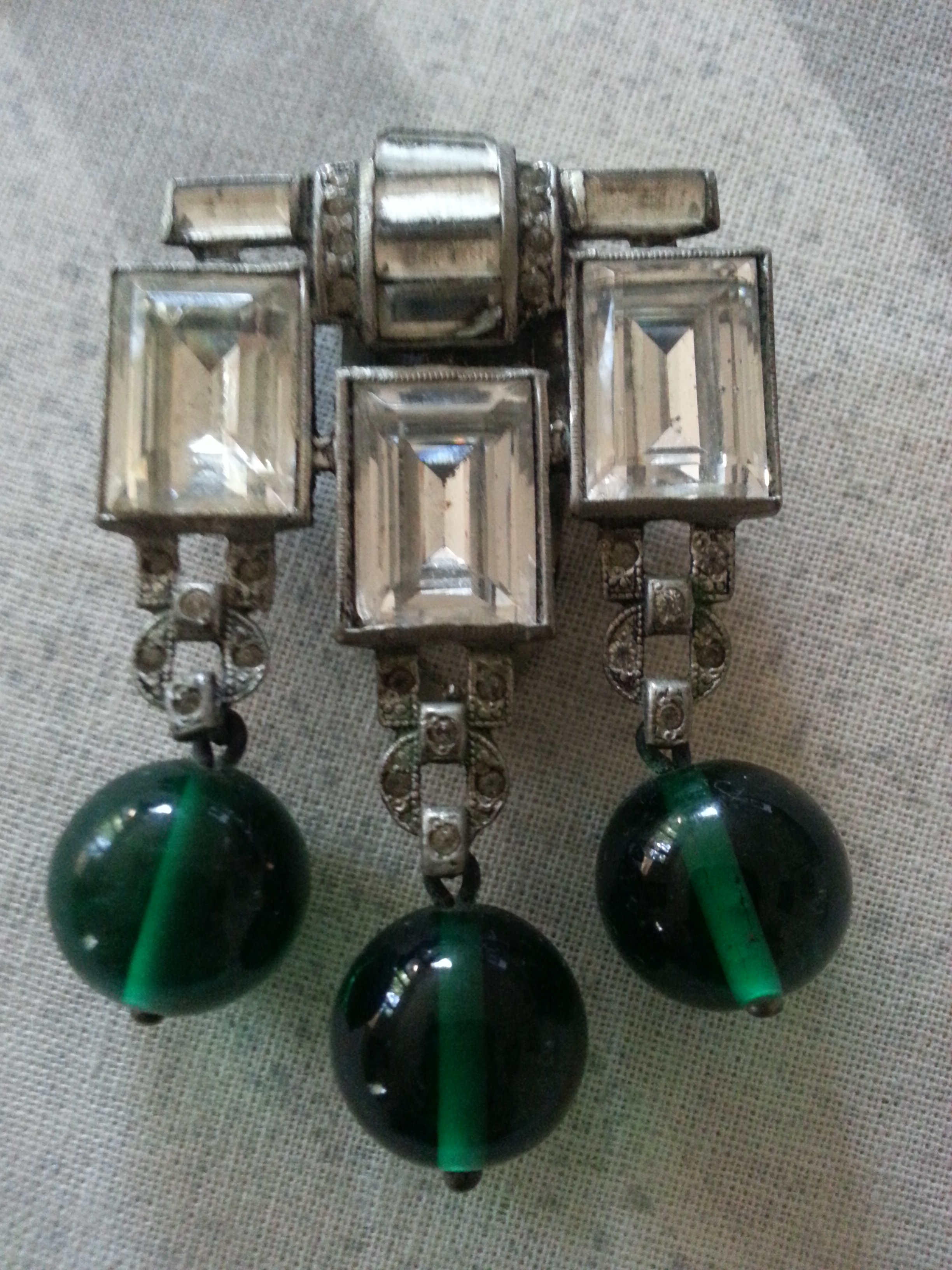 Glass green and clear stones. Back has a clip on clasp.