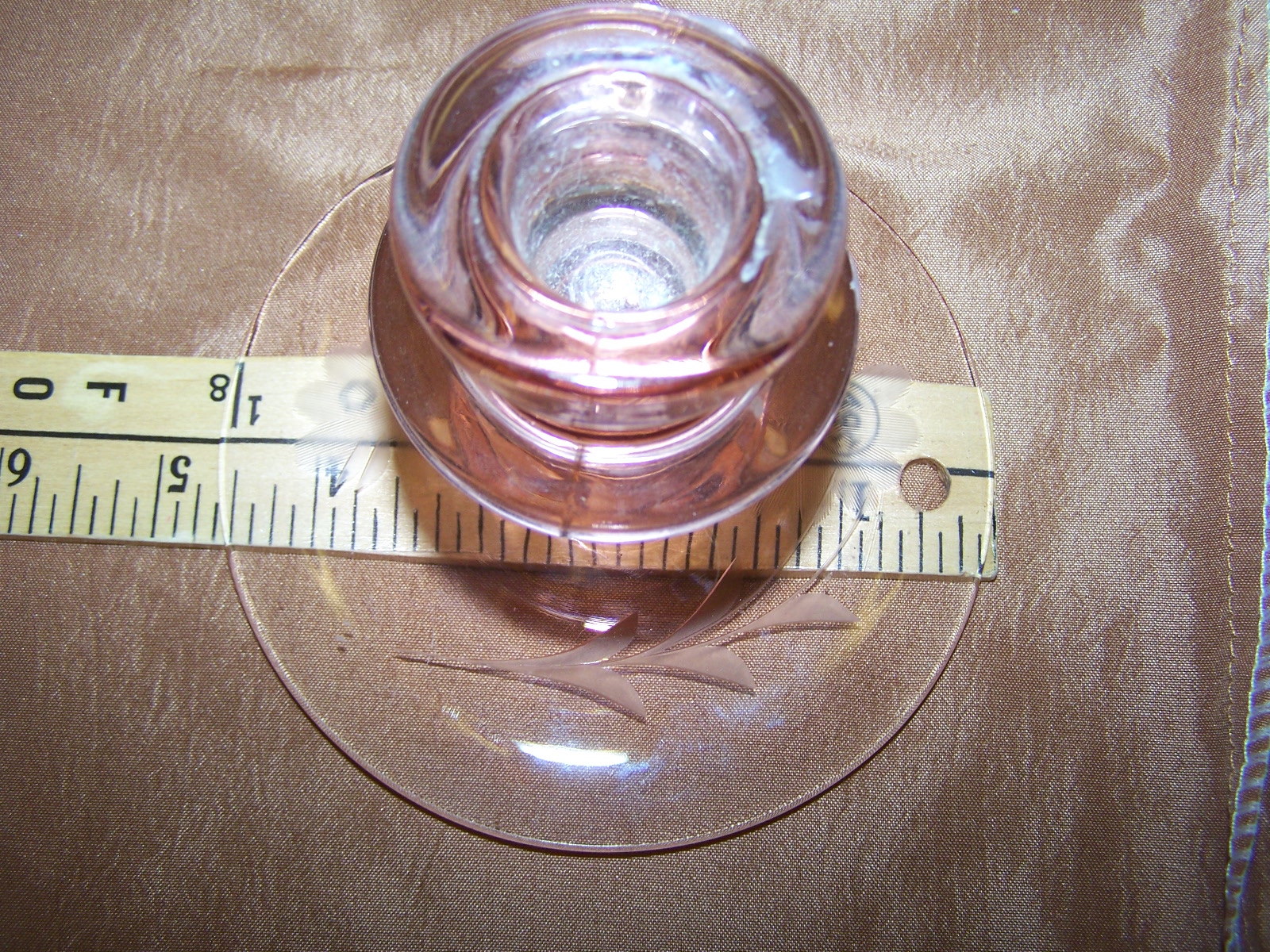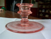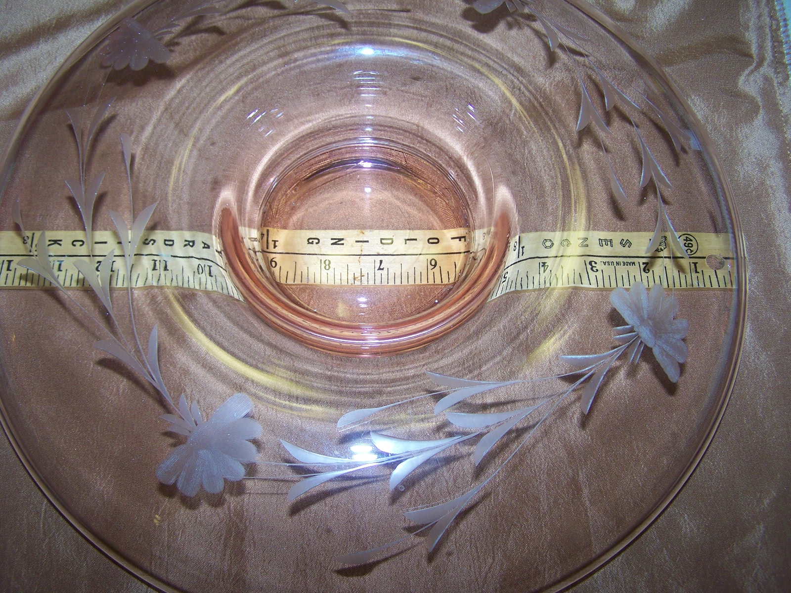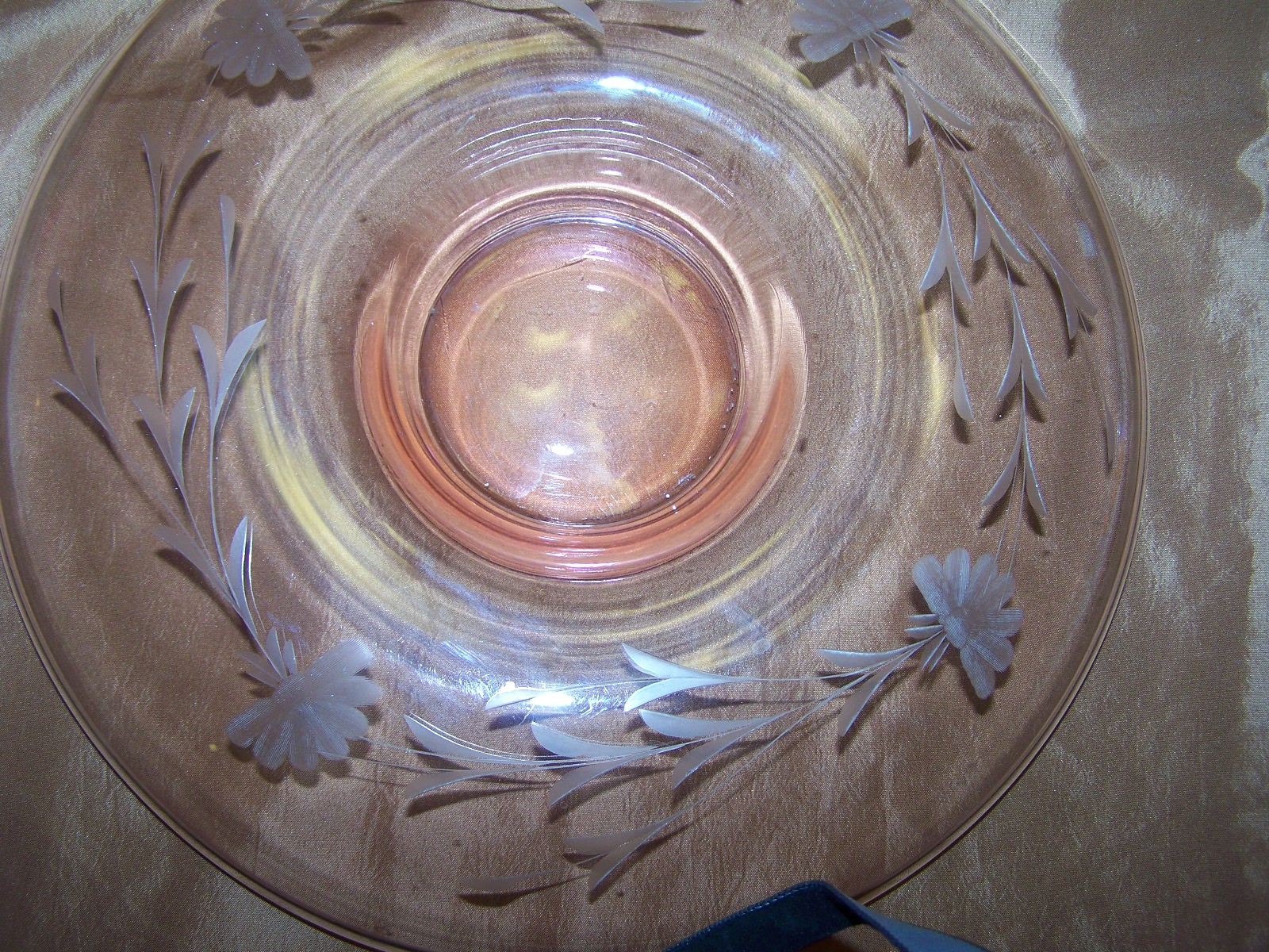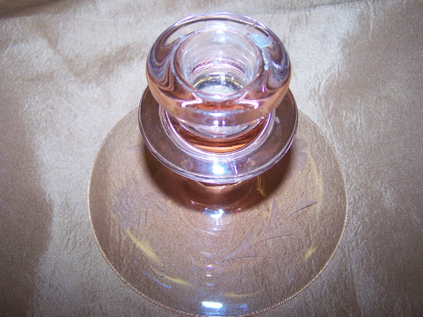 The set is glass, and is a 'rose' color. There is an etched design on the bottom of the candleholders and the bowl. There are no nicks or visible scratches.