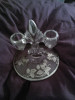 Distinguishing marks Design etched on the bottom of the candle holders and the bowl, rose colored glass