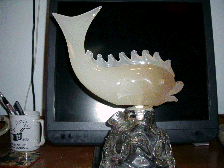 Glass fish decantor. Bottom of the decantor is clear glass, the fish is a pink opique.