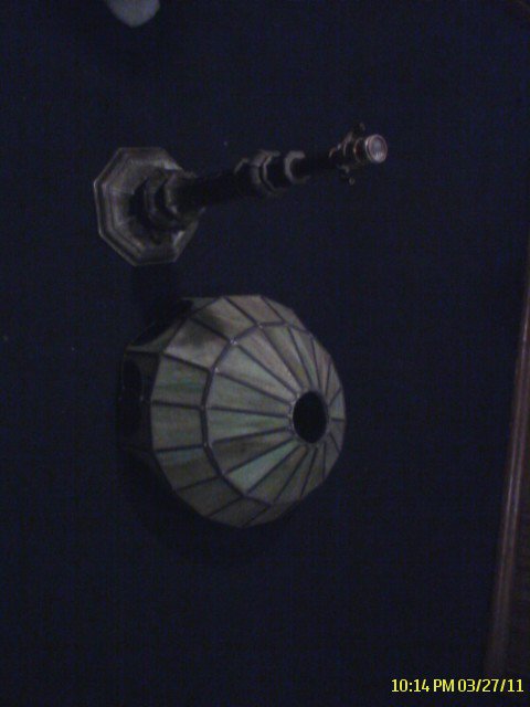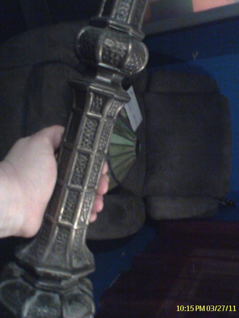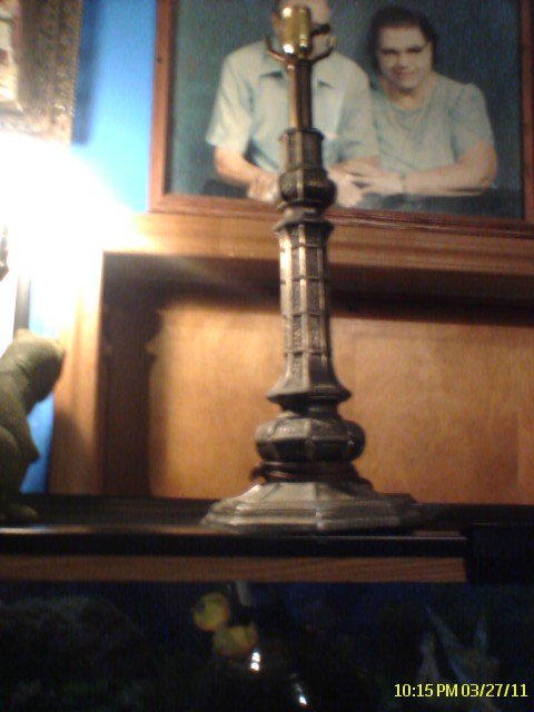 I have this lamp its missing the cap on top and the metal thing that holds the shade on the glass shade is pretty heavy i cant find anything on the glass or lamp that says who made it