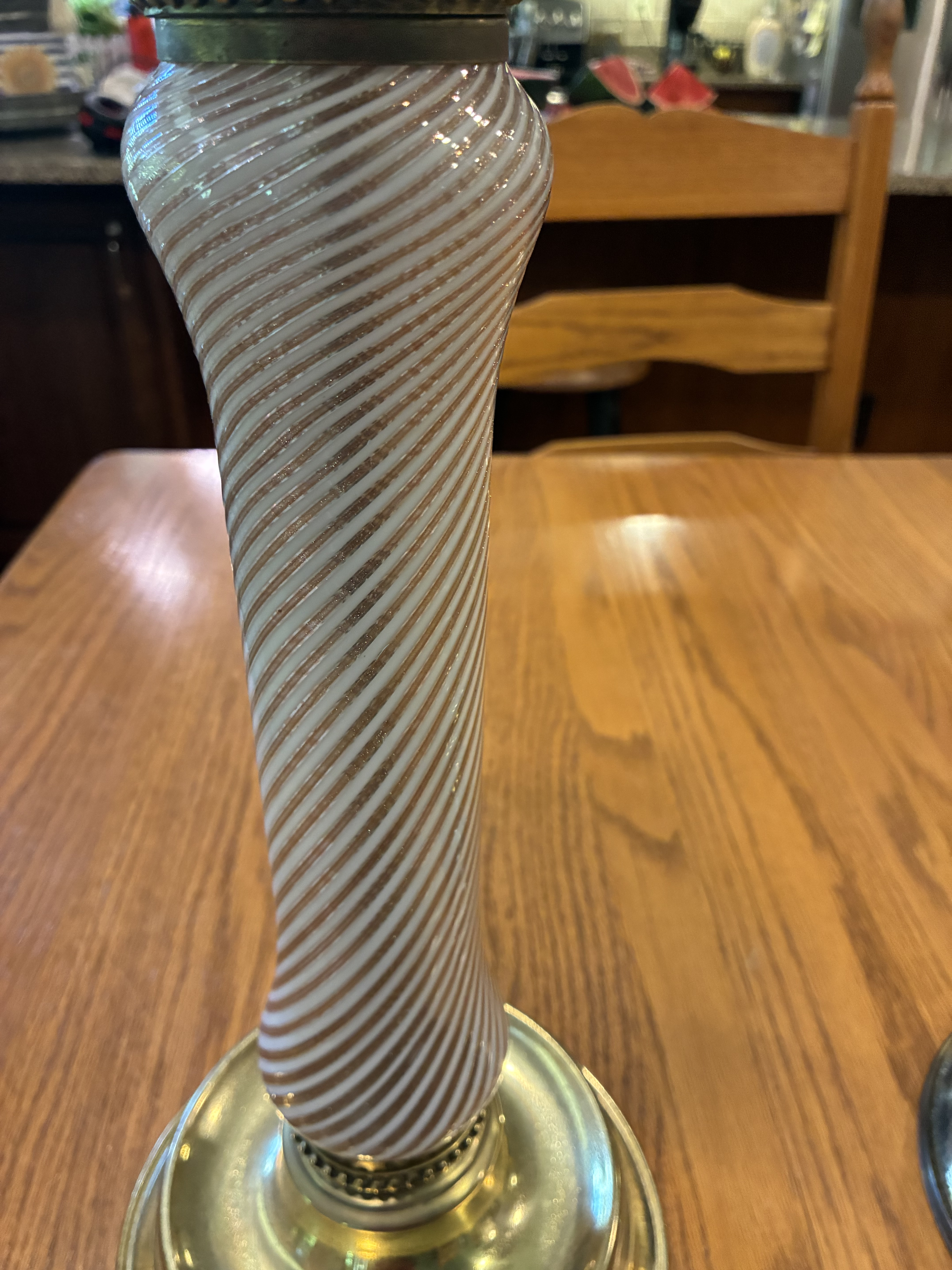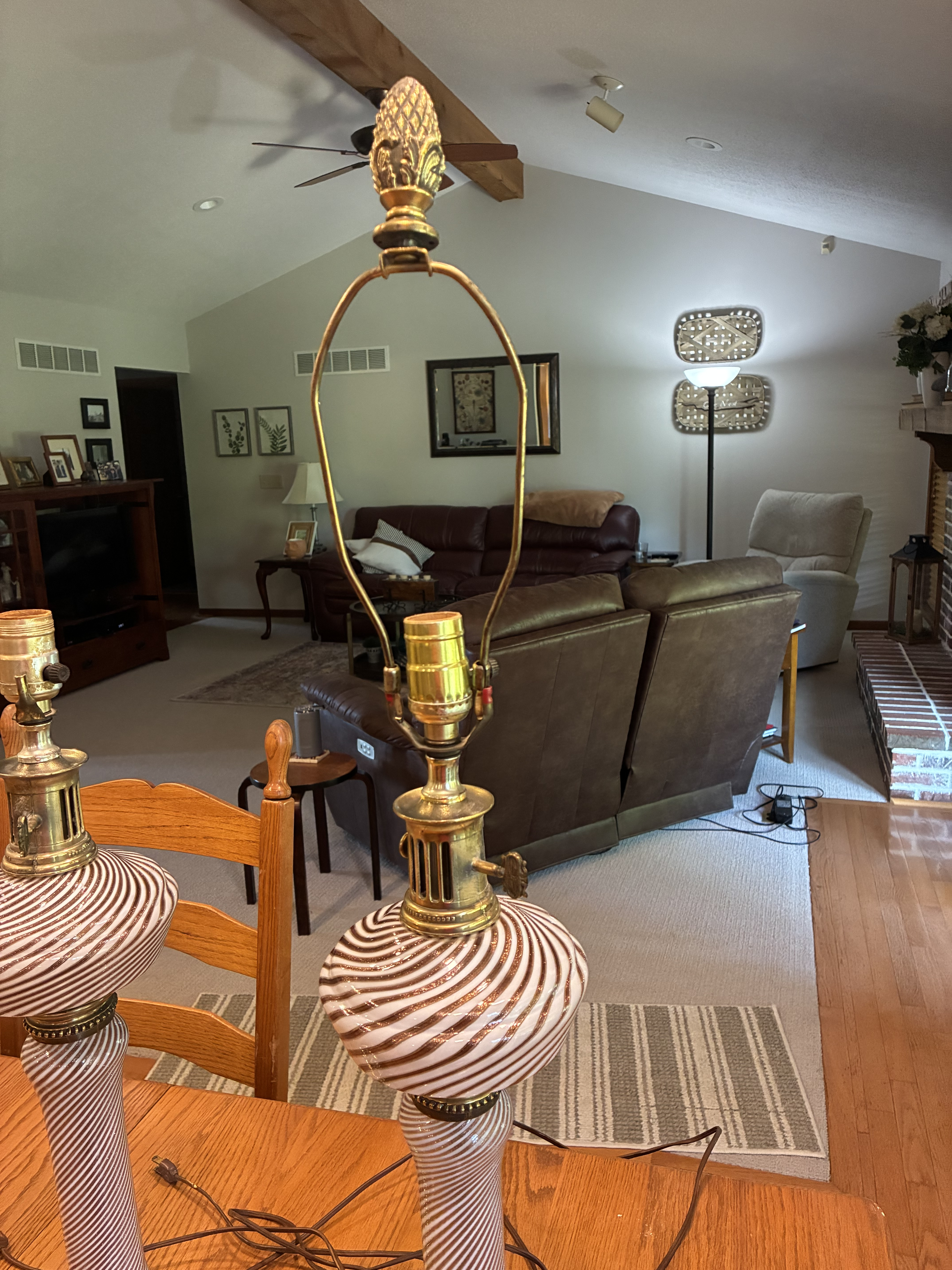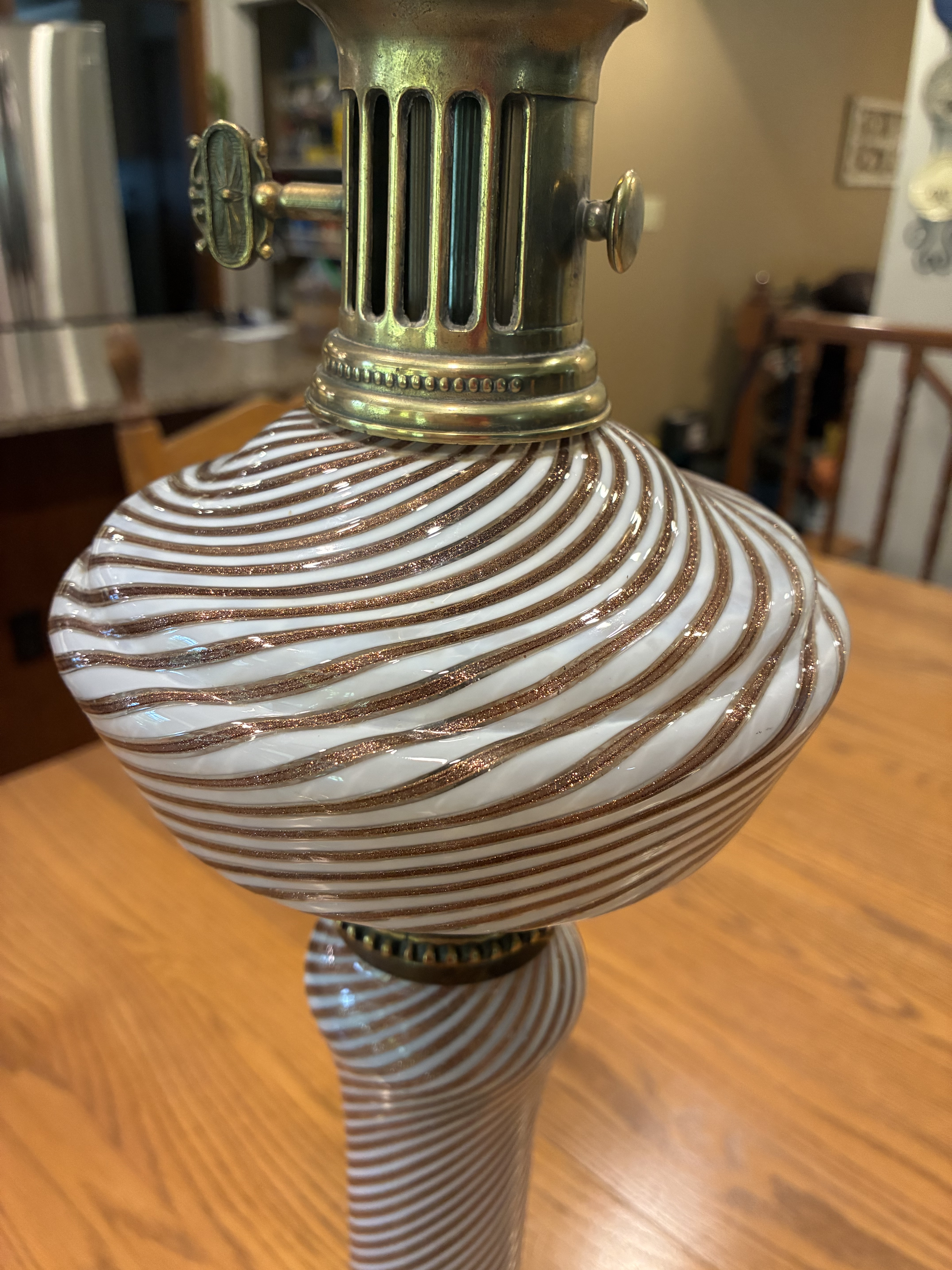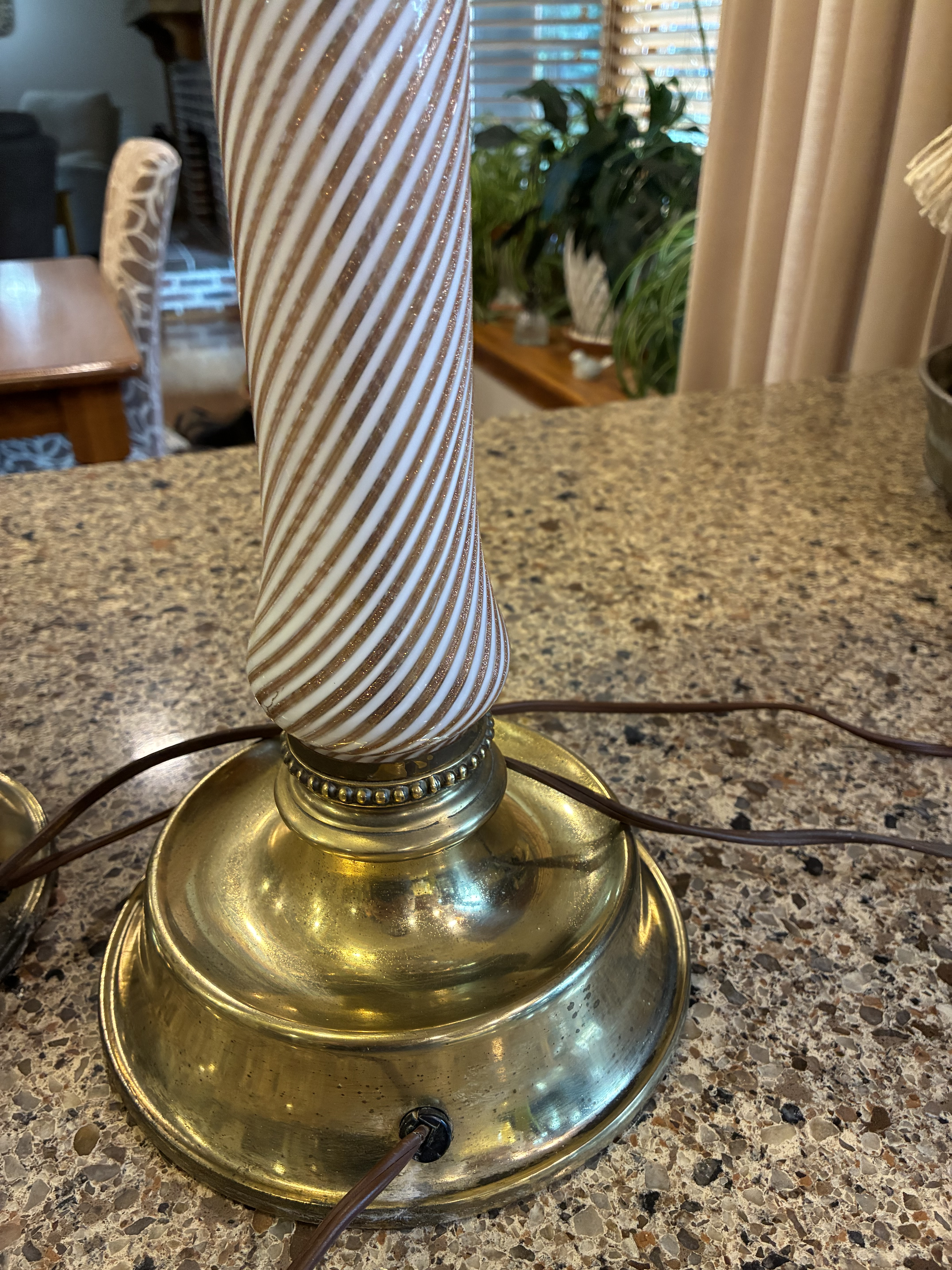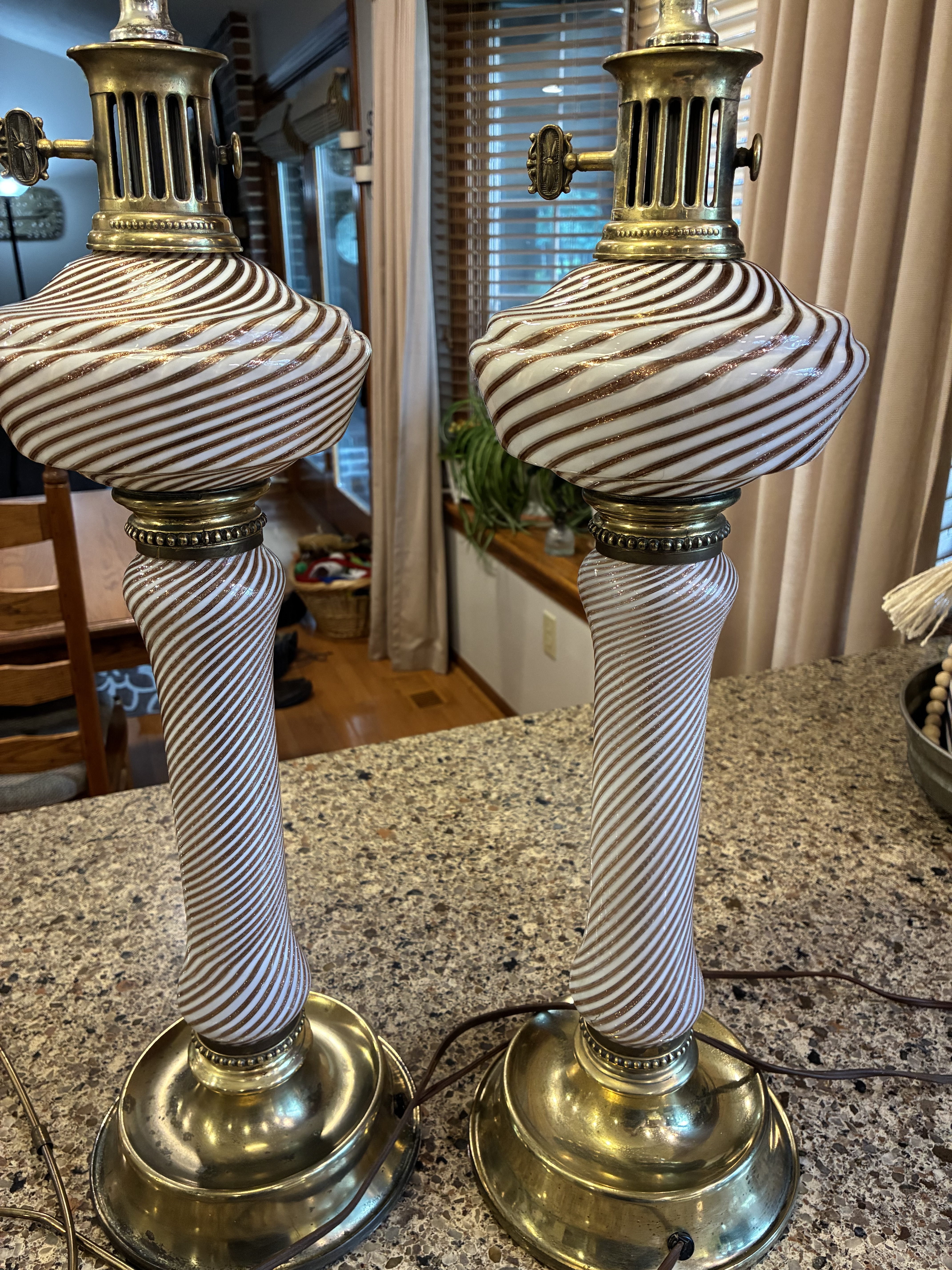 Physical Description: This set of glass lamps features a unique design with swirled white and copper-colored glass. Each lamp stands 21 inches high, with the top globe measuring 19 inches in circumference. The metal base is also 19 inches in diameter, while the column has an 8-inch circumference. The lamps are heavy, weighing approximately 5.5 lbs each. The metal components are brass-colored and non-magnetic, indicating a likely brass or brass-plated material.