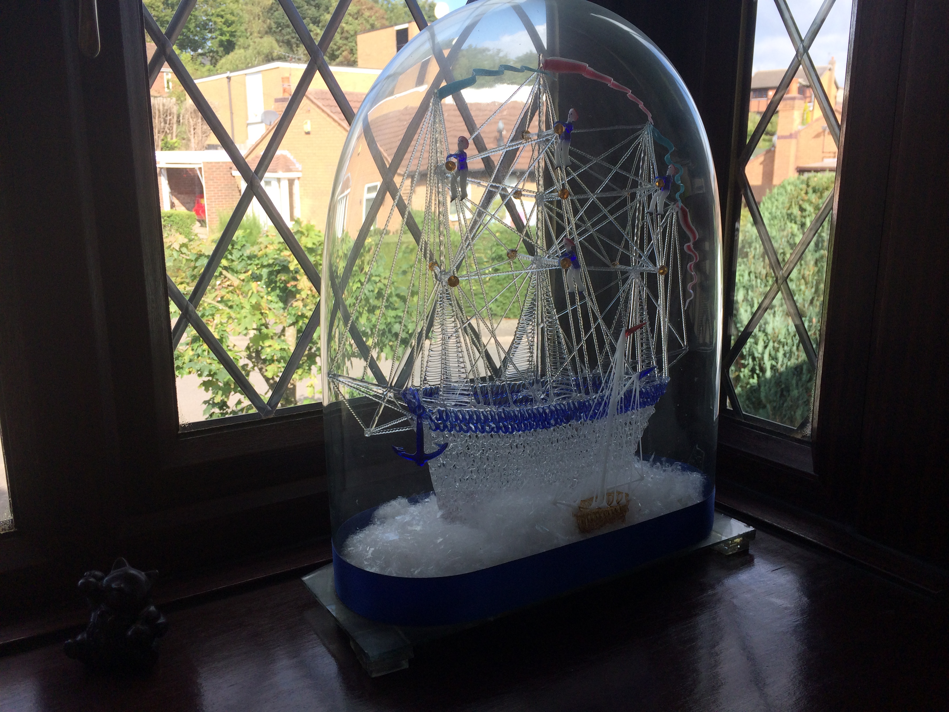 Spun glass ship in excellent condition. It is very detailed, including a smaller ship and sailors in the rigging. It is under a glass dome.