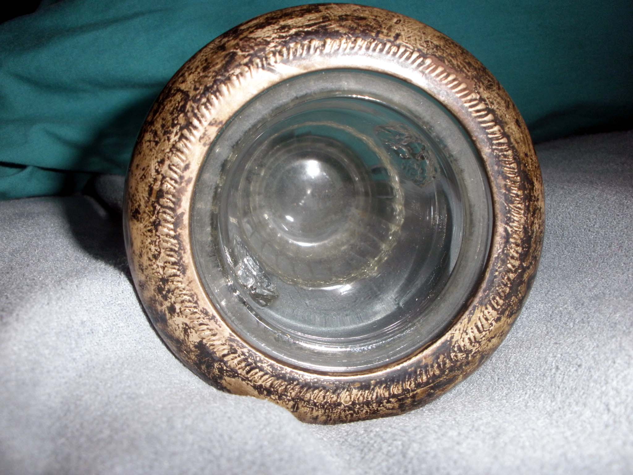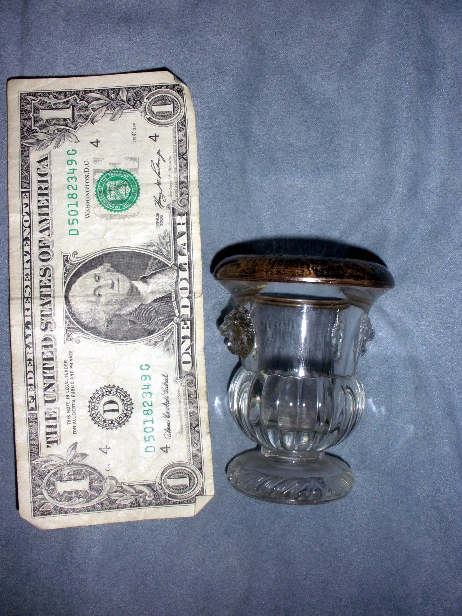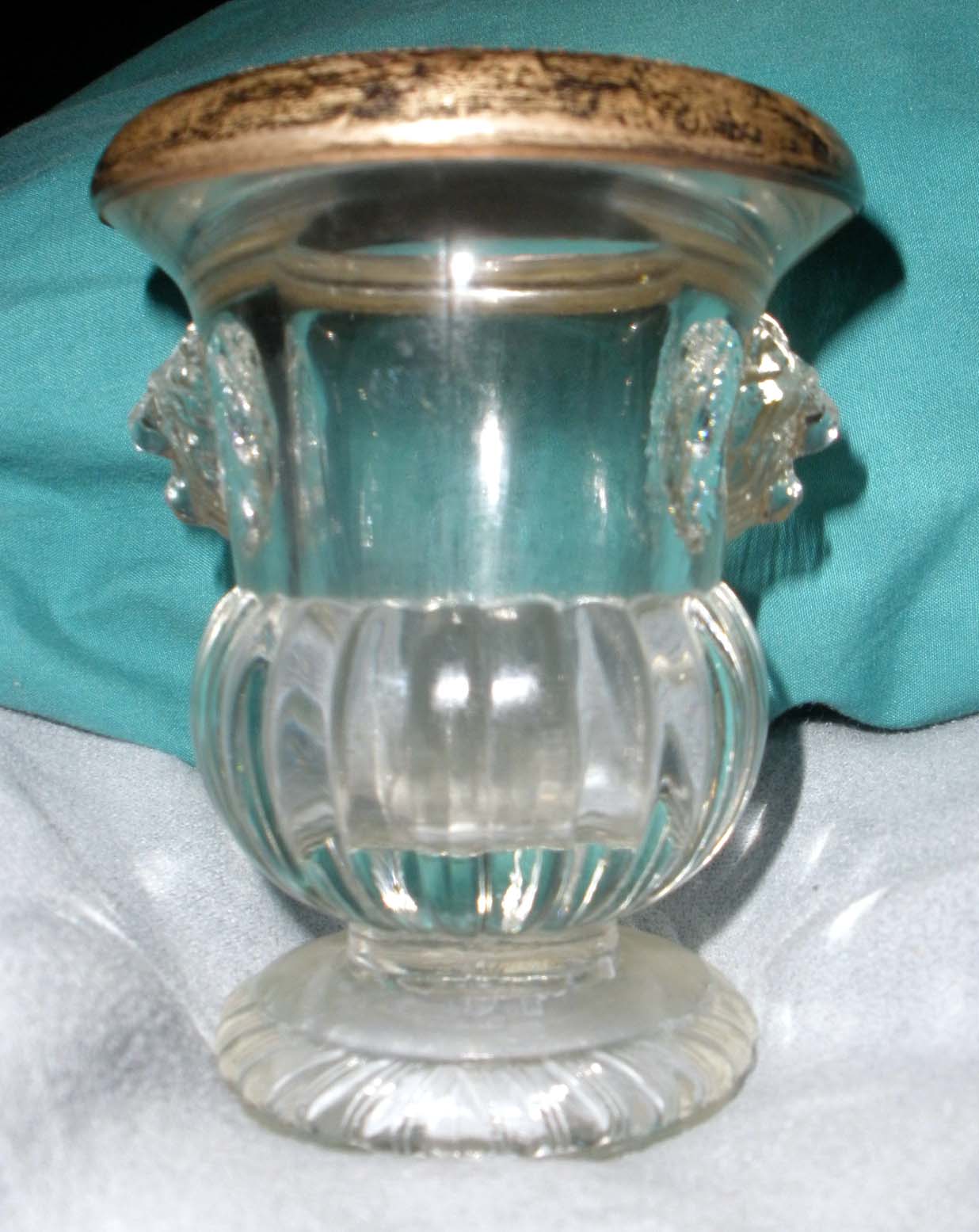 My Mom had this for as long as I can remember. (I'm 57) Its a glass toothpick holder, with 2 lion heads on it. The top is rimmed in what looks to be silfer. (I didn't clean it, so you can see that its turned in color). Its about 2-3 inches tall.