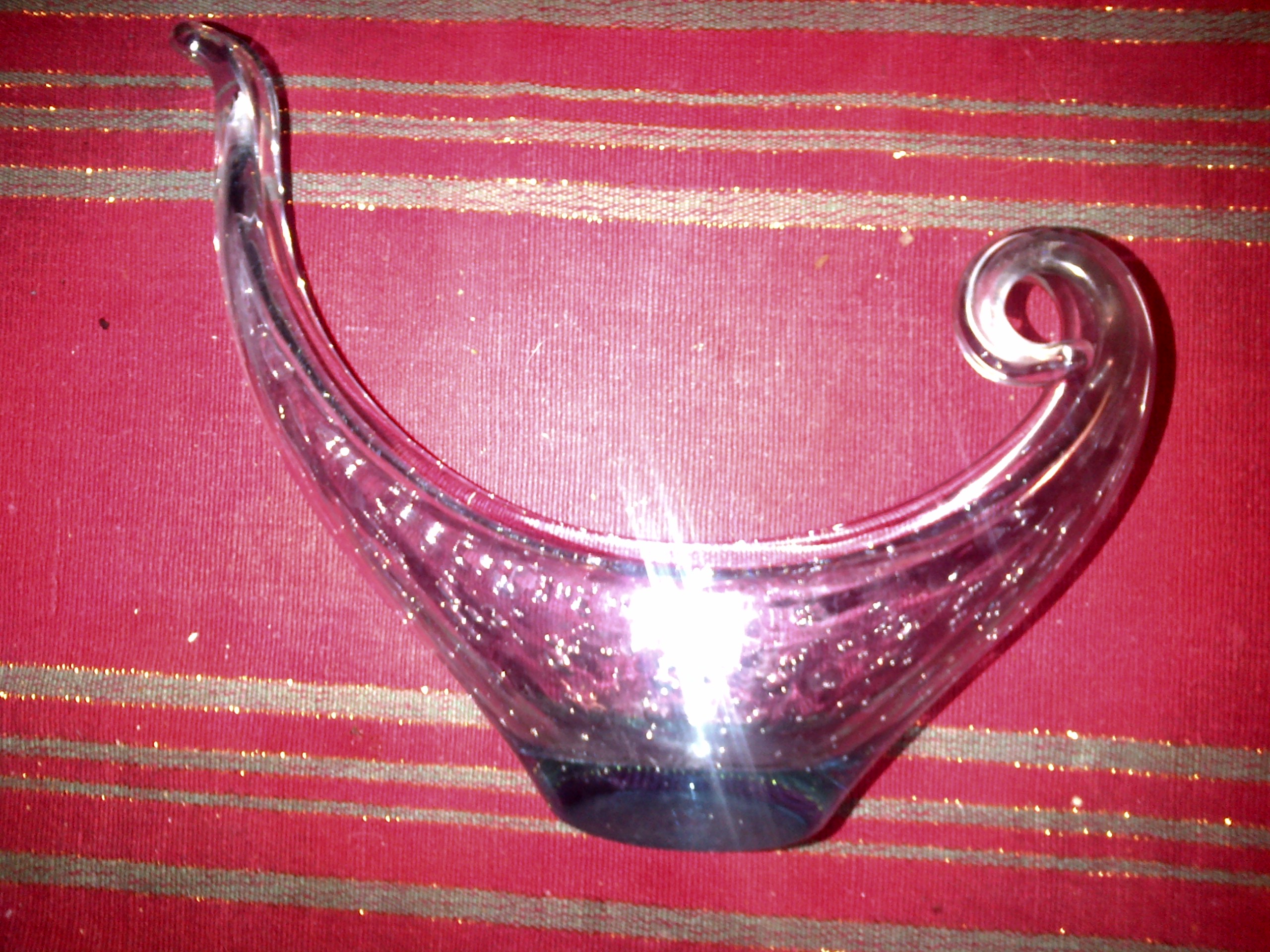 Beautiful light blue vase. I can find no markings on the bottom of the piece. There are bubbles inside the glass and they are circular but extended as the sides are pulled. I can see no seam marks in the vase. The bottom is think approximately 1.5 inches.  It shines brillantly in the light. It maintains it's colour and doesn't have the appearance of the coke bottle type glass.