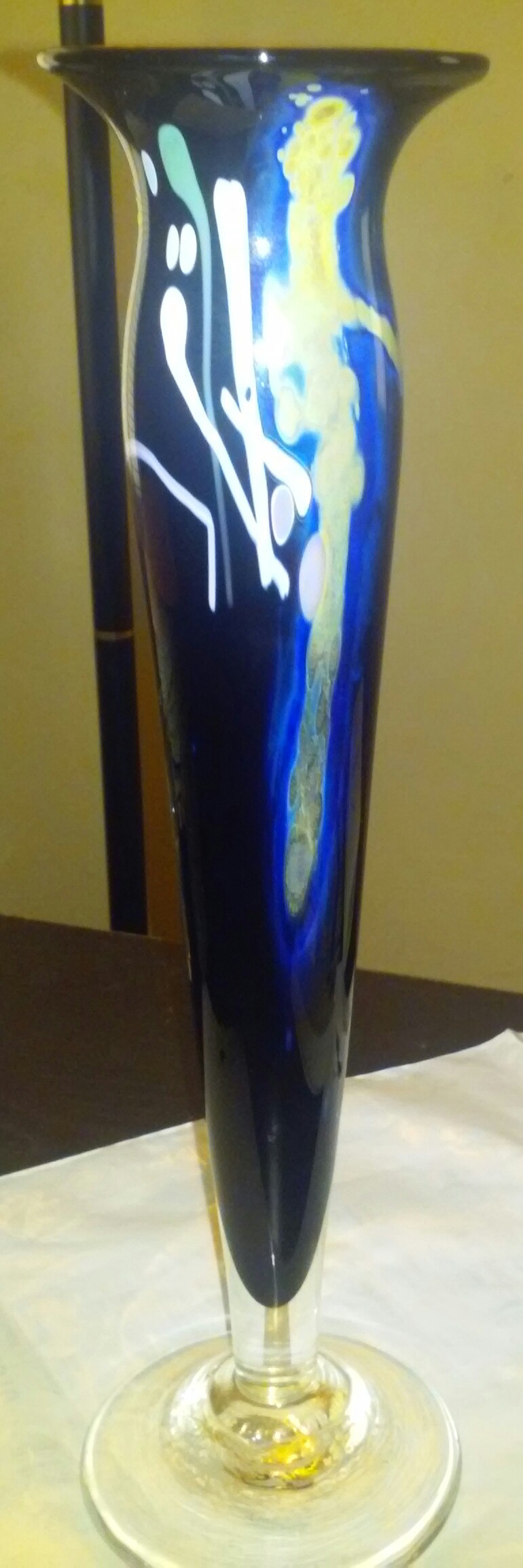 It is dark purple appears black has this beautiful deep blue and gold artistic coloring .See a signature can't make it out.