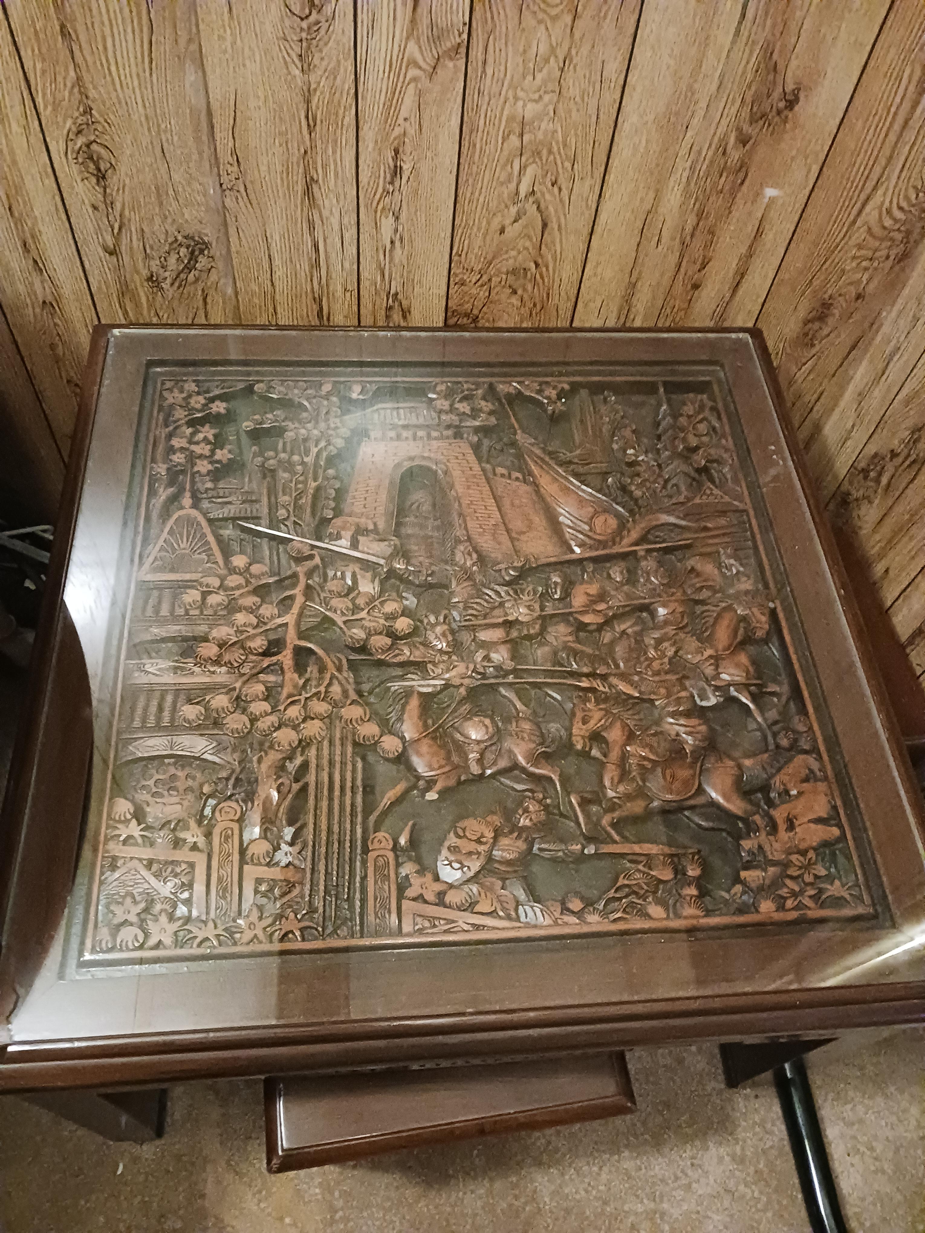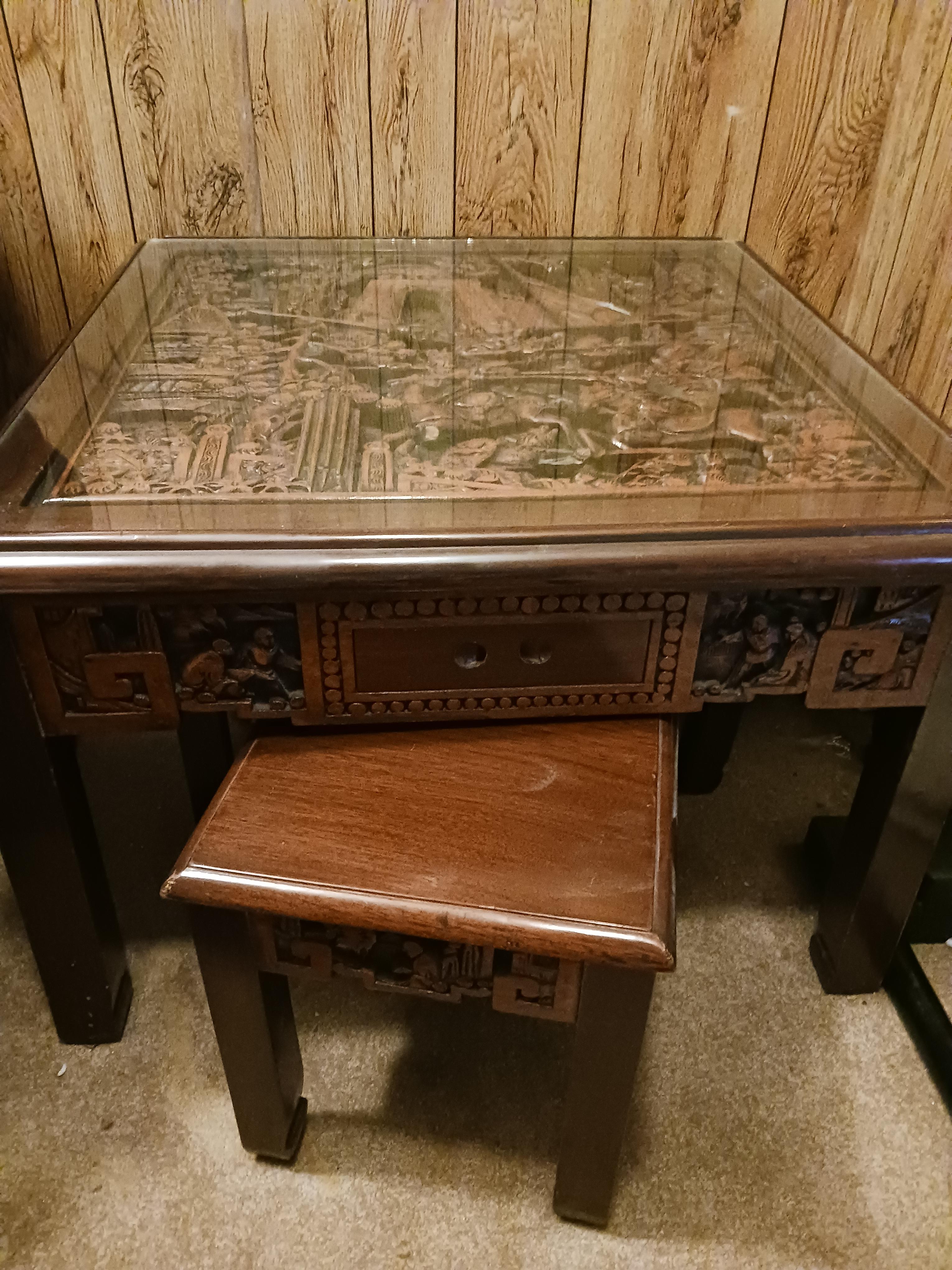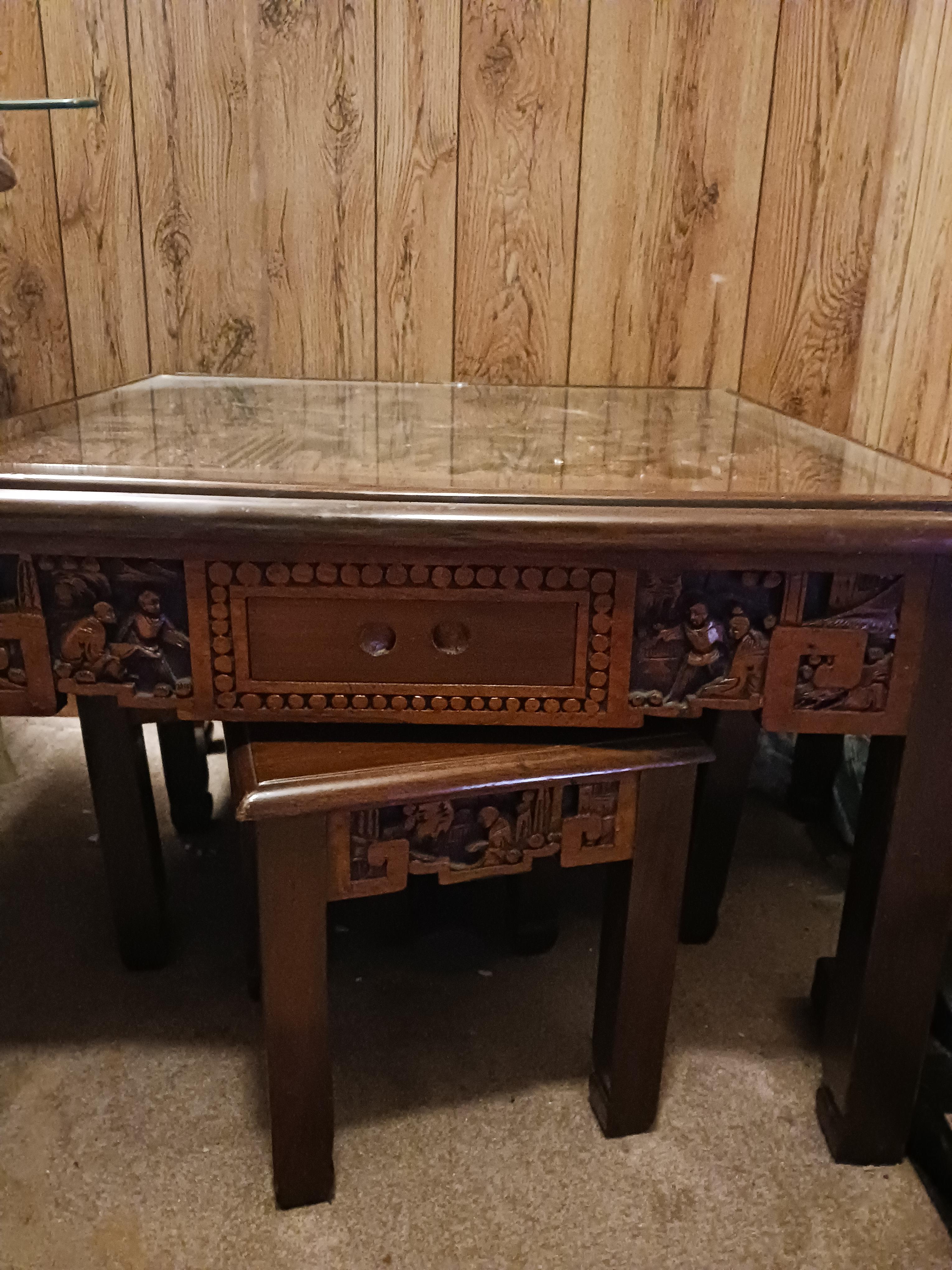 This is a handcarved glasstop table with 4 stools and 2 drawers. It's in good condition. It has a small chip on the corner of the glass. It seems to be Asian type carvings. Would like to know it's value...