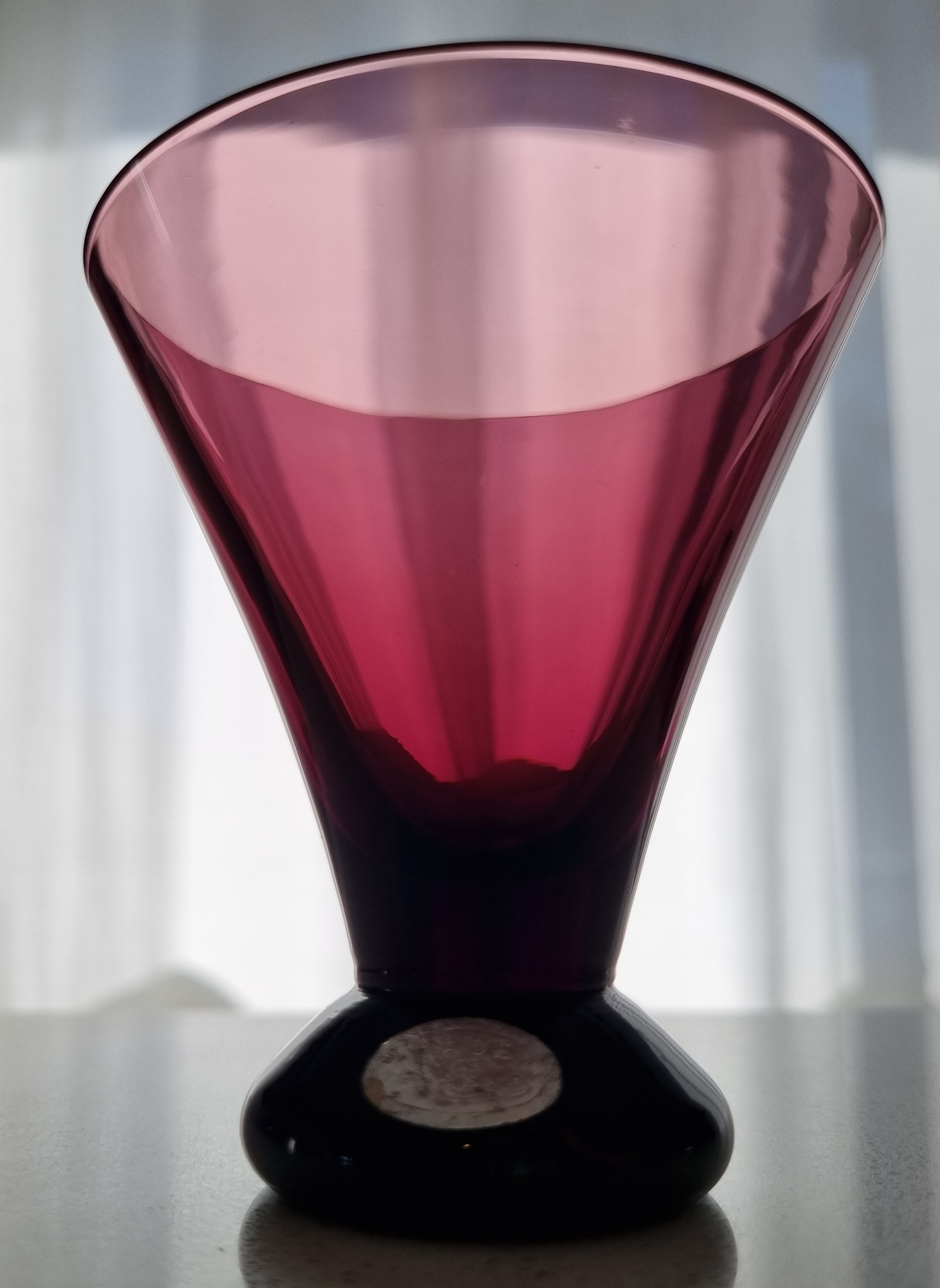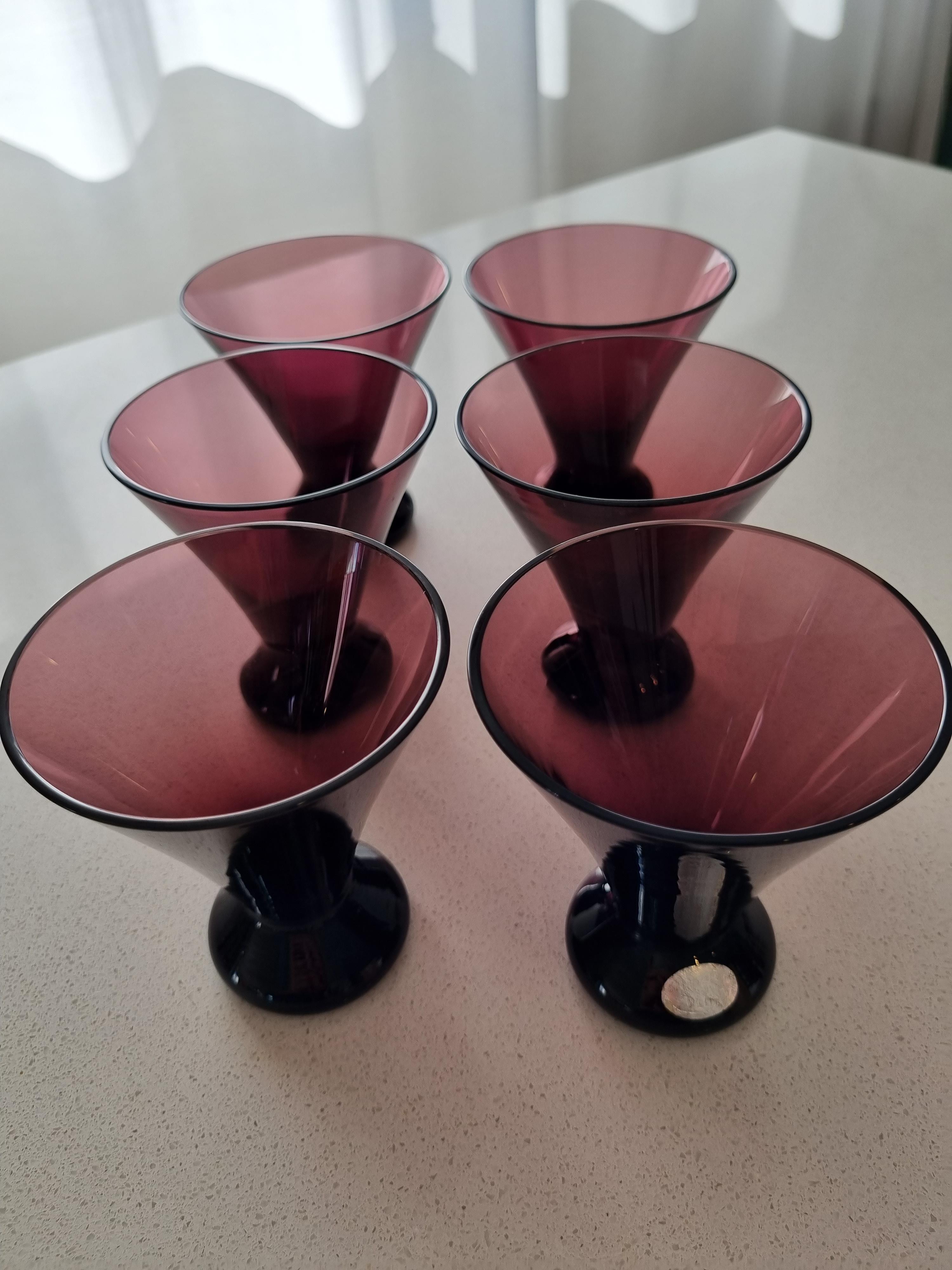 The first are a set of 6 amethyst coloured glasses 8cm high, excellent condition, made in Poland.