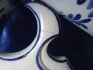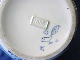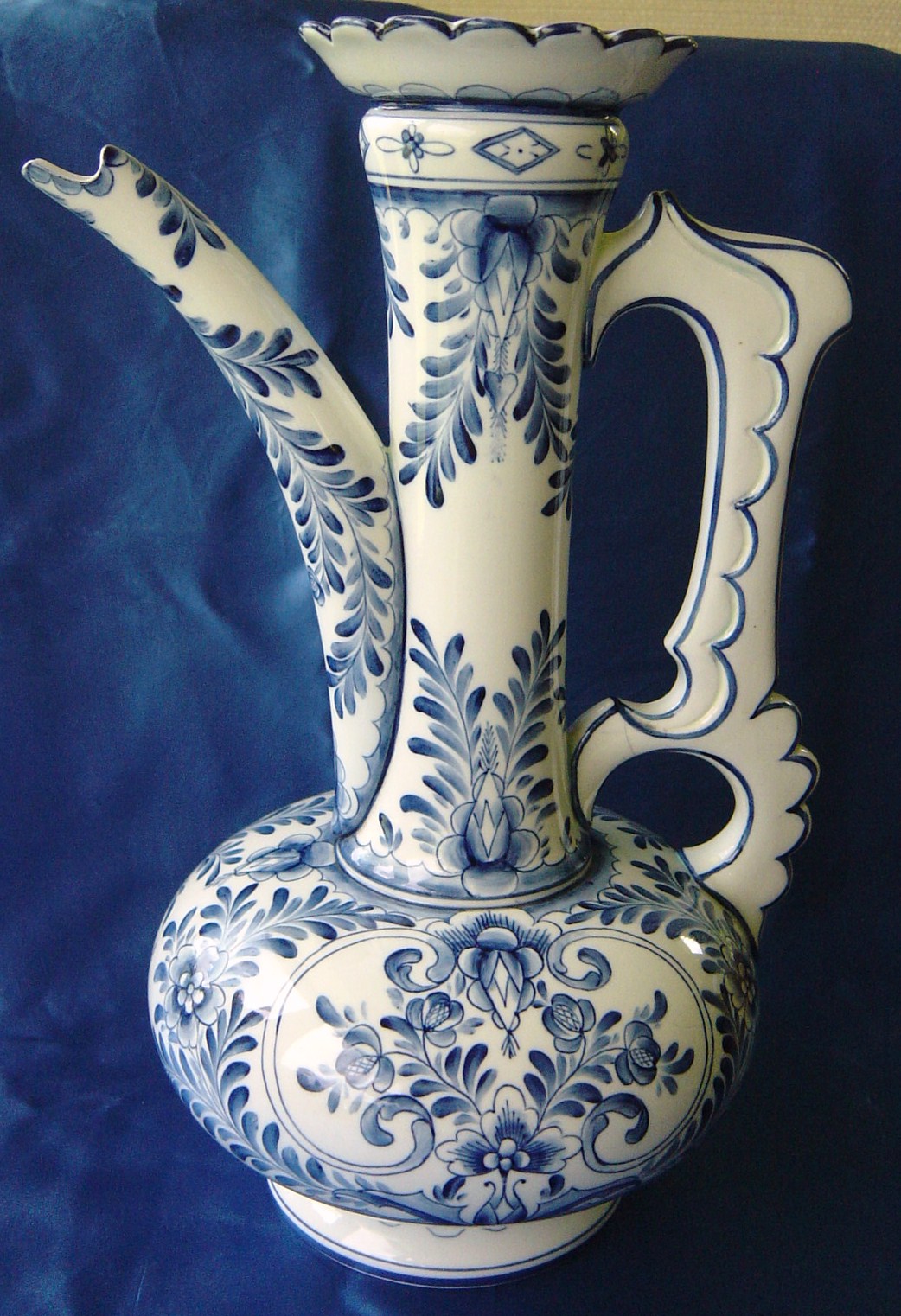 This is a very unusual ewer in very good condition. It had been at my grandmother's in Ohio until her death in 1976. Before she inherited it, my great, great uncle had it in his home in Covington KY until his death in 1929 at the age of 94. He had many lovely things, paintings, Victorian furniture, silver and boxes of books from as far back as 1731. The design over the entire pitcher is floral and leaves with a scalloped edge on the top.The handle attaches in three places: at the top of the neck,at the bottom of the neck and again on the bowl. There are no chips and only one small crack (see 3rd photo) that runs along the handle by the bottom of the neck and under the handle. The crack does not go through to the other side nor the top. It is hardly visible.
