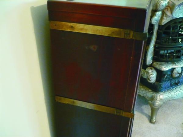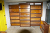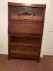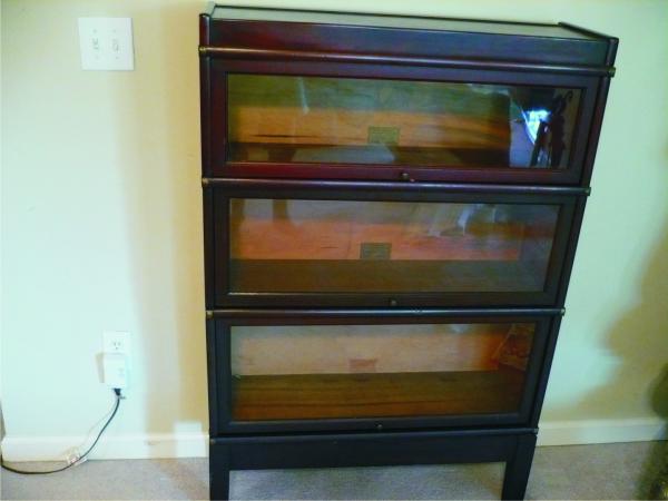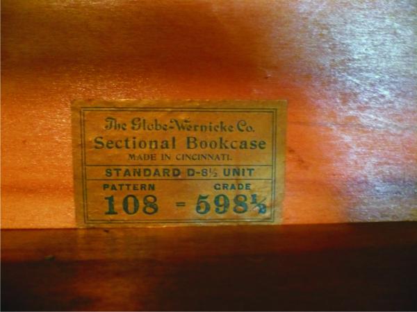 The bookcase you have was made by the Globe Wernicke Co. in Cincinnati, Ohio. It was made between 1900 and 1922. So it is very close to 100 years old. They quit making this "Standard" style in 1922. Each bookcase came with a factory label that denotes the style, wood, color, size and finish. The label you have shows to be a Grade 598 1/2. That means it is made of solid mahogony, has a medium dark dead finish, with dull brush-finished brass hardware. It is a D size case (12 in.) in depth, and 8 1/2 in. tall on the inside of the case. That means you should be able to put a book up to 8 1/2 in. tall in the bookcase. Here is a link to a site with more information about the Globe Wernicke bookcases. https://deepdoodoo.wordpress.com