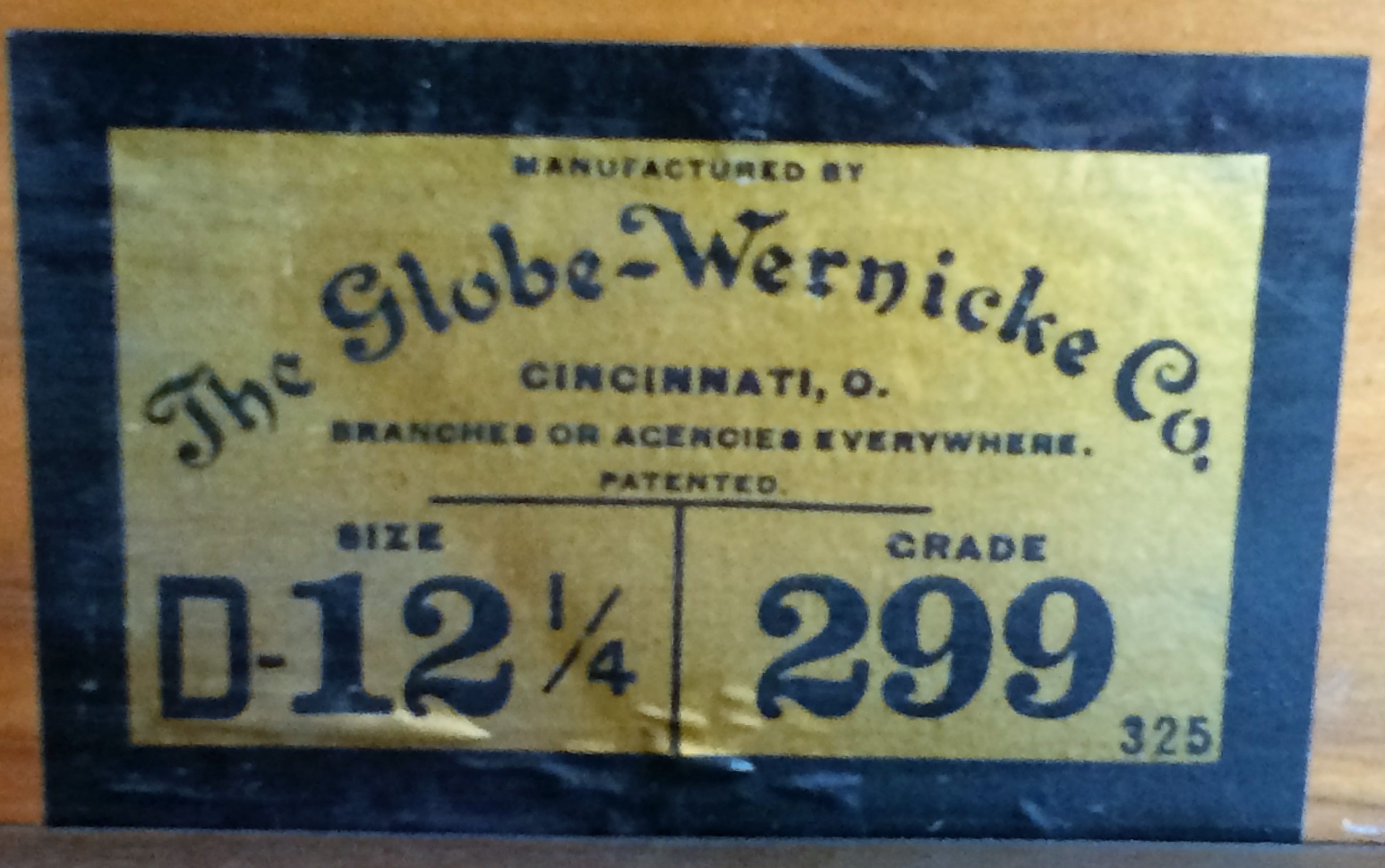 I found the following "The Grade of 299 on the label in the bookcase denotes its wood type, finish and color as it came from the factory in Cincinnati. Grade 299 stands for: quartered sawn figured oak, deep rich golden finish, highly polished with brass oxidized hardware."