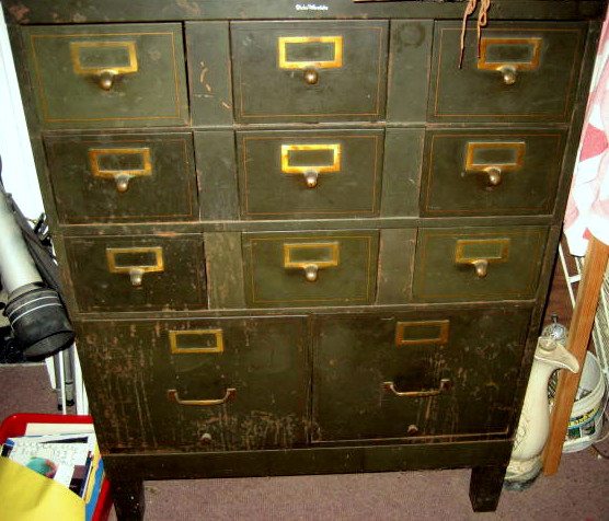 I am looking to find the value of this metal cabinet I have. It has 9 drawers at the top of the cabinet that are card file size (currently I store photographs in them). The bottom section has 2 file drawers which accommodate hanging files or standing files. It has never been refinished and does have some scratches and marks on it from actual use. It has six stacking sections which include; the bottom section with the feet, the next section with the file cabinets, the next three sections each have 3 card file drawers in each section and the final section is the actual top of the cabinet. I am not sure how much it weighs, but we have always moved it in sections because of the weight. The drawer label holders and drawer pulls are brass.