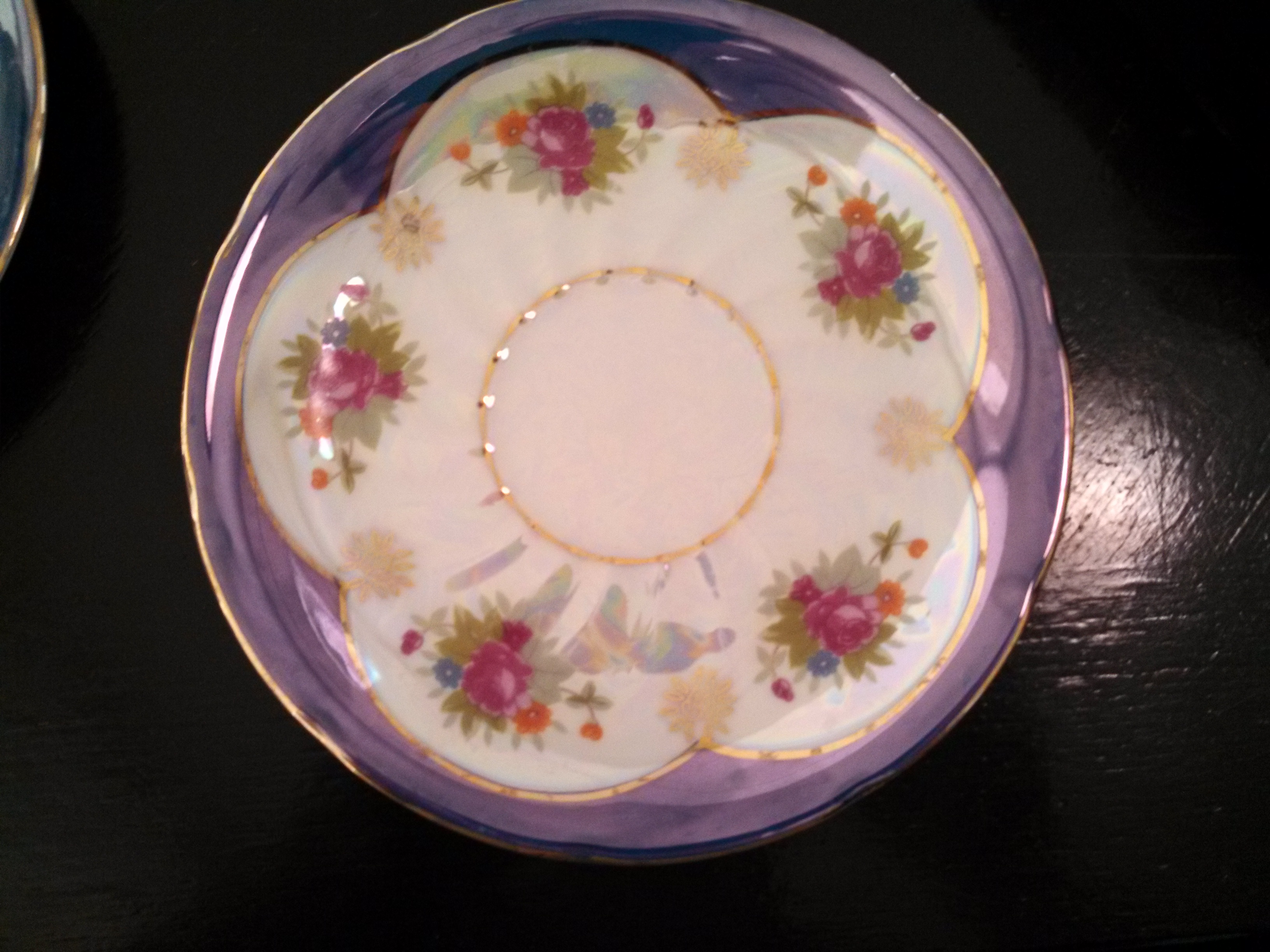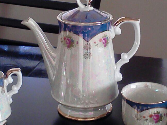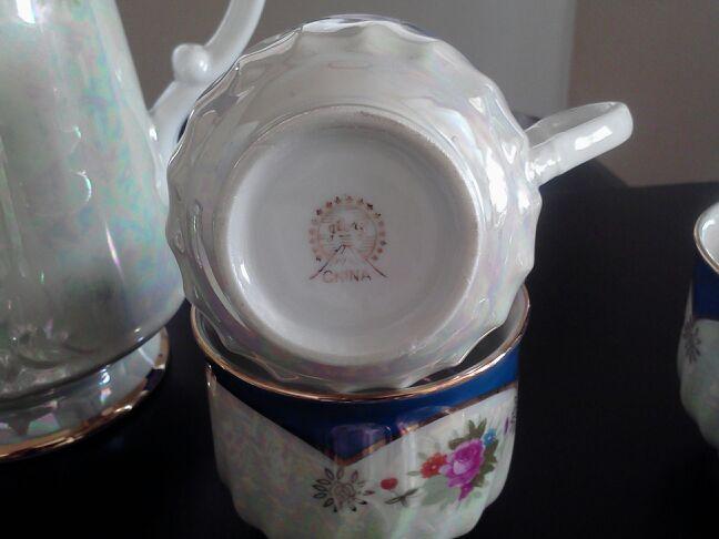 13 piece glory china set made in Japan. Excellent condition. Beautiful iridescent color with blue border and gold trim, floral print pink rose surrounded by green leaves with blue and orange flowers.