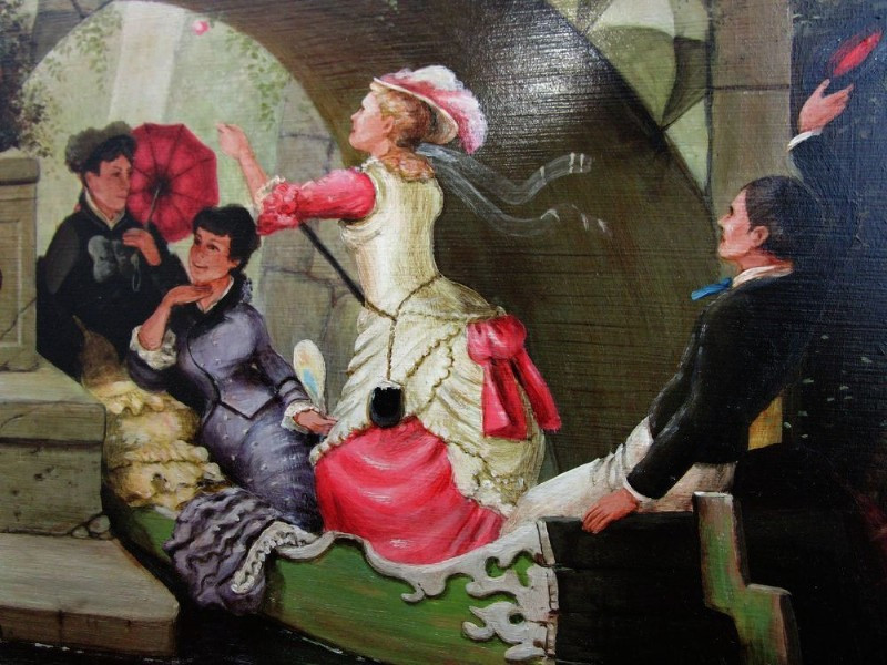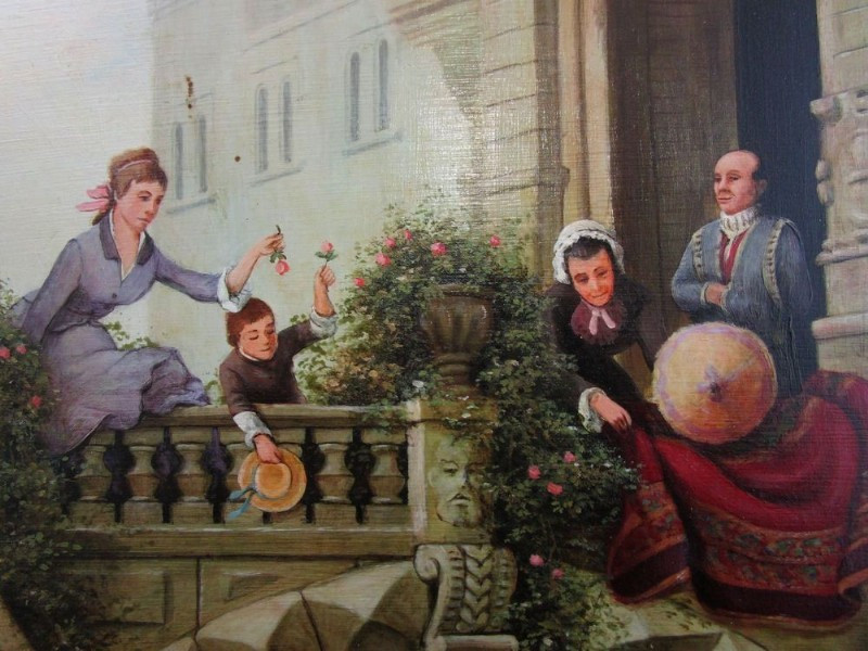 This particular piece portrays a European courtship scene on a bridge and staircase beside a canal, featuring: