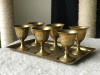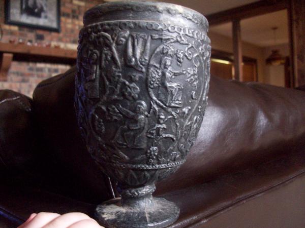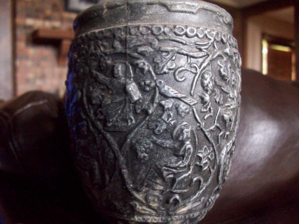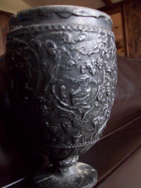 The goblet appears to be made out of pewter or something similar. There are what appears to be men sitting on a chair doing different things, i.e. one is holding a bird. There are also lots of flowers,vines,leaves,grapes and birds.