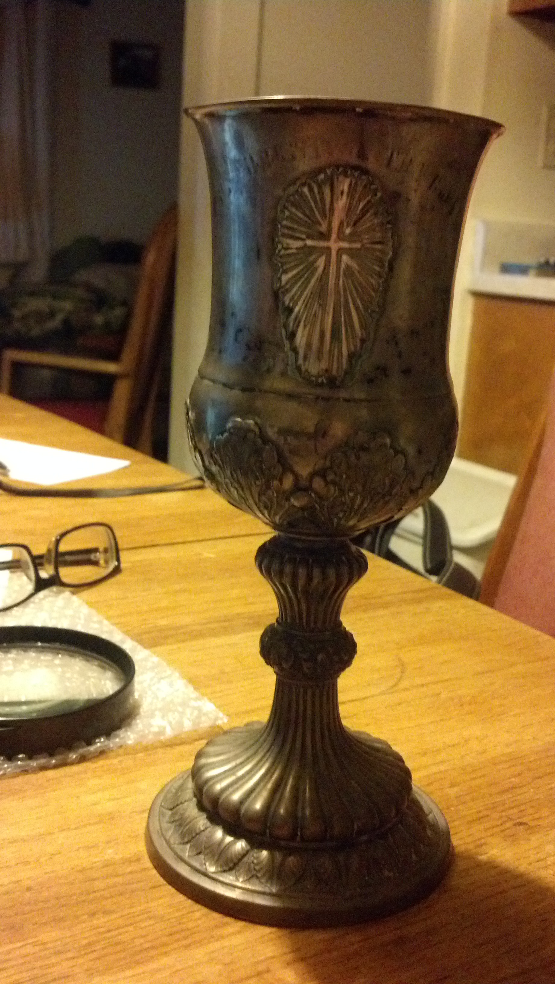 A pewter communion chalice, and by the looks of it it was once silver plated. Given the poor market for pewter and the fact that the silverplating is essentialy worn down to nothing, I'm afraid I'd have to say that $50 is optimistic.