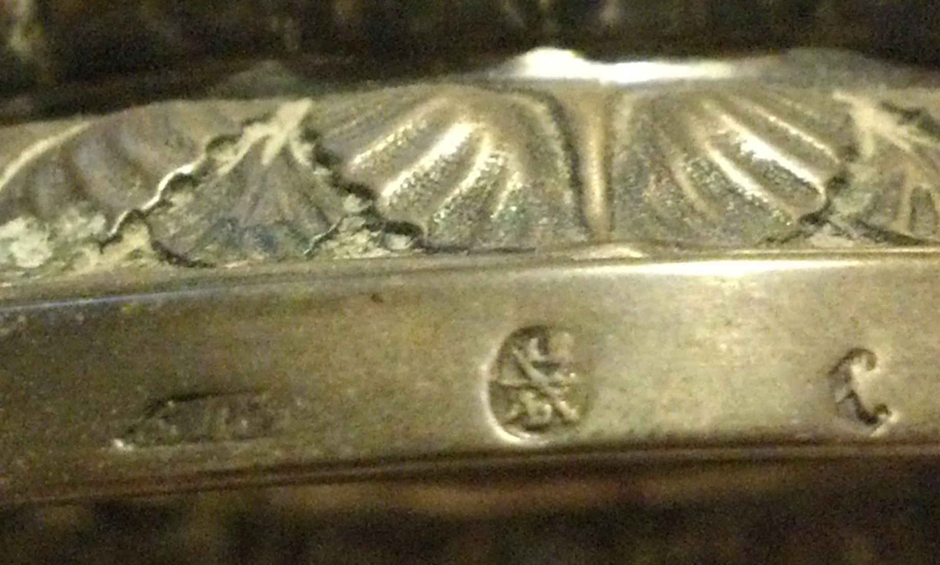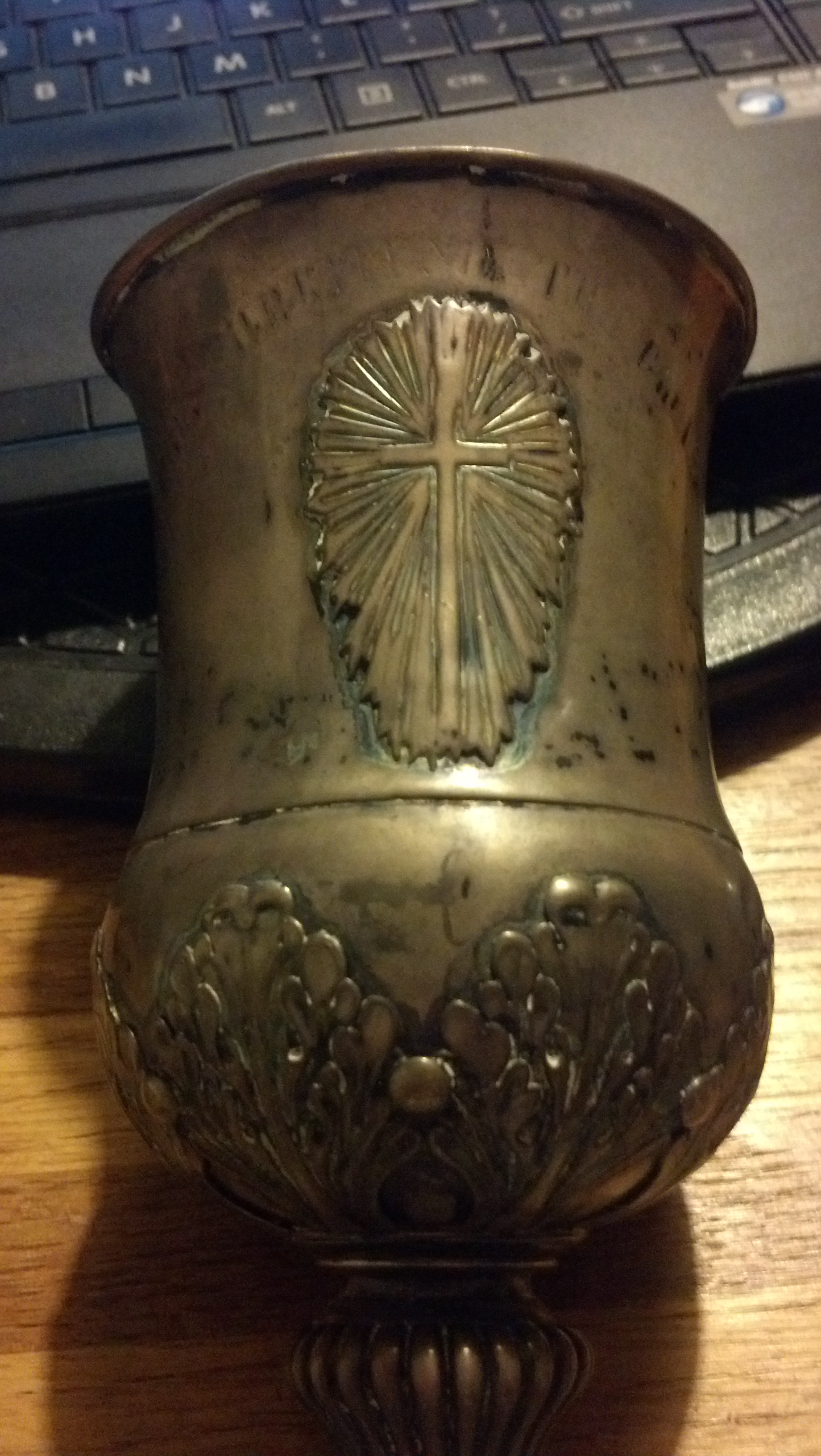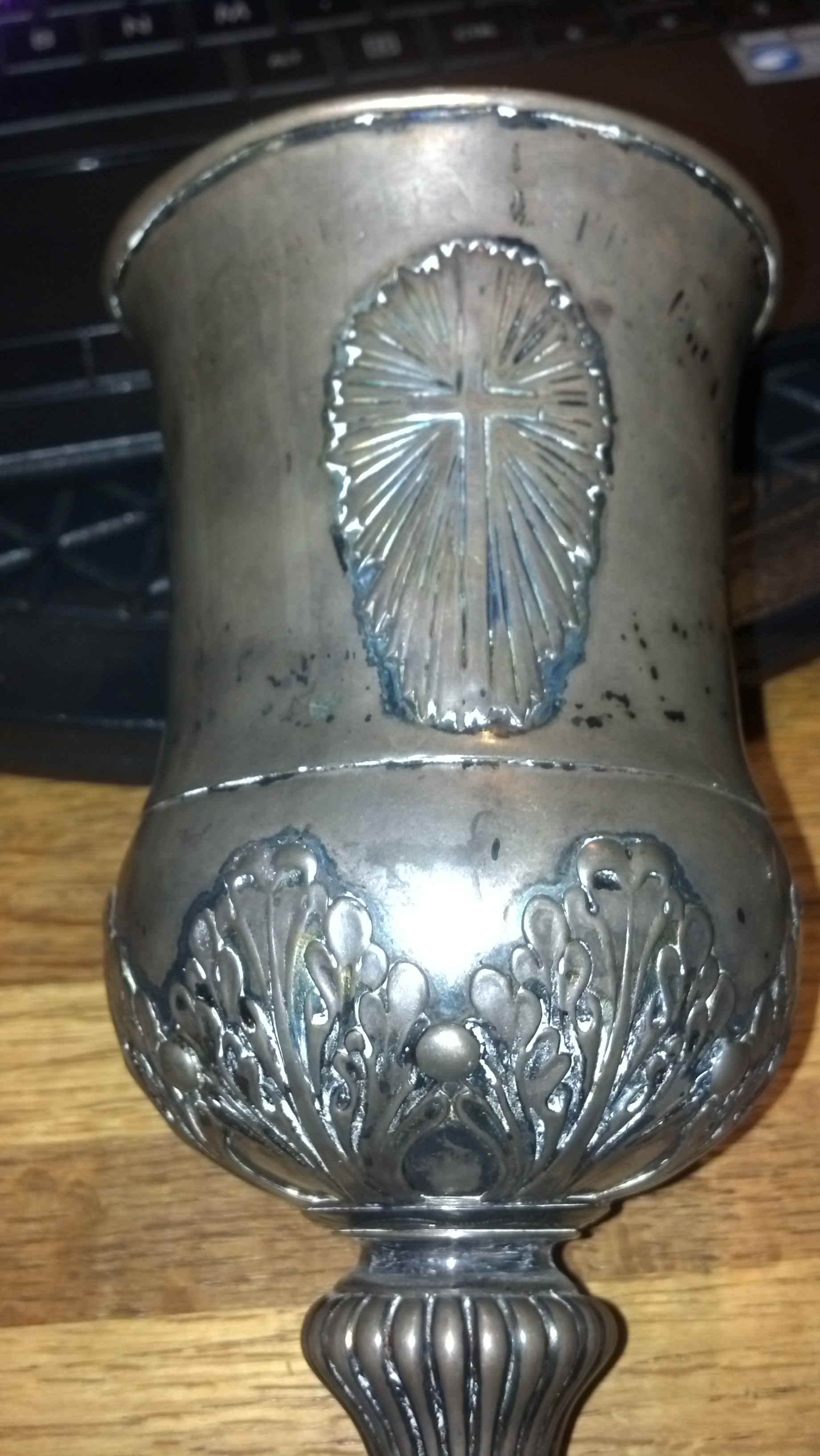 I believe i have learned that it is made out of a stannum element. the base of the cup and the cross appear to have a "rainbow" effect. the makers marks on the rim appear to be " GMR or GMK " and the middle image looks to be 2 crossed swords, and the last one is a "C"... there is also wording above the cross in an arch that from what i can make out says: