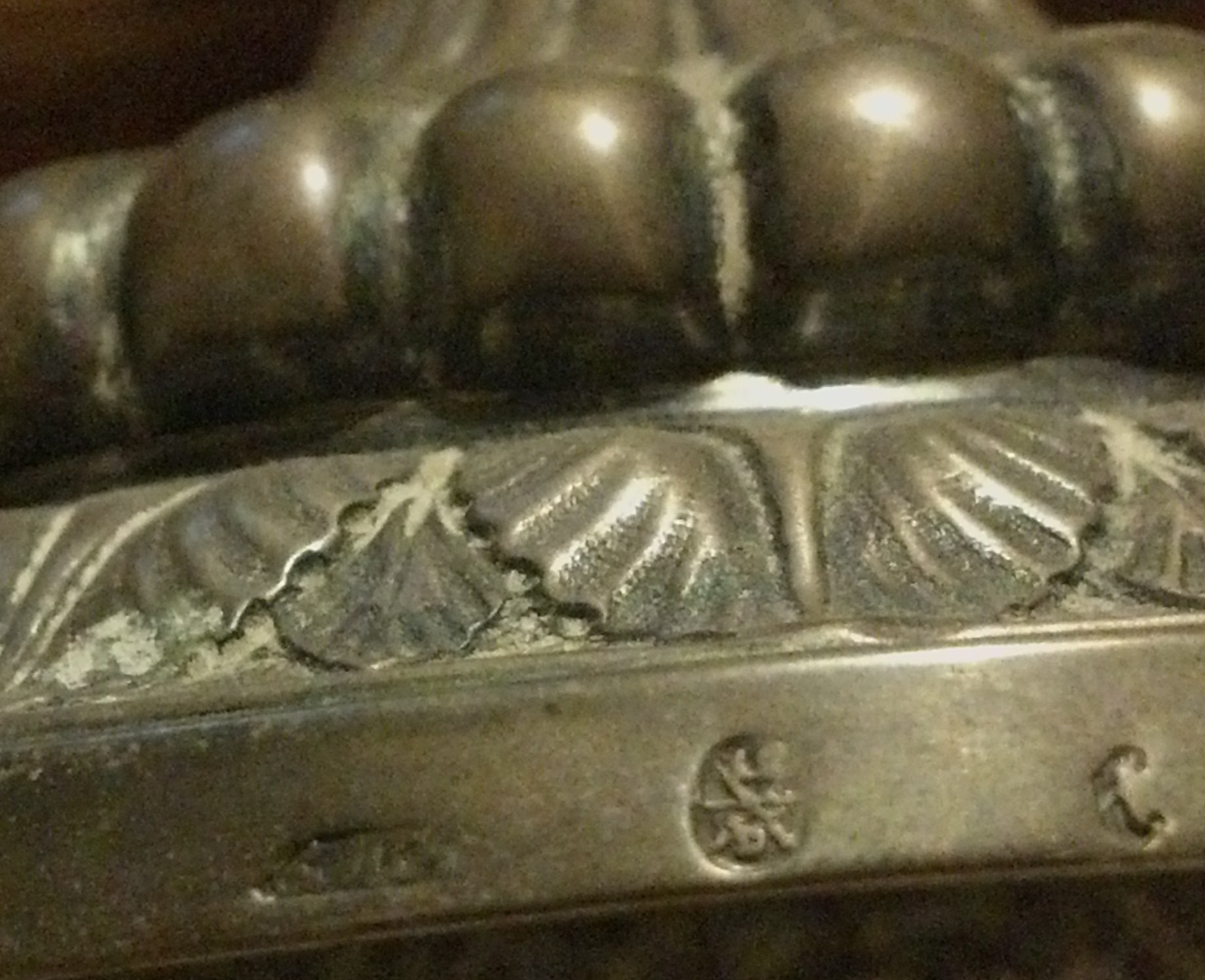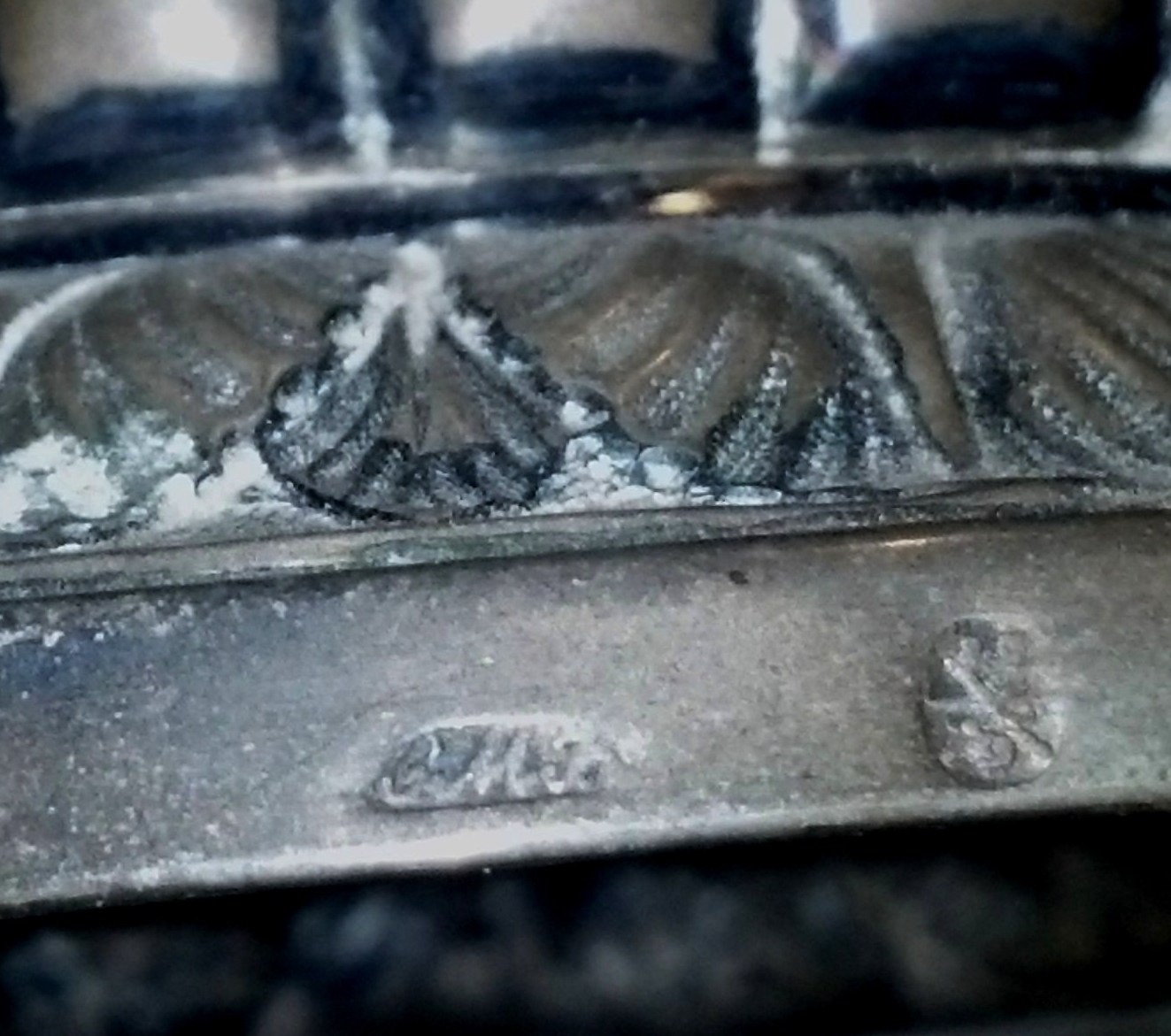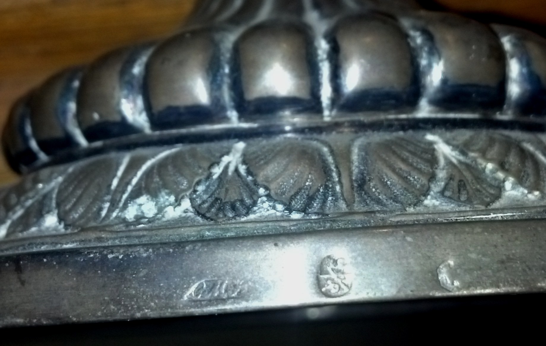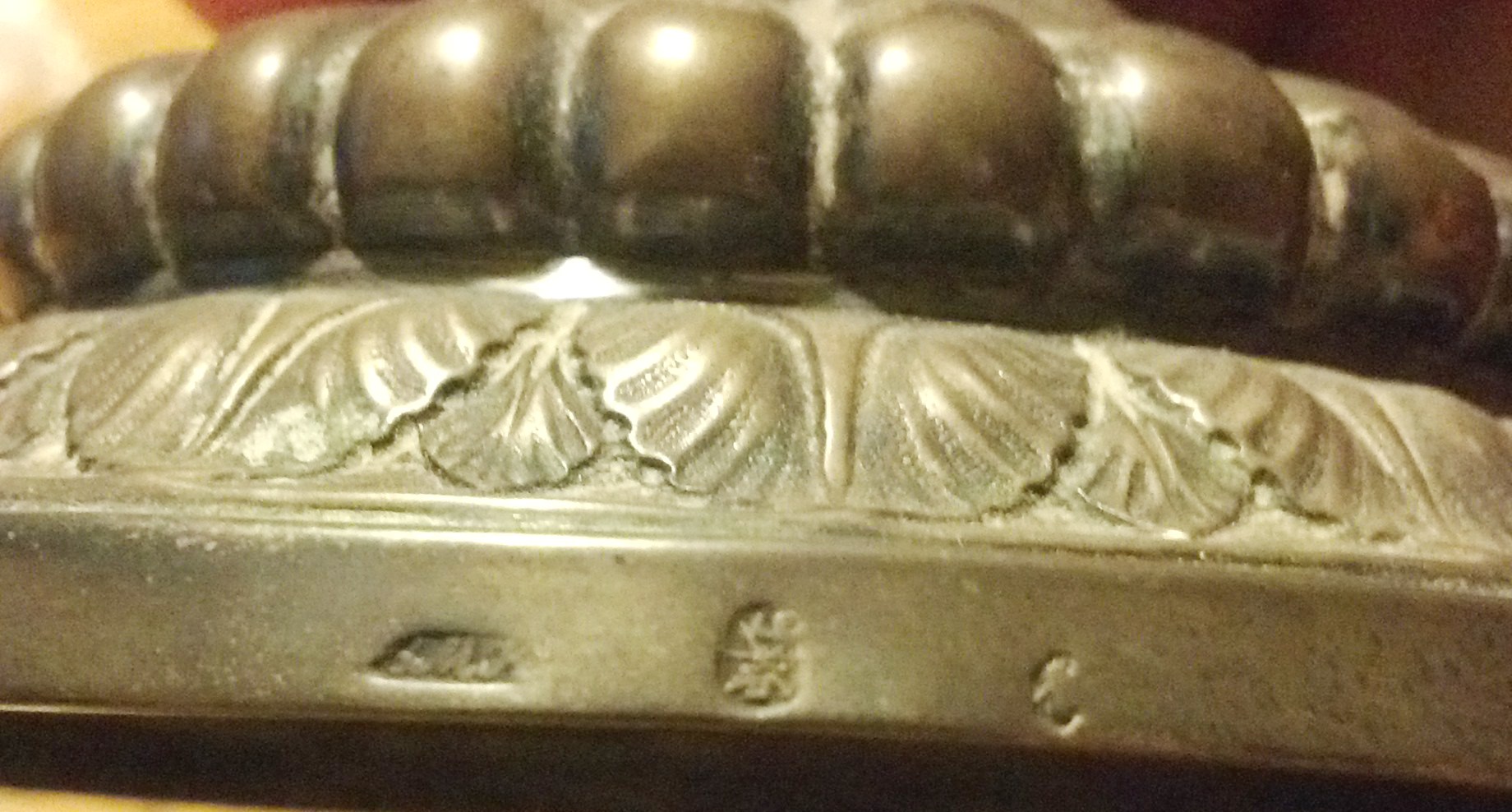 I believe i have learned that it is made out of a stannum element. the base of the cup and the cross appear to have a "rainbow" effect. the makers marks on the rim appear to be " GMR or GMK " and the middle image looks to be 2 crossed swords, and the last one is a "C"... there is also wording above the cross in an arch that from what i can make out says: