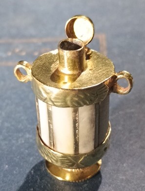 Physical Description: This item is a small cylindrical holder, likely made from a combination of gold and a white material, possibly bone or ivory. The holder features a decorative design with two loops on either side, suggesting it may have been used as a pendant or for hanging. The top has a small lid that opens, revealing a hollow interior, which may have contained ash or another substance. The dimensions are not provided, but it appears to fit comfortably in the palm of a hand.