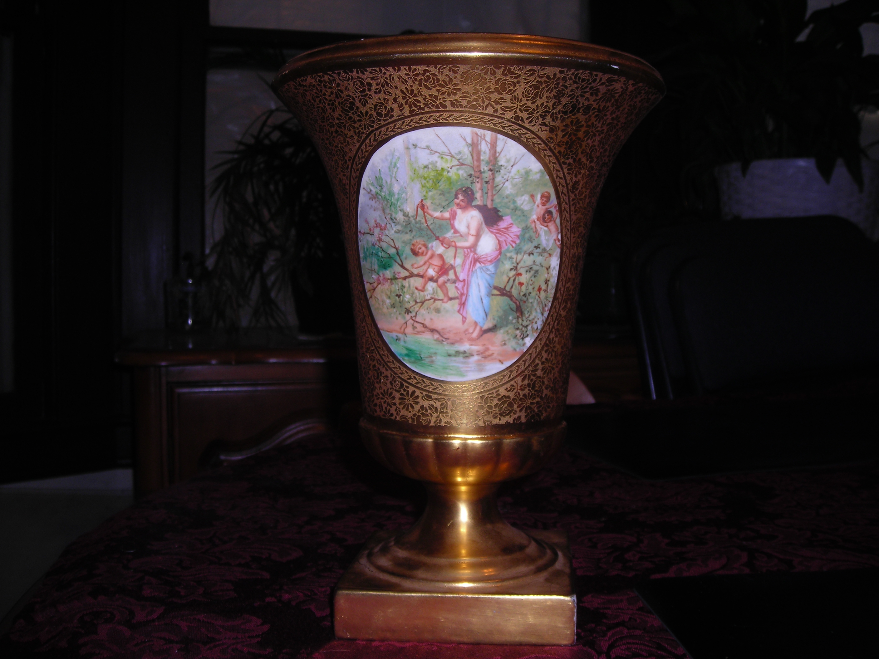 This is about 10 in tall 4 in wide mouth gold covered Porcelain Floral with a hand painted women with child in middle I no it is well over fifty years old and is marked on the bottom with two lines trying to find out if anyone has seen or knows anything about it been passed down thru my family just Curious