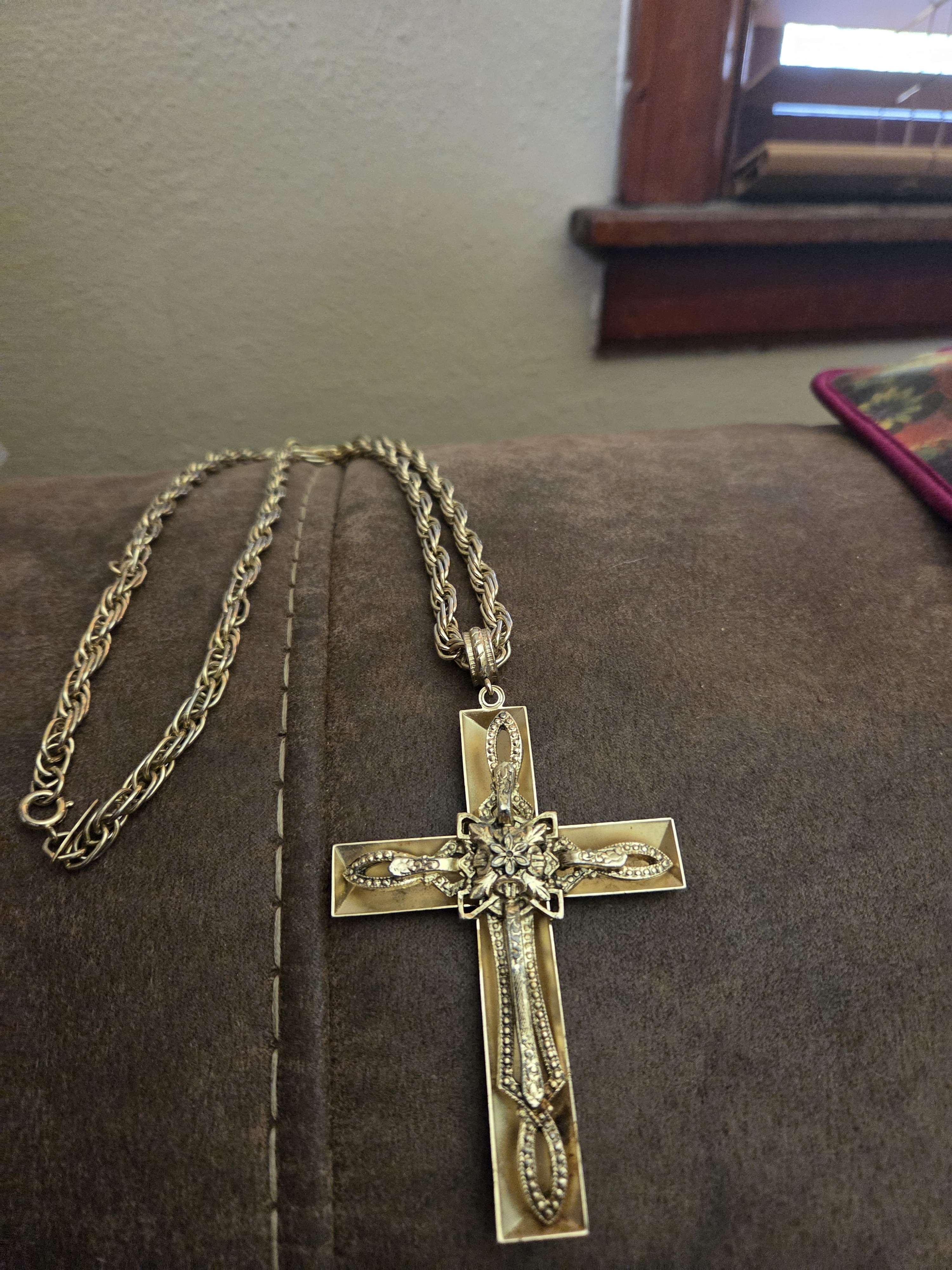 This is a detailed and attractive gold-tone cross pendant likely crafted as either mid-century costume jewelry or a gold-plated devotional piece. If confirmed solid gold, its value increases significantly, especially with a substantial chain and intricate craftsmanship. Until verified, the value should be conservatively placed in the $25–$75 range, with significant upside if it proves to be 10K or 14K solid gold