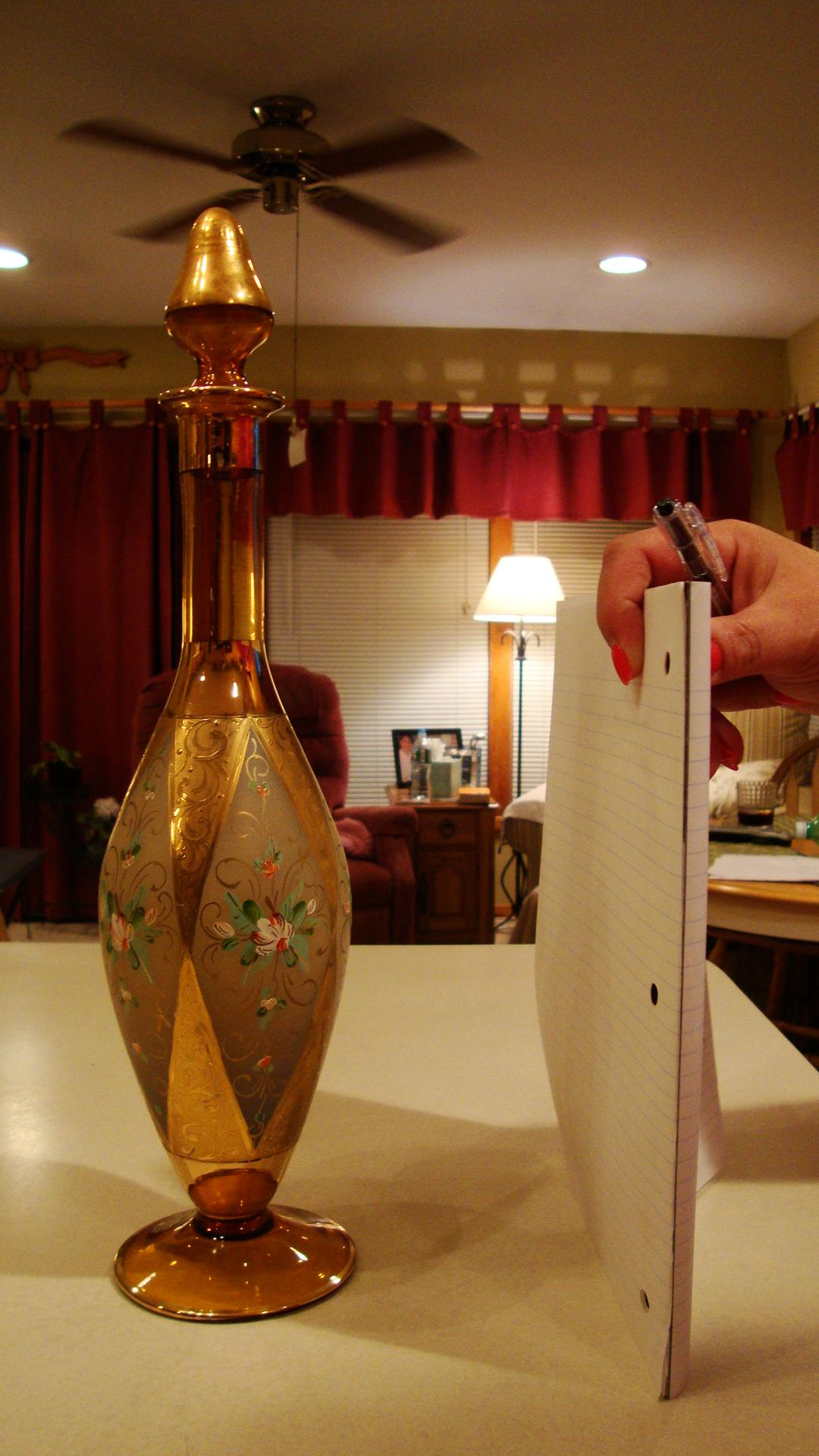 Glass, hand blown decanter with geometric green and pink floral design, over a foot tall, with a glass stopper. 18 KR gold decorations on center of decanter.