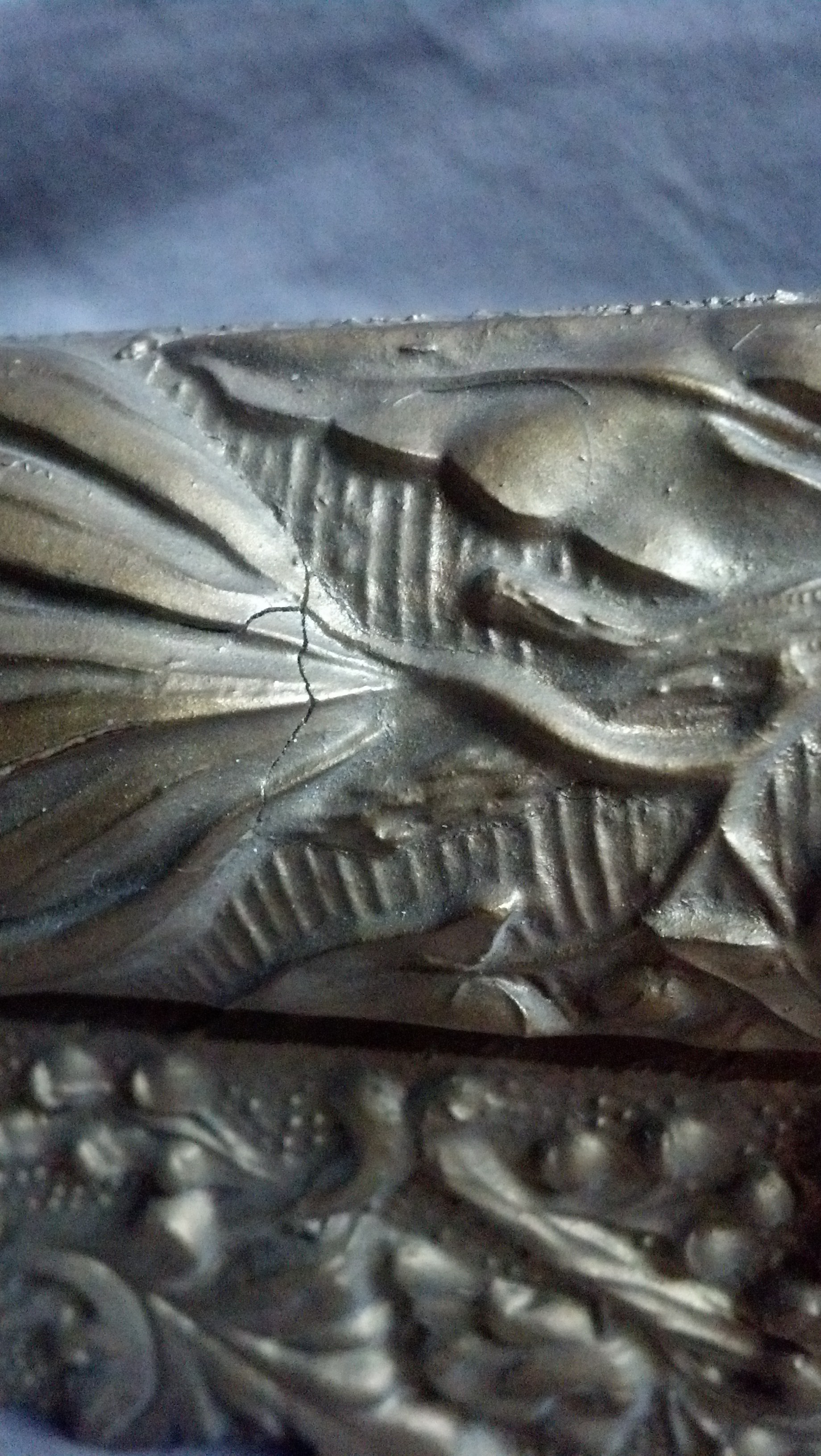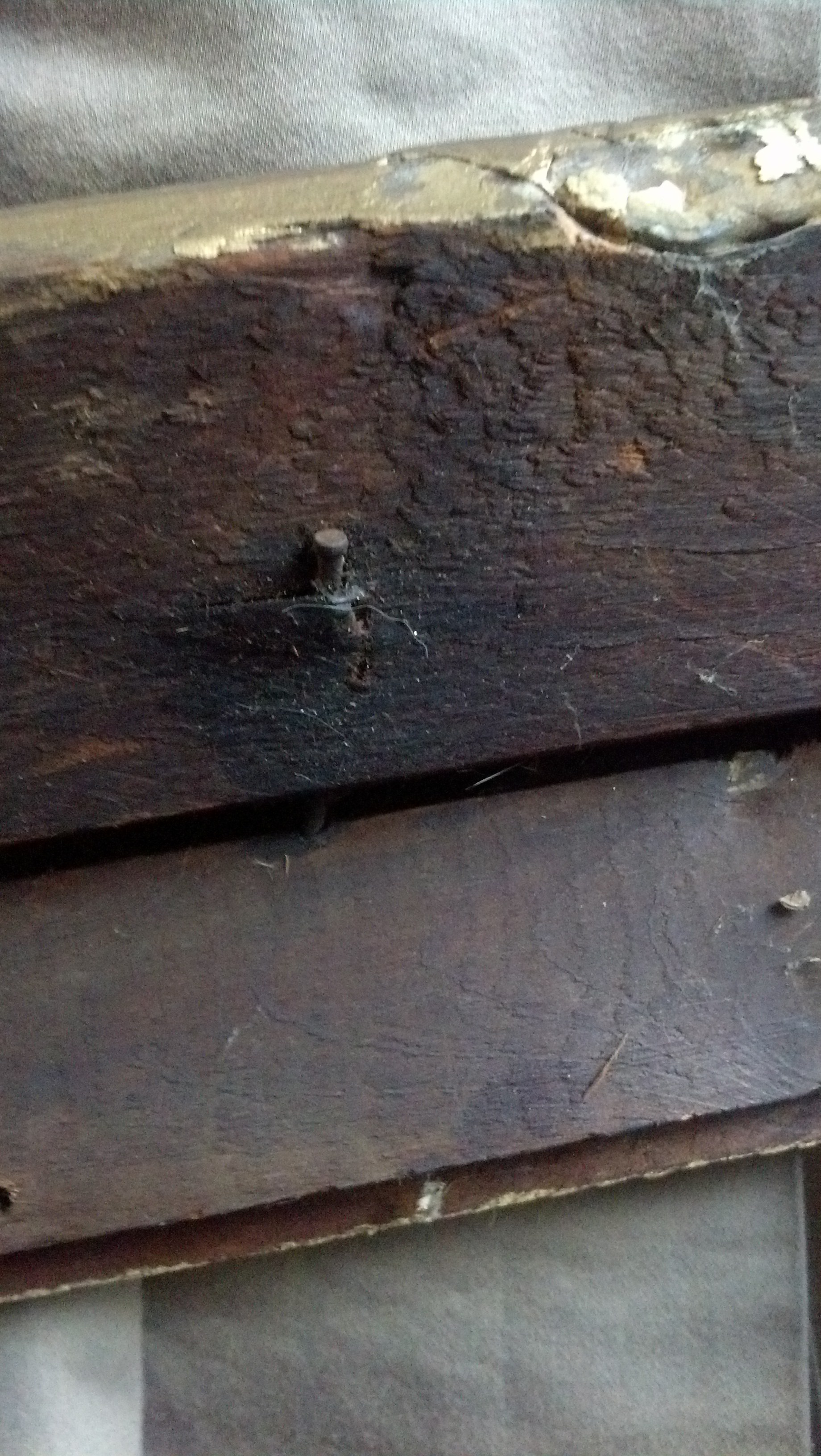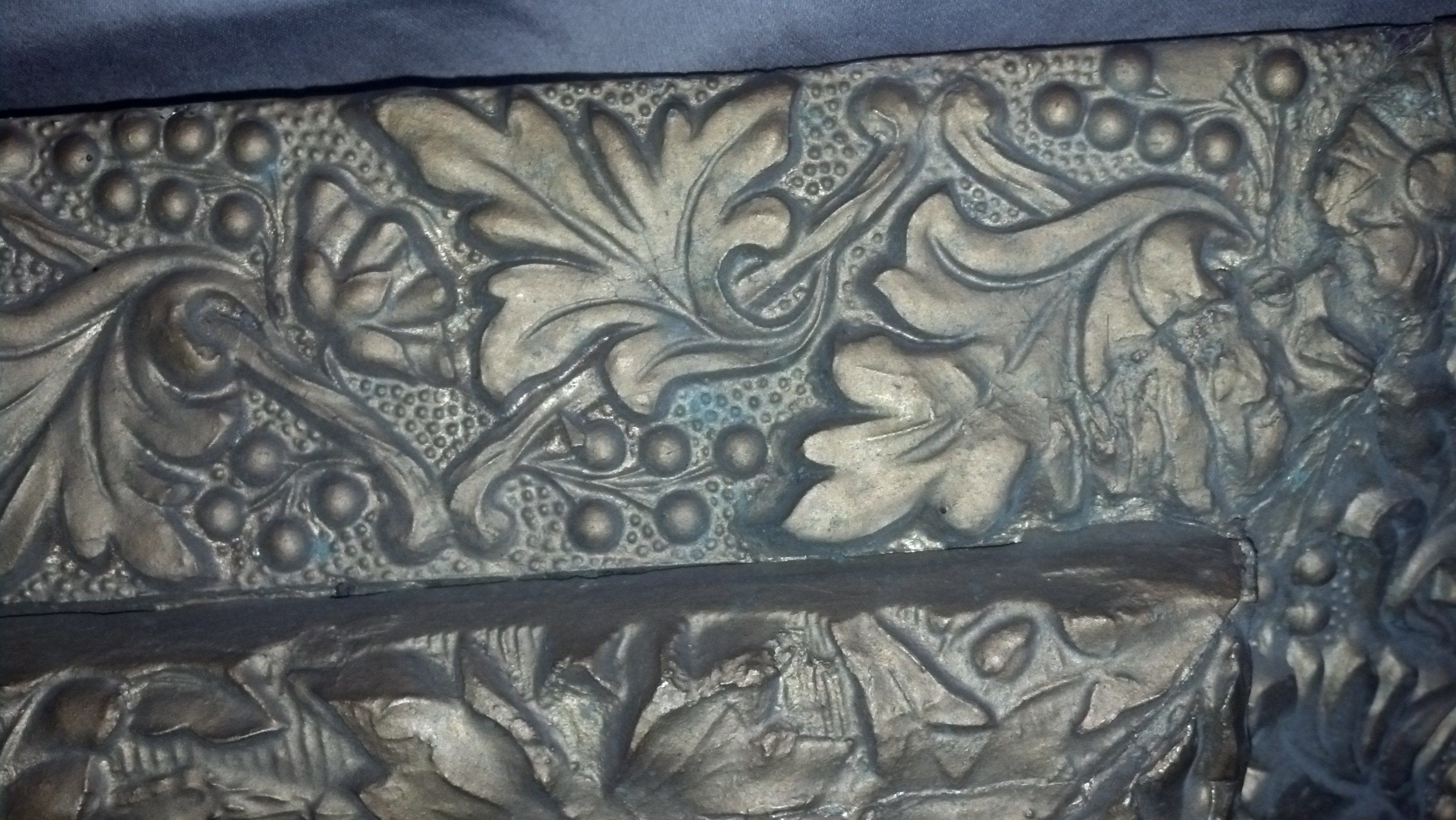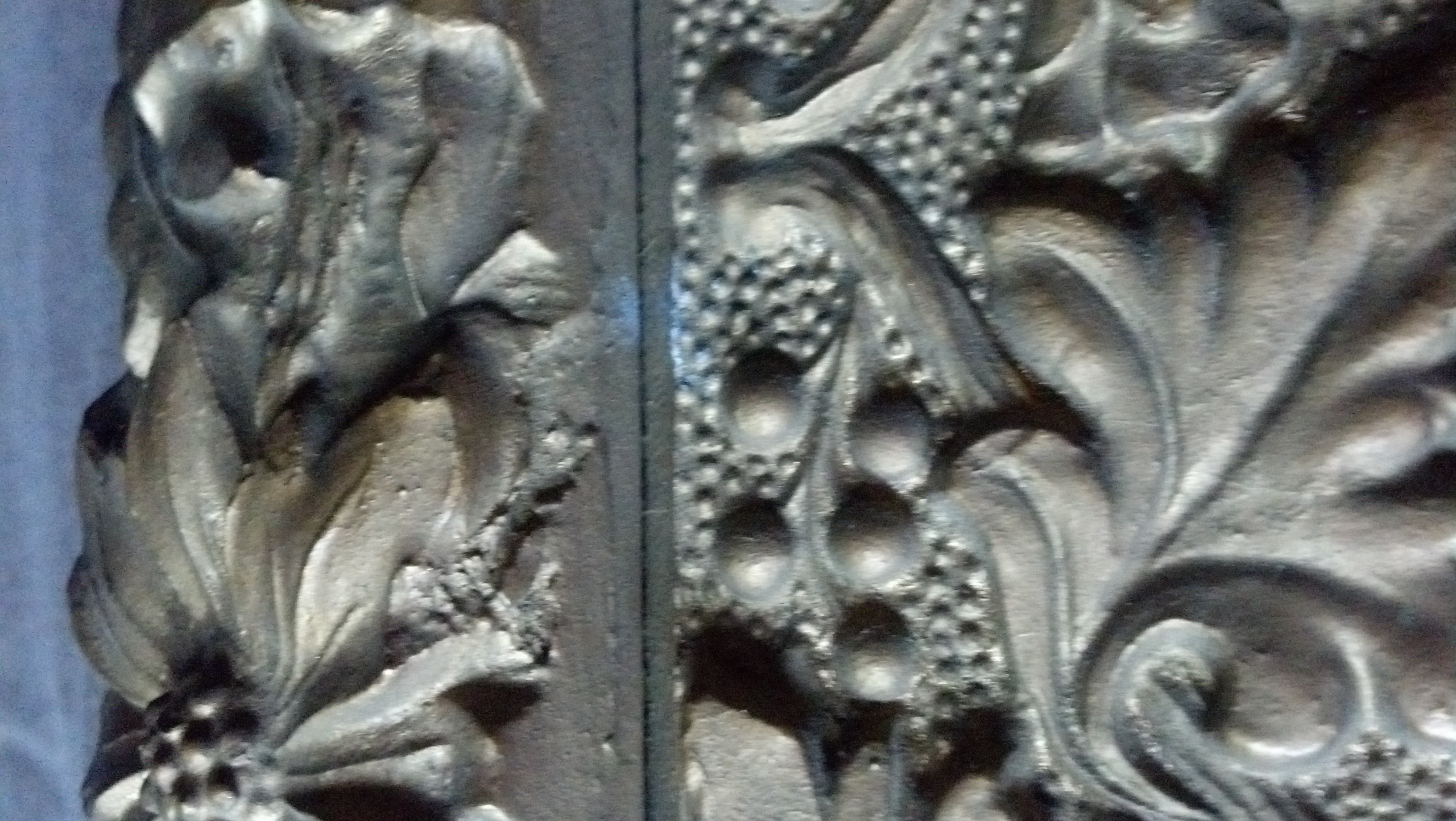 wood, wood carved mouldings that appear to be oak leaves, berries, and daisies.