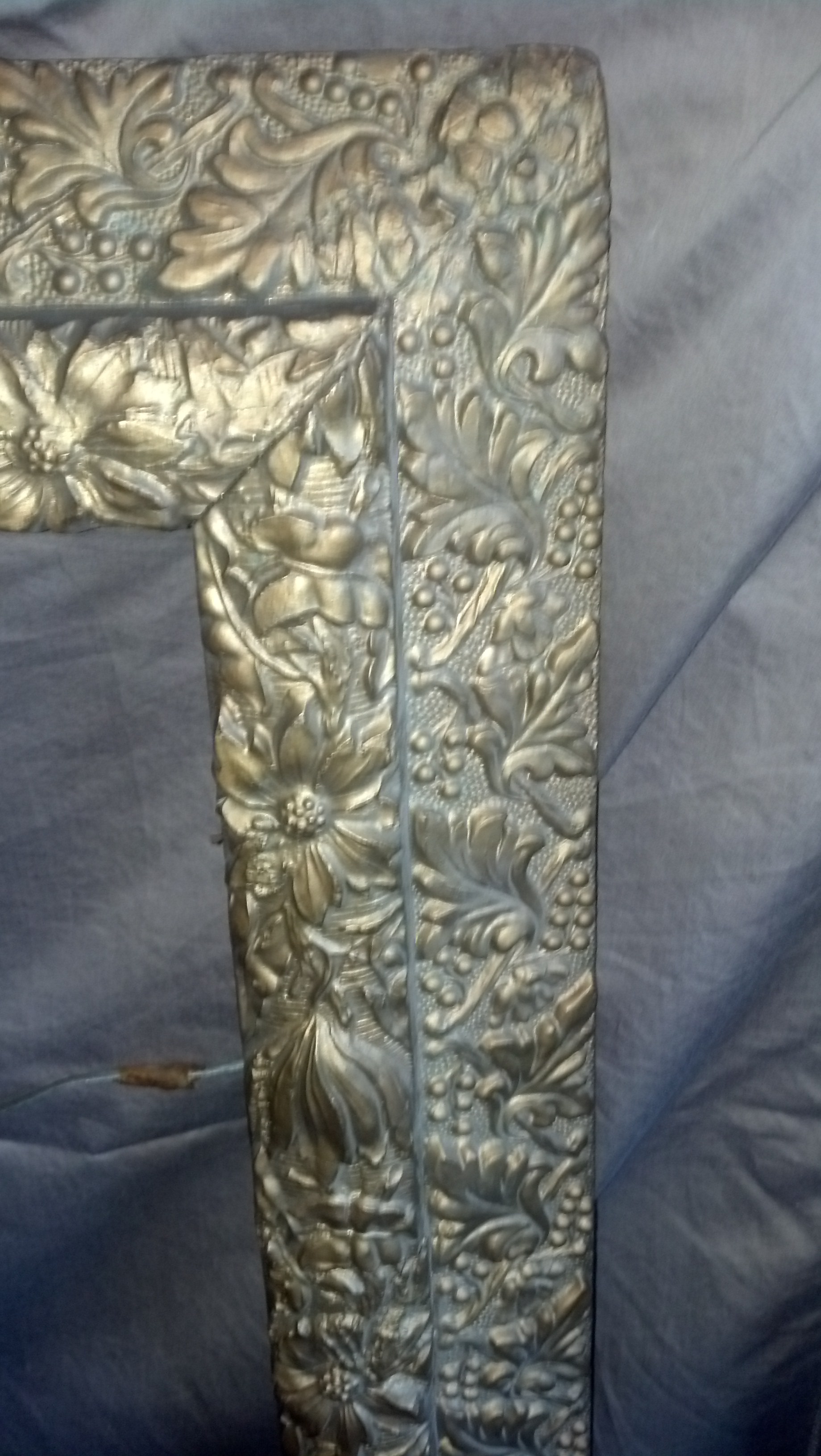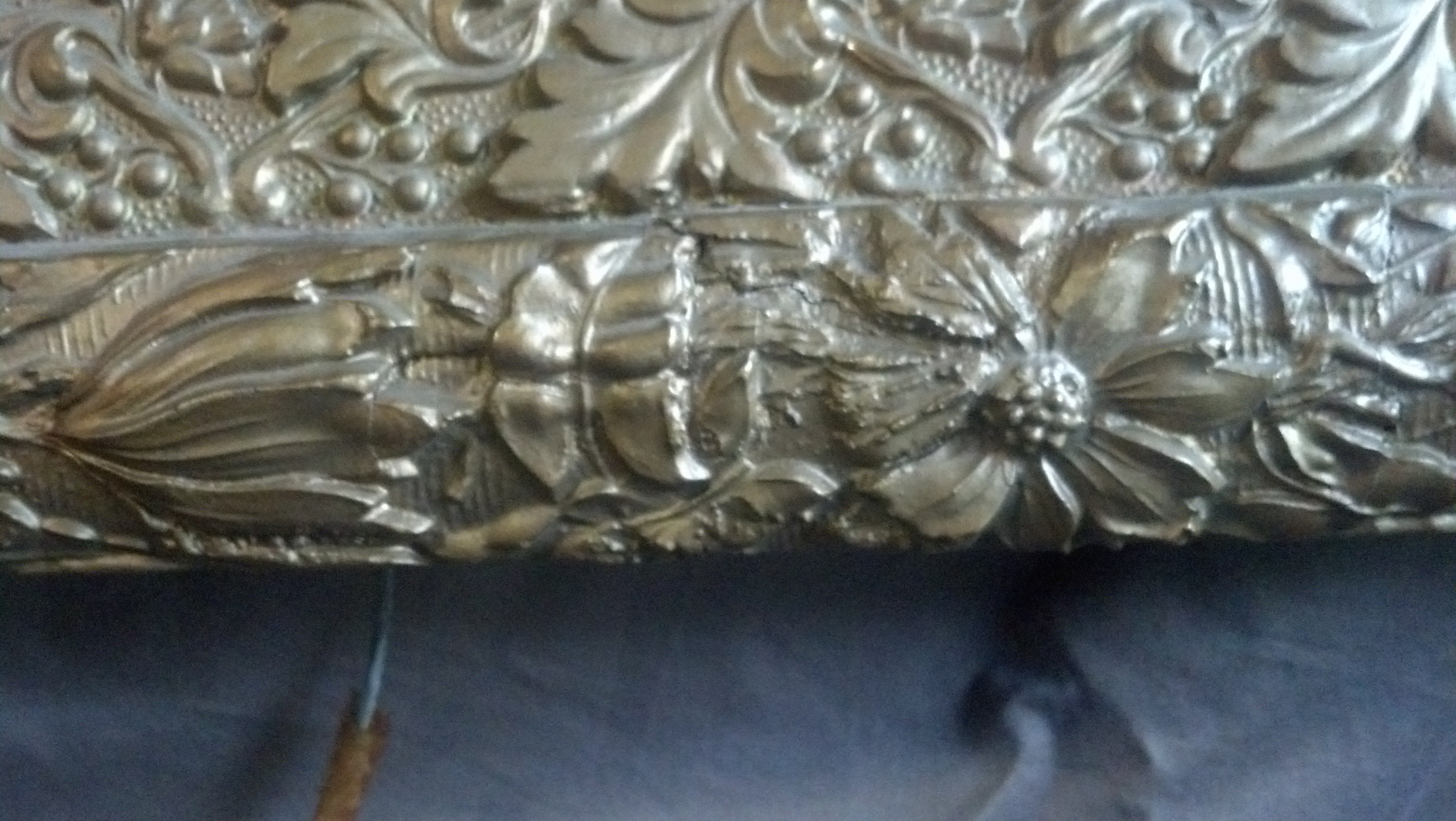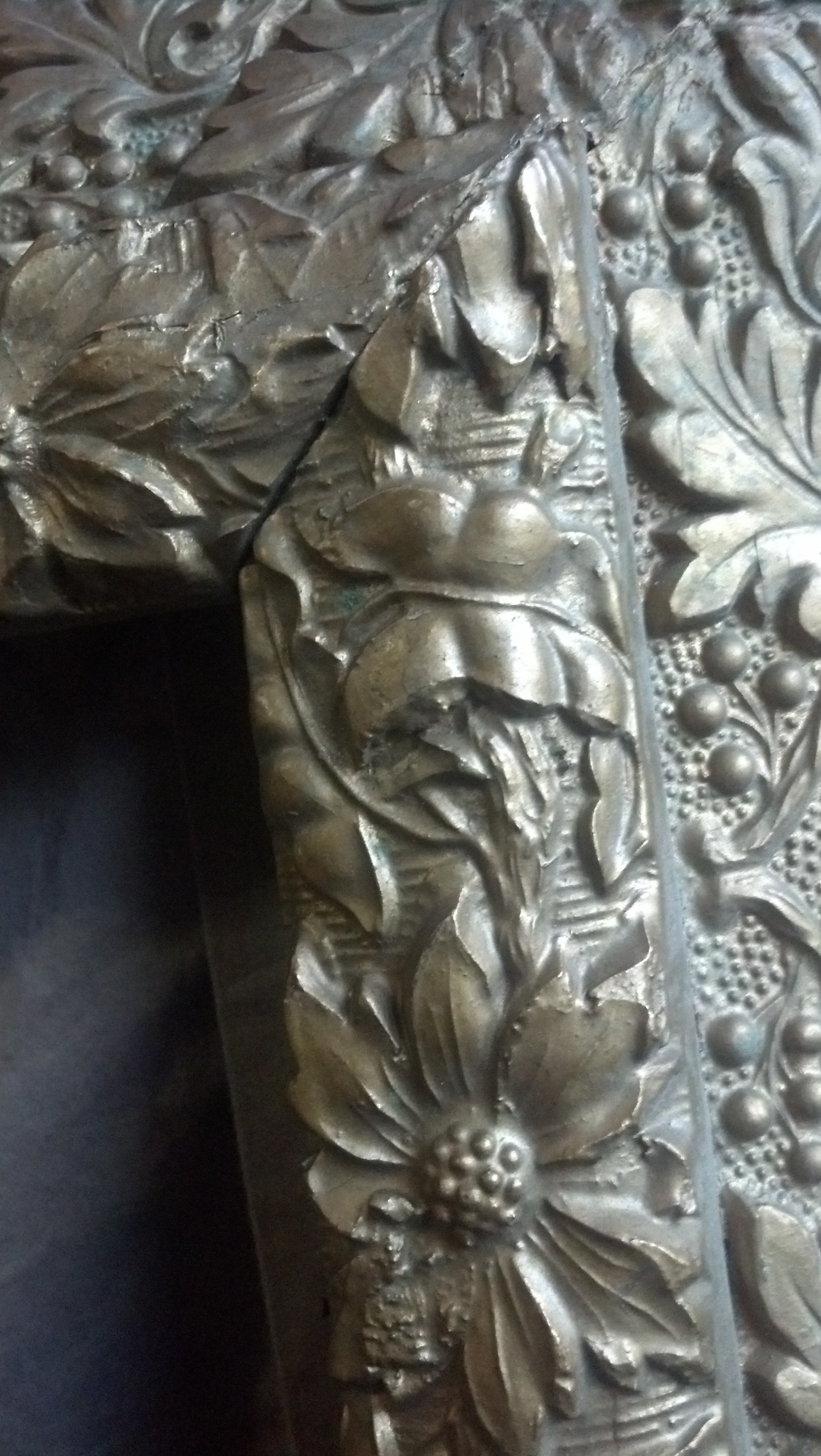 pretty certain that the moldings from which the frame is constructed were hand carved, judging by the lack of uniformity of the countors between corresponding oak leaves for example that occur at the same points of the pattern used. hopefully the pictures provided show enough detail.
