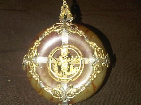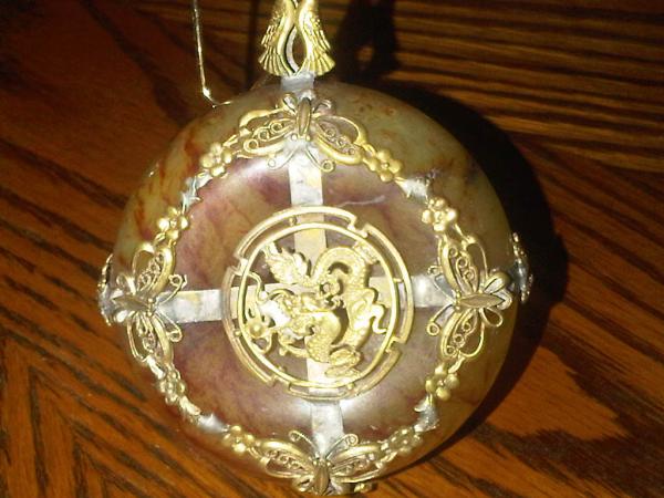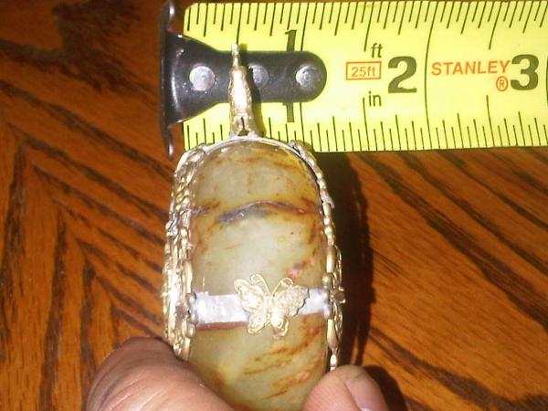 This is beatuiful peice of jade wrapped with gold designs. On one side it has a dragon and on the other it has a bird( I do beleive the bird is suppose to be a pheniox.)