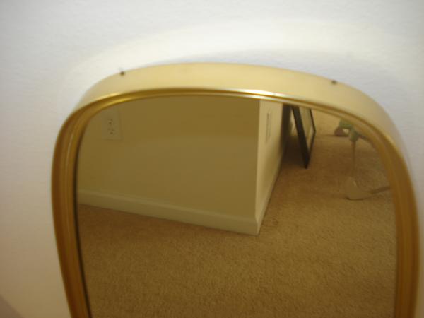 It is a long gold mirror. Very heavy. No marking anywhere. Very old rustic nails with wood on back. Twisted wire to make it hang on the wall.