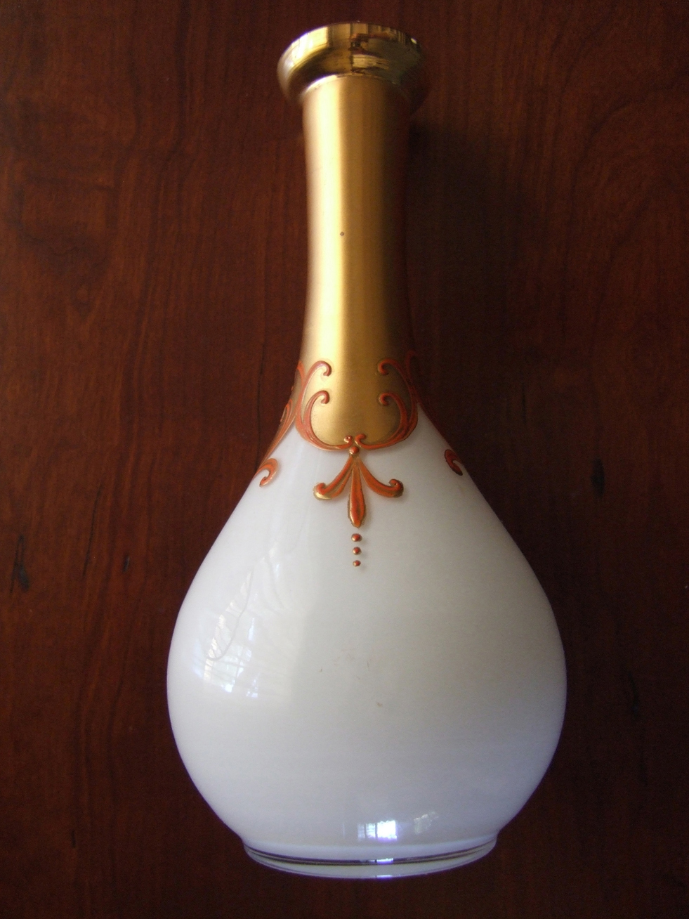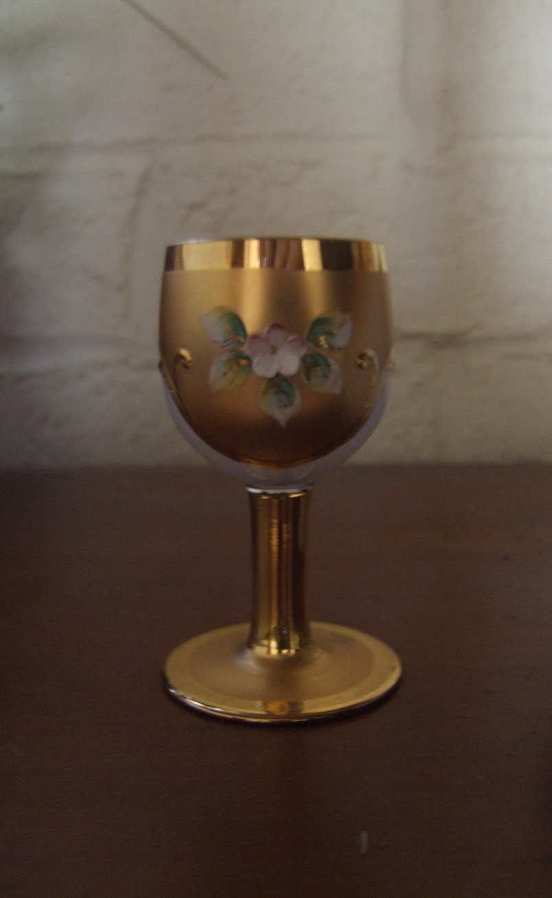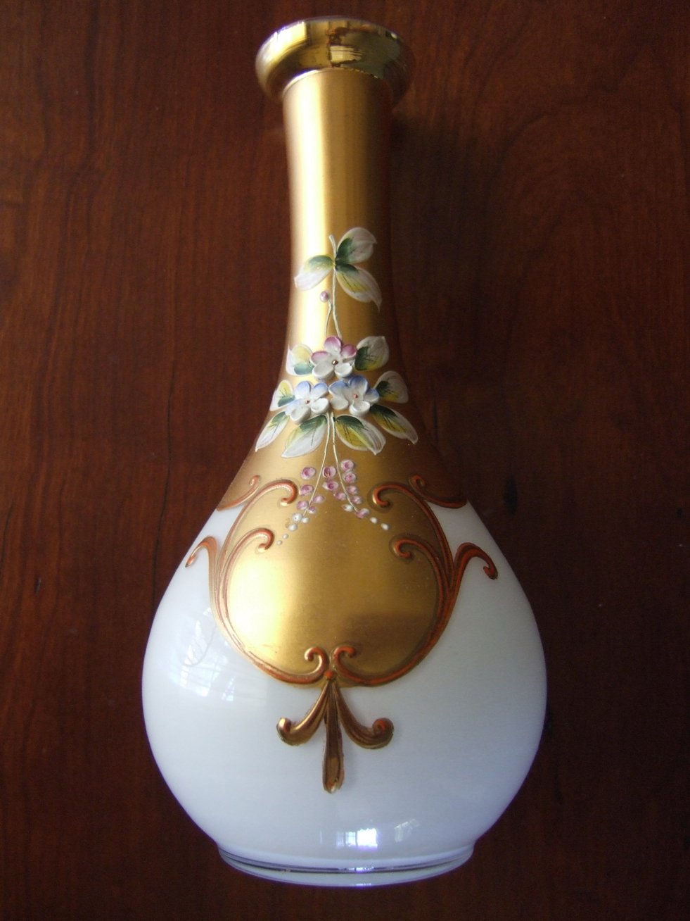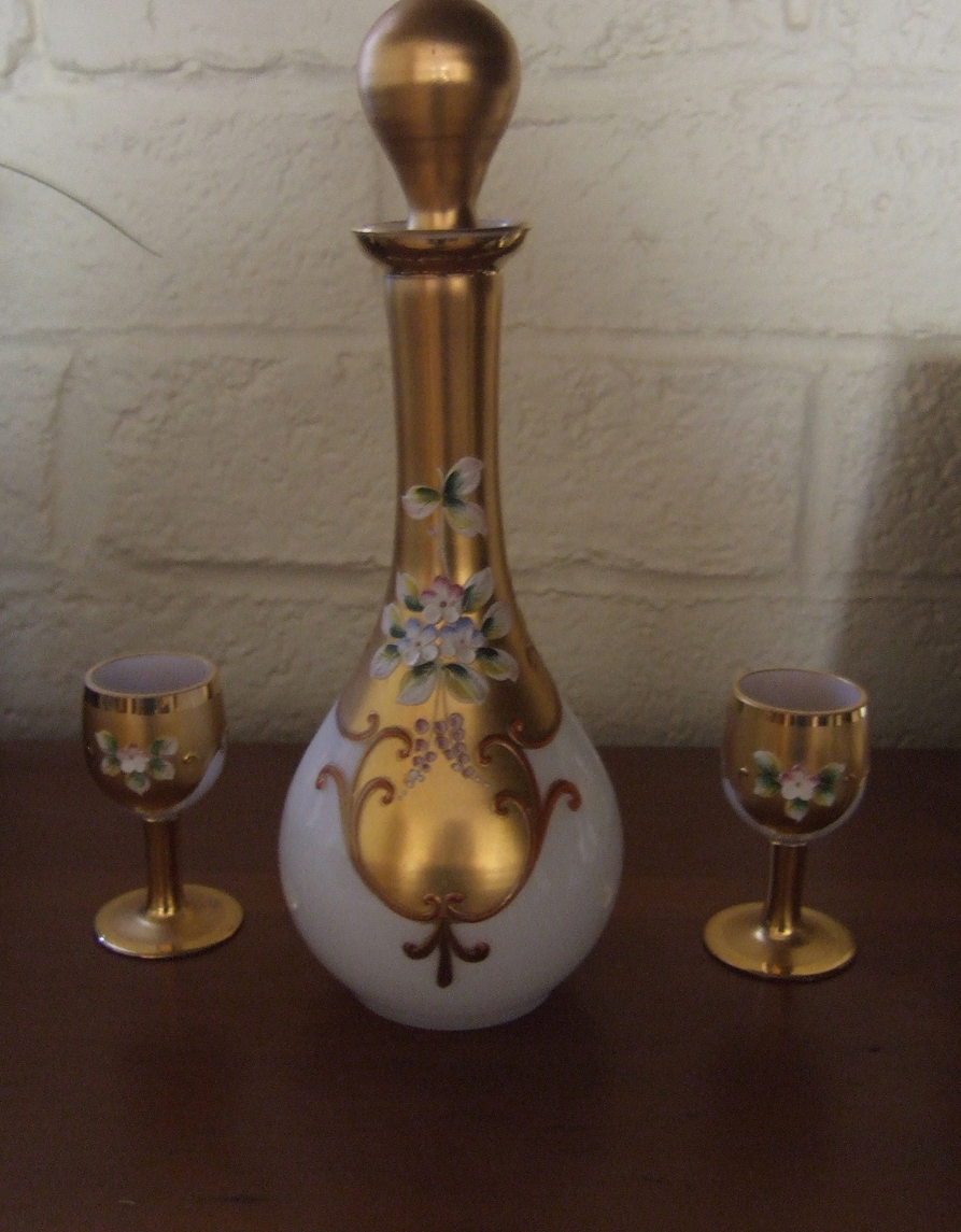 I have a Gold Painted Decanter with 2 glasses. The ornamental flowers are raised and almost feel like Paint but is raised off the glass. The petals of the flowers are definately porcelain or something like it.