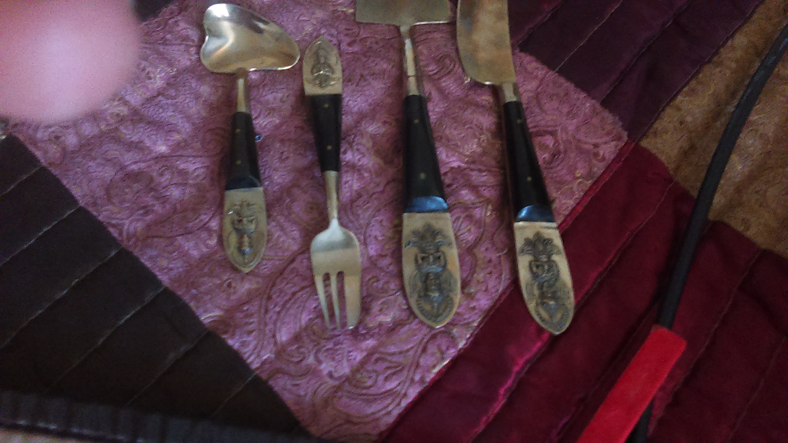 Antique looking with buddah or munk forks, spoons, pie slicer and a knife. 20 pcs.