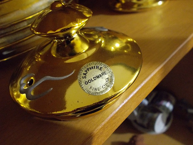 The teapot has a paper label "Sapphire Goldware Fine China"