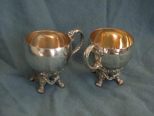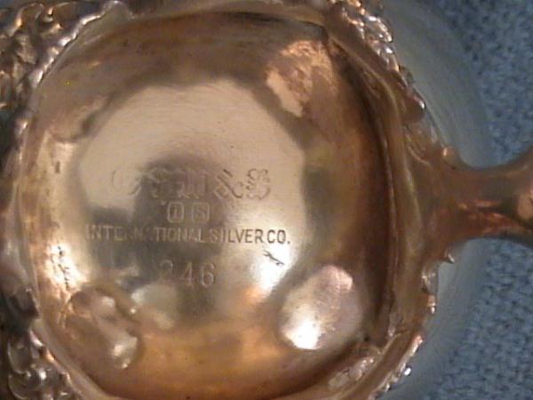 Engraved tray and punch bowl looks to have the pattern of Wild Rose Old. Tray has the number 274 on it. Punch bowl has feet and a lip with 'scroll work' with the Wild Rose Old pattern, #245; has feet. Cups have #246 on them and also designed with Wild Rose Old; they have feet as well. There is a ladle, has 'Vintage' engraved on the back, but the engraving definitely looks more like the grapes and vine of the Vintage pattern; pierced handle. I believe I found that piece on 'Replacements.com' for $200. It doesn't have the EGW&S symbols etched on the underside, like the rest of the pieces. This set, plus a chafing dish (I don't have extensive pictures of that yet) was part of a prize package when my mom was on The Price is Right show when it first started in the early 1960's (60-62) - - before Bob Barker :) Maybe the set is actually older than that, but this was when it was in our possession. I'd like to know dates and as much about it as is possible and it's value. Thanks! Jennifer M