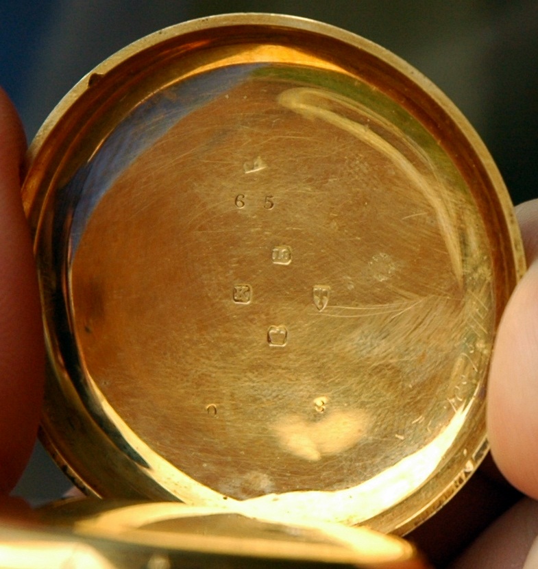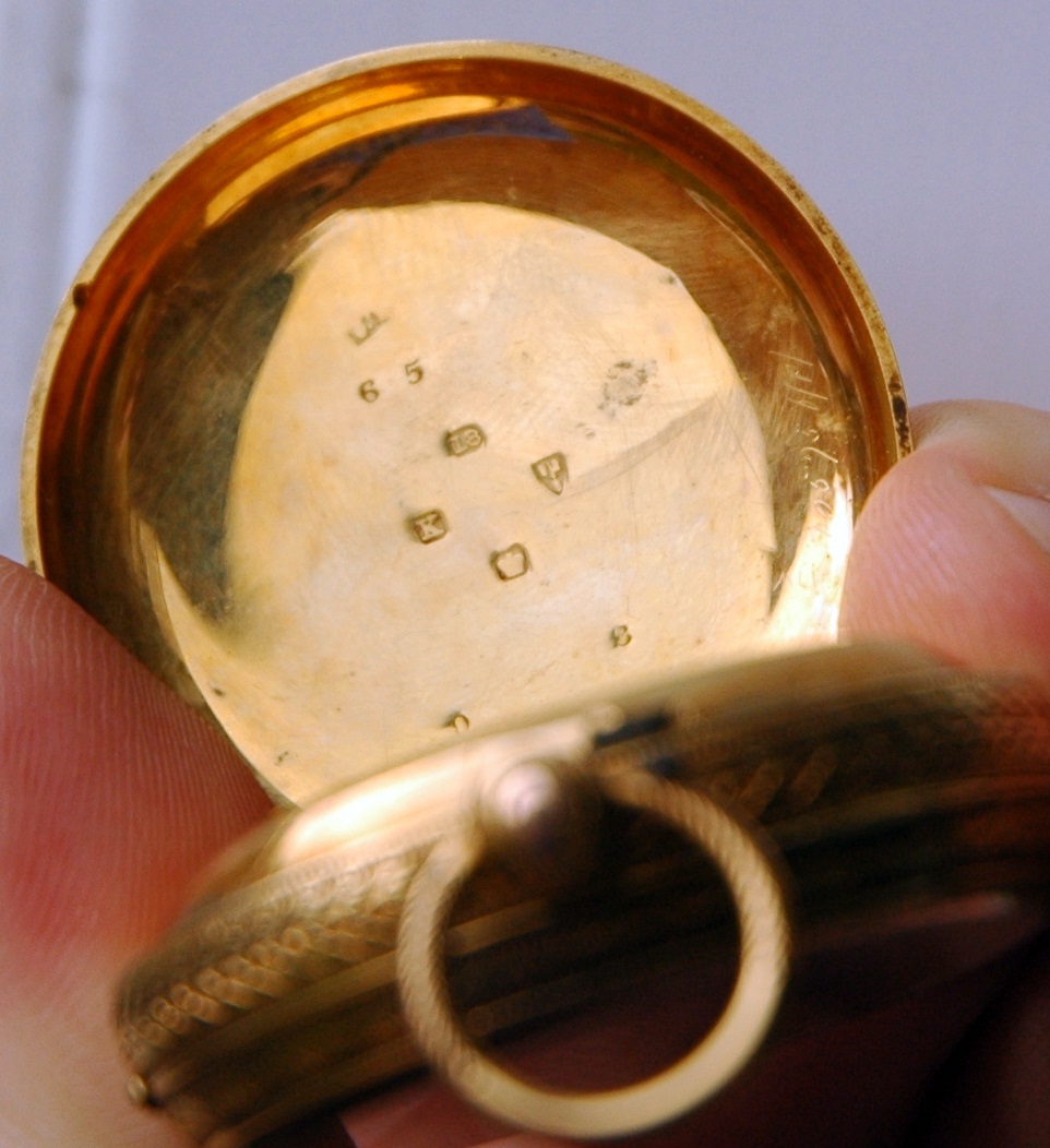 very ornate - 18, K 65 - 0 - 8 crown hallmark, another hallmark I cant identify & maybe the year letter that I cant really make out ( looks like a P though)